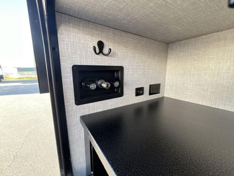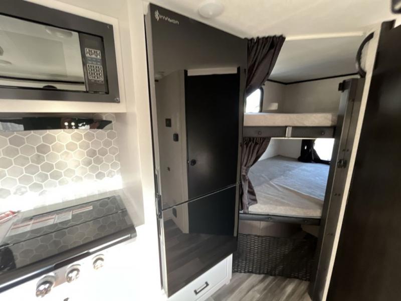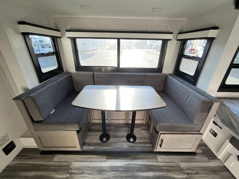Pack up the family and head to your local state park in this cozy travel trailer for eight. The little ones will love the double-size bunks, and the full bath is close by for convenience. There is a Murphy bed up front that you can fold up each morning to relax on the sofa. If you have any other guests, they can sleep on the U-shaped dinette within the slide out. This model includes a three burner cooktop and a microwave oven, plus an outside kitchen to give the chef a choice where to cook. The 15' power awning will provide shade while the meal is being made, and there is exterior storage for your camp chairs.