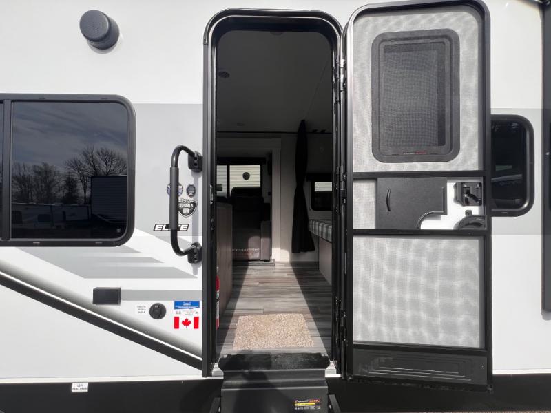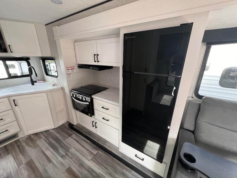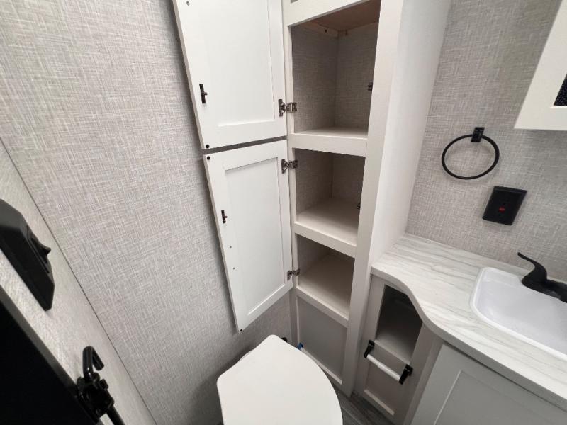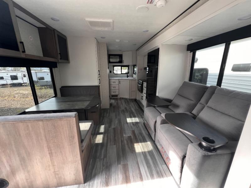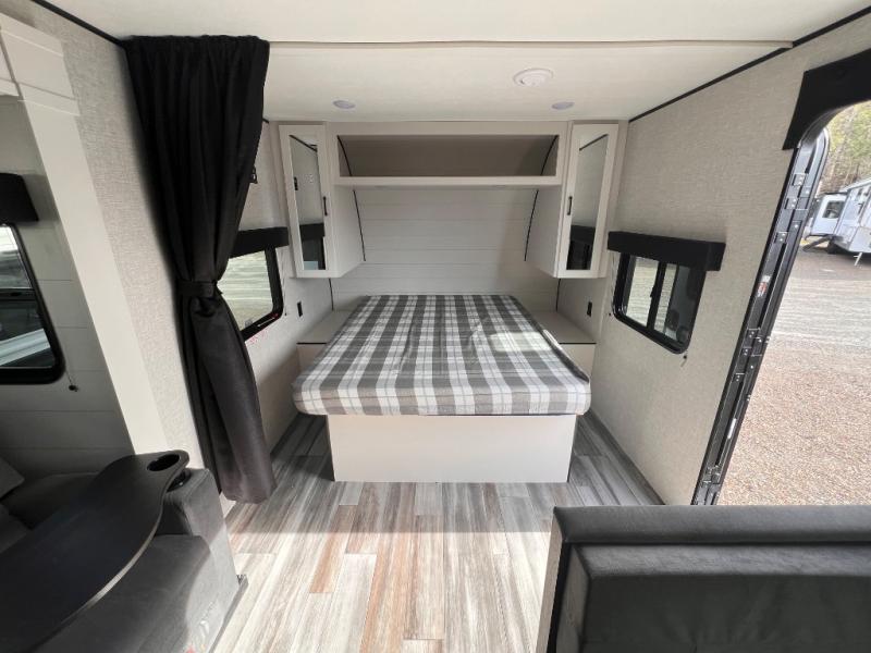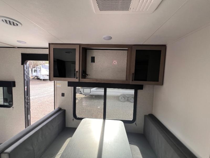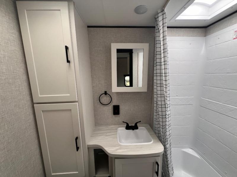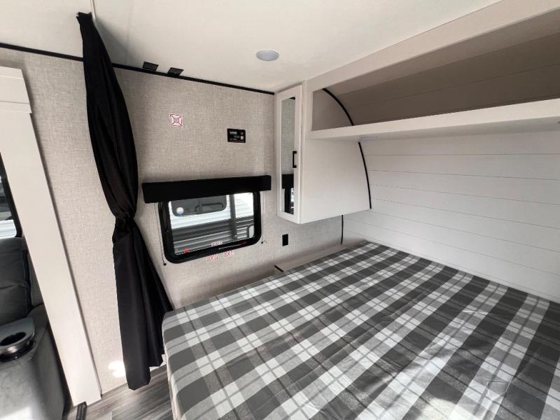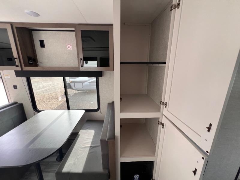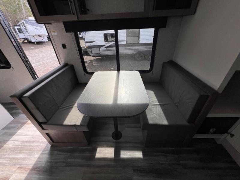 You will have a comfortable camping trip in this travel trailer! It offers full kitchen amenities including a pantry for snacks and such, plus a full rear corner bathroom for privacy and includes a shower. When you need a break, the semi-private bedroom up front offers a queen bed, dual wardrobes and a curtain to close, and the booth dinette can transform into a sleeping space as well. There is a 18' power awning with LED lights for you to enjoy this outdoor space into the night, plus exterior storage for your outdoor games and gear.