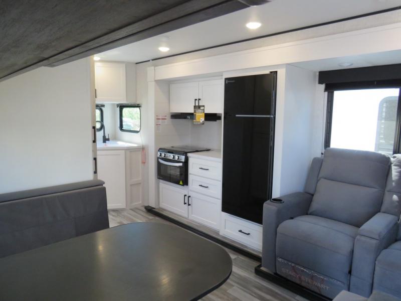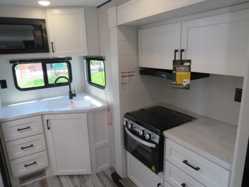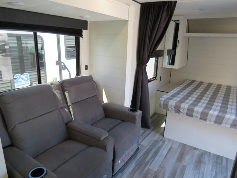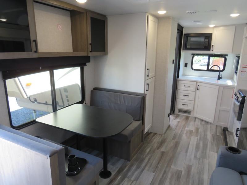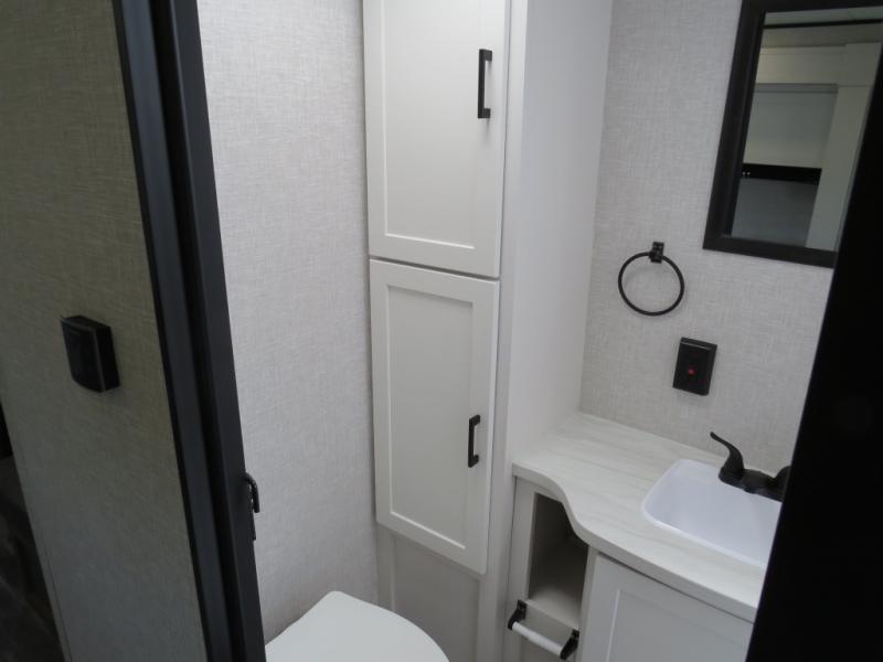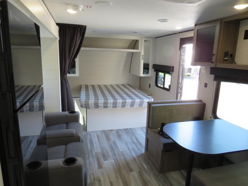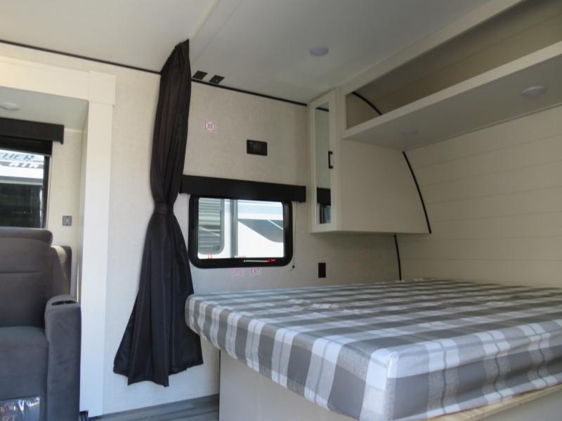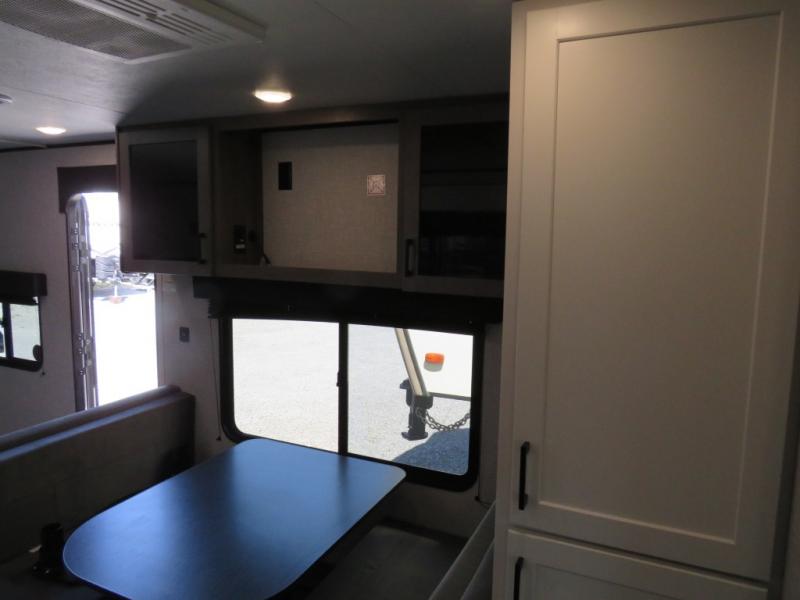 You will have a comfortable camping trip in this travel trailer! It offers full kitchen amenities including a pantry for snacks and such, plus a full rear corner bathroom for privacy and includes a shower. When you need a break, the semi-private bedroom up front offers a queen bed, dual wardrobes and a curtain to close, and the booth dinette can transform into a sleeping space as well. There is a 18' power awning with LED lights for you to enjoy this outdoor space into the night, plus exterior storage for your outdoor games and gear.