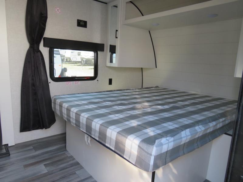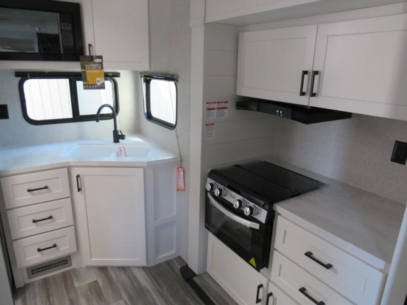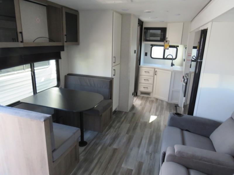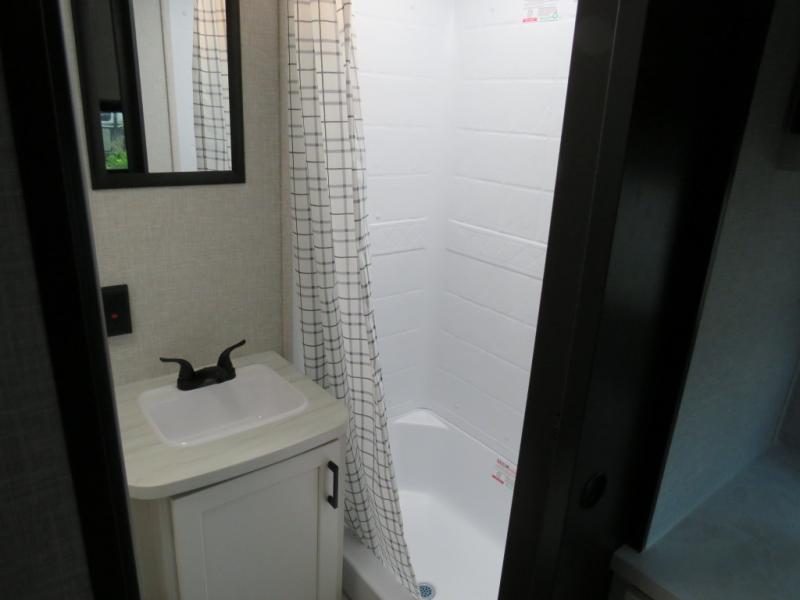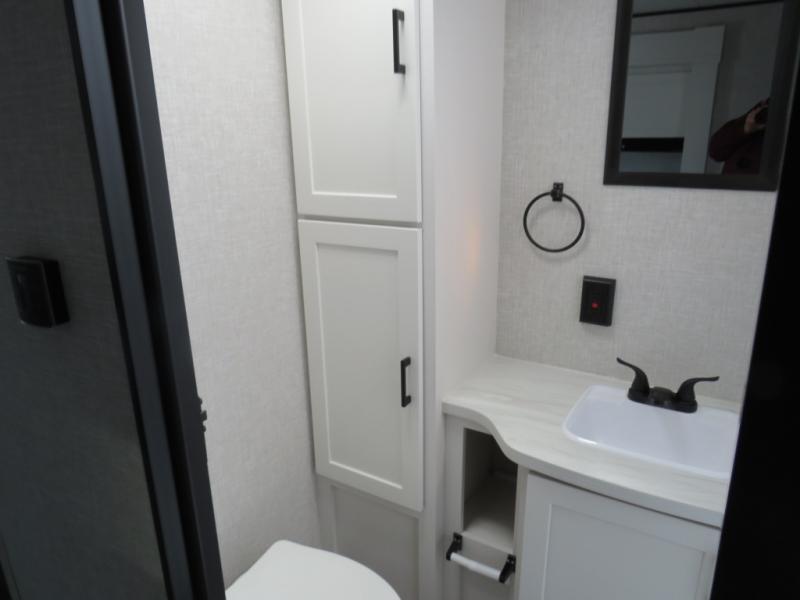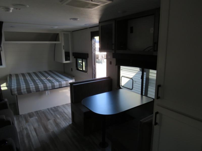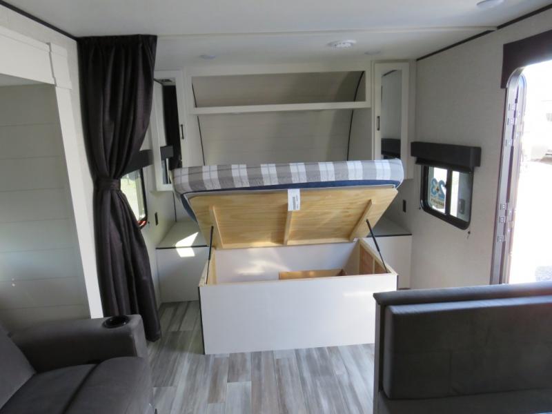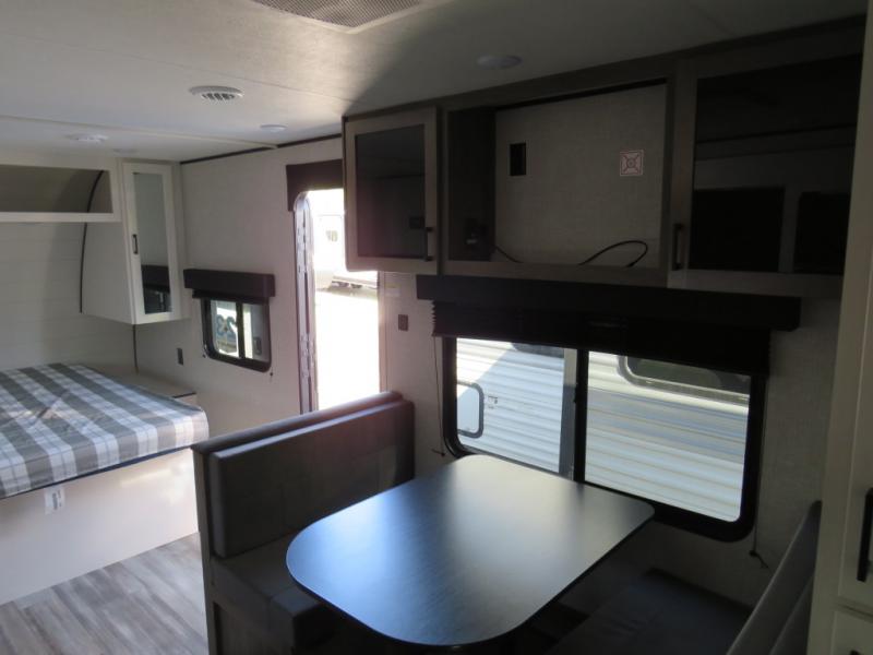 You will have a comfortable camping trip in this travel trailer! It offers full kitchen amenities including a pantry for snacks and such, plus a full rear corner bathroom for privacy and includes a shower. When you need a break, the semi-private bedroom up front offers a queen bed, dual wardrobes and a curtain to close, and the booth dinette can transform into a sleeping space as well. There is a 18' power awning with LED lights for you to enjoy this outdoor space into the night, plus exterior storage for your outdoor games and gear.