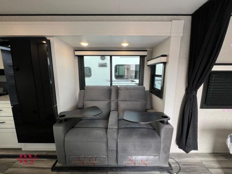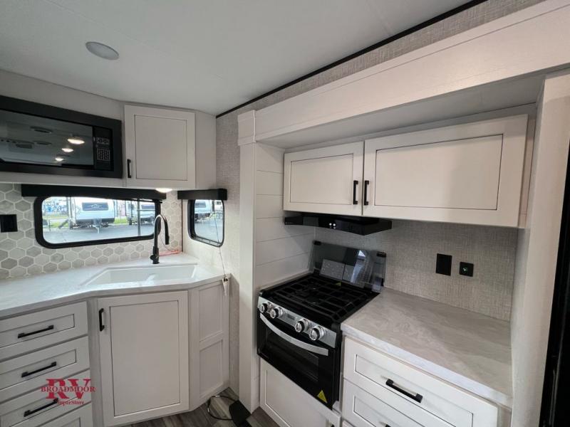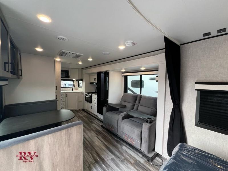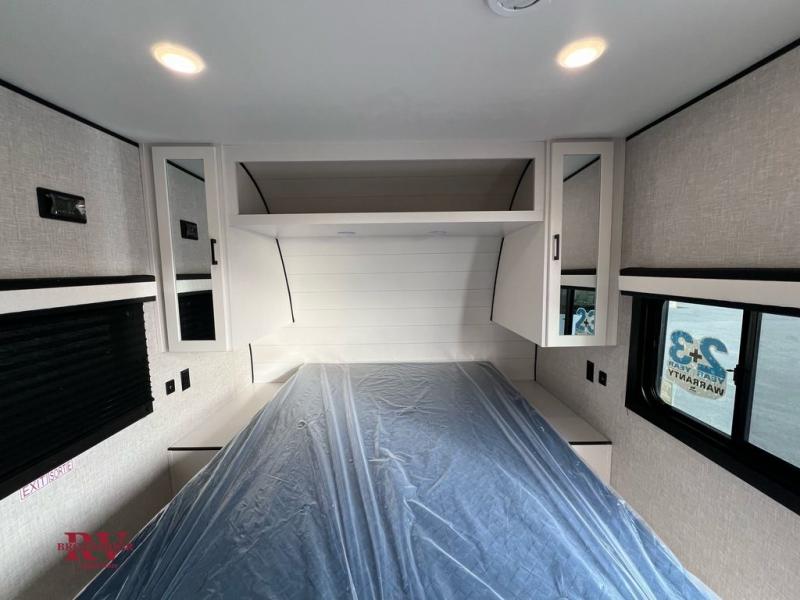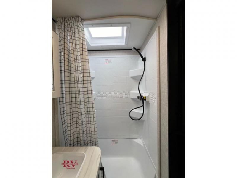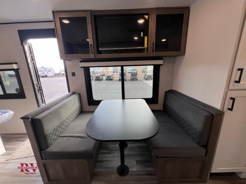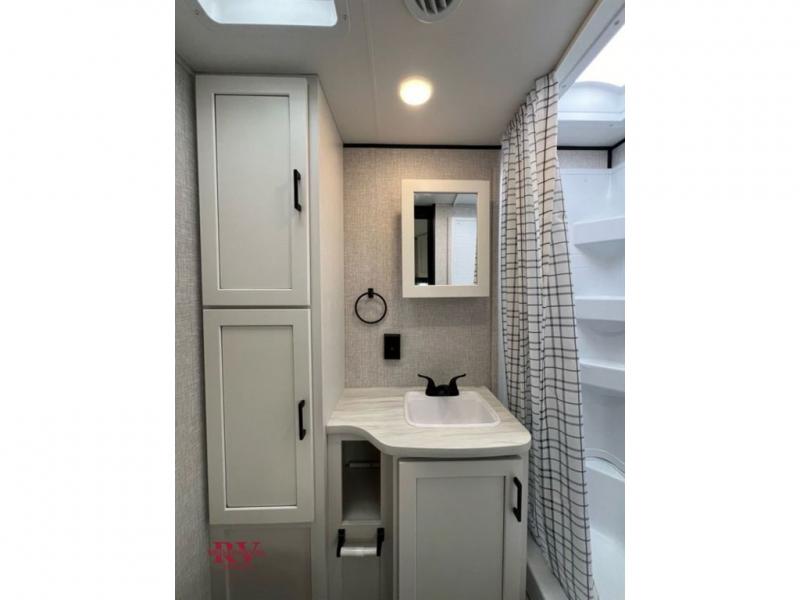 You will have a comfortable camping trip in this travel trailer! It offers full kitchen amenities including a pantry for snacks and such, plus a full rear corner bathroom for privacy and includes a shower. When you need a break, the semi-private bedroom up front offers a queen bed, dual wardrobes and a curtain to close, and the booth dinette can transform into a sleeping space as well. There is a 18' power awning with LED lights for you to enjoy this outdoor space into the night, plus exterior storage for your outdoor games and gear.