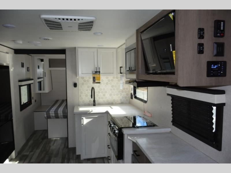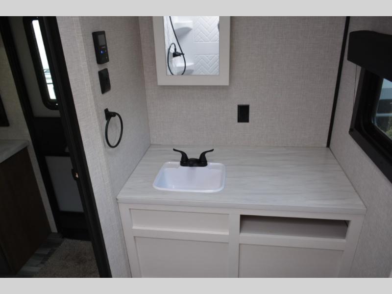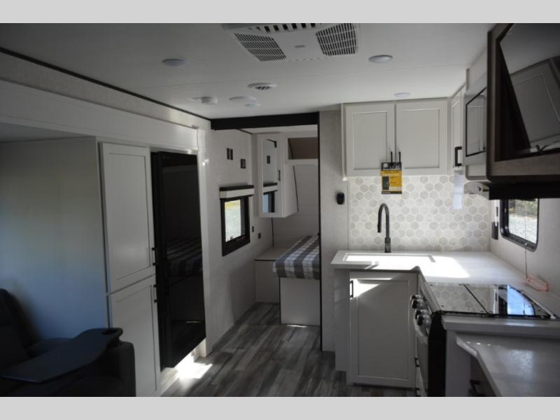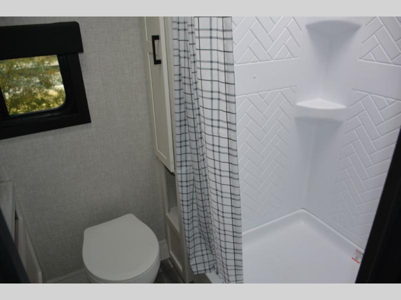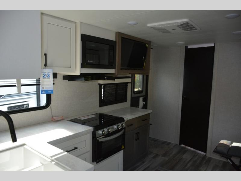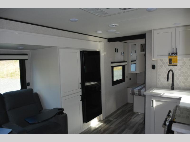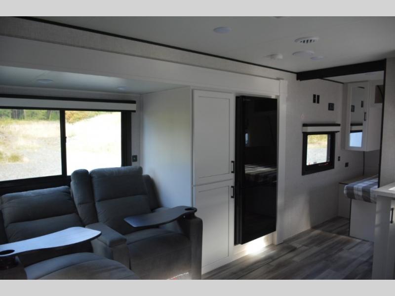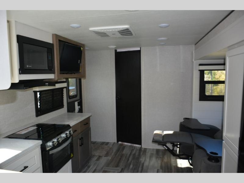 You will feel right at home in this travel trailer! It features a front private bedroom with a 60" x 75" queen bed that has wardrobes on either side and a shelf above to set your books. The kitchen has everything you will need to prepare a delicious home cooked meal including a large pantry to store your favorite snacks. The theater seats are directly across from the entertainment center and can also be switched out for an optional tri-fold sofa and you can choose to add an optional LED Smart TV as well. The full rear bathroom has an abundance of room for you to walk around as you get ready each morning. You can grab a jacket on those crisp mornings and head to the outdoor griddle with LP Quick Connect to make pancakes!