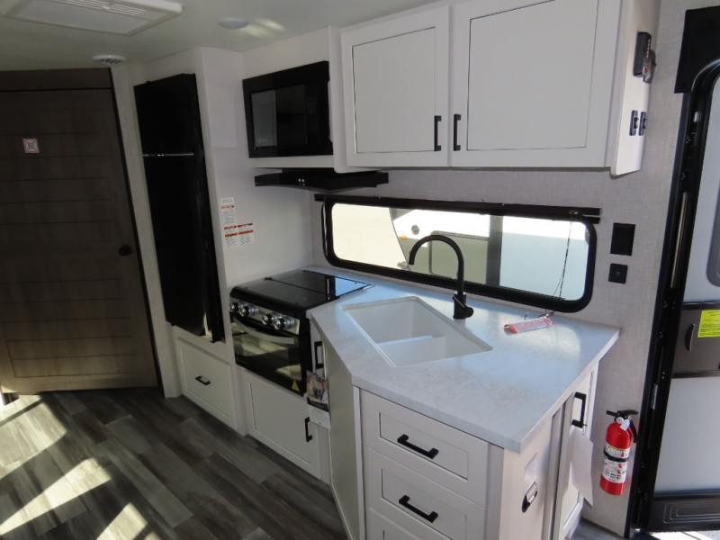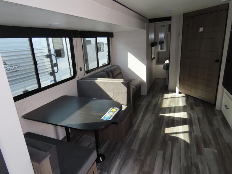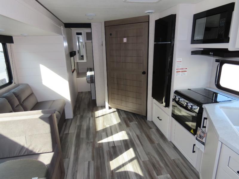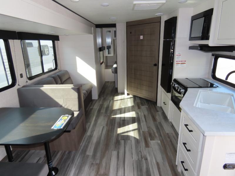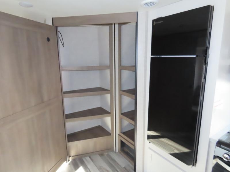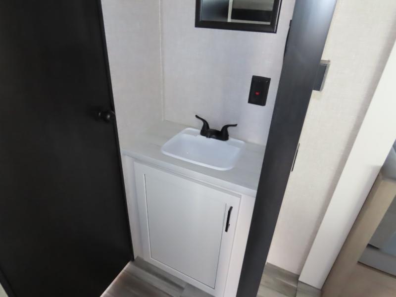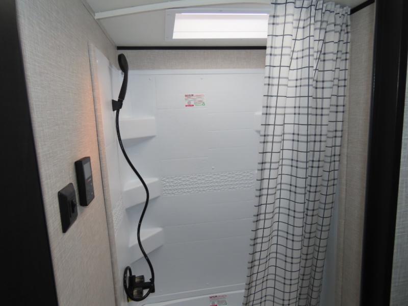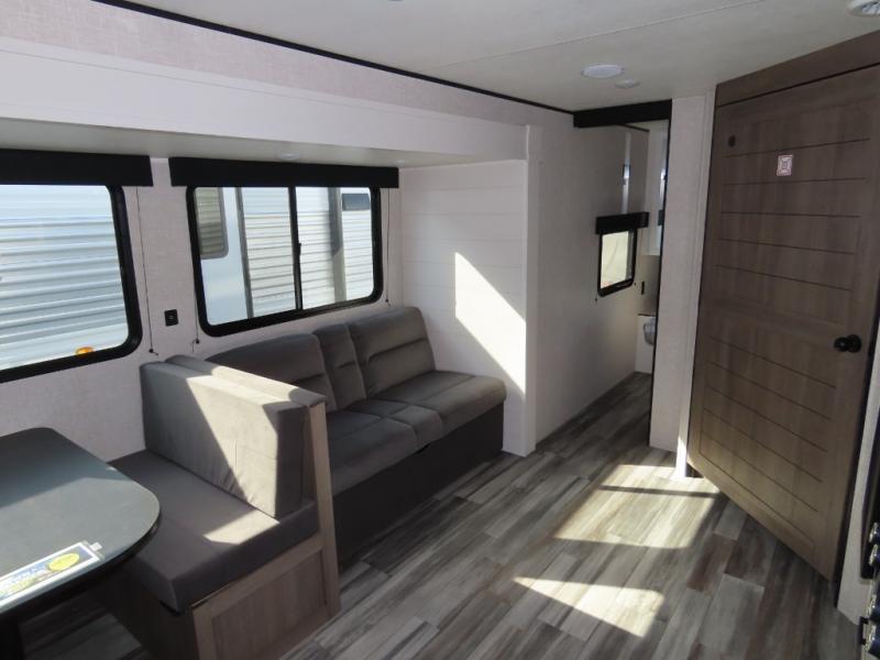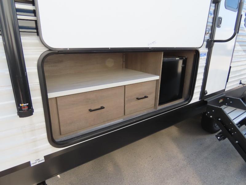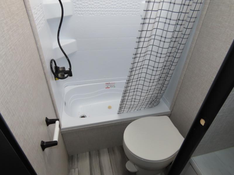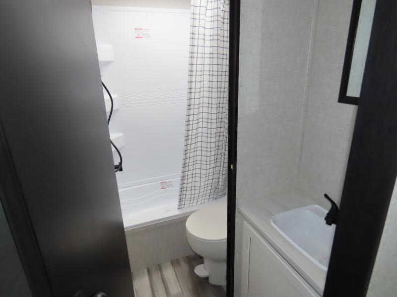 You will appreciate having dual entry doors with this travel trailer! One of the entrances leads directly into the front private bedroom with a 60" x 75" queen bed that has wardrobes on either side. The other entrance leads into the living/kitchen area which has theater seating conveniently across from the entertainment center, but it can be switched out for an optional hide-a-bed sofa if you want more guests to come along. There is also a booth dinette, a three burner cooktop, and a 12V refrigerator. You could even enjoy a cold beverage outside with the outside refrigerator. The full rear bathroom has plenty of space for you to walk around as you get ready after taking a hot shower in the tub/shower!