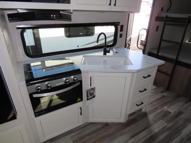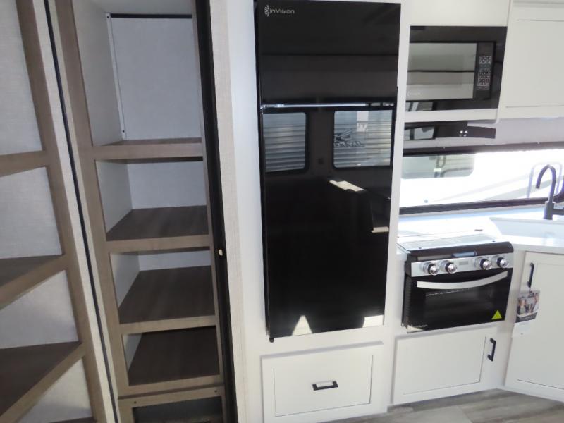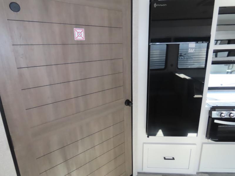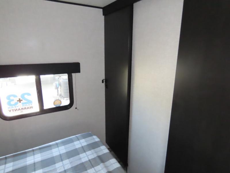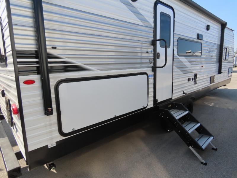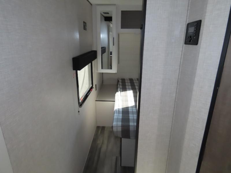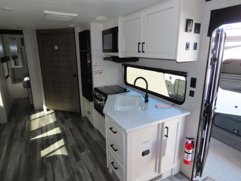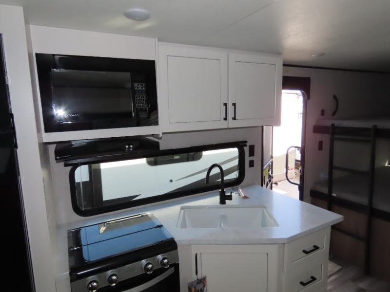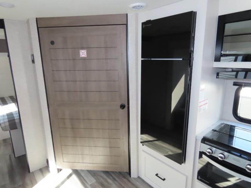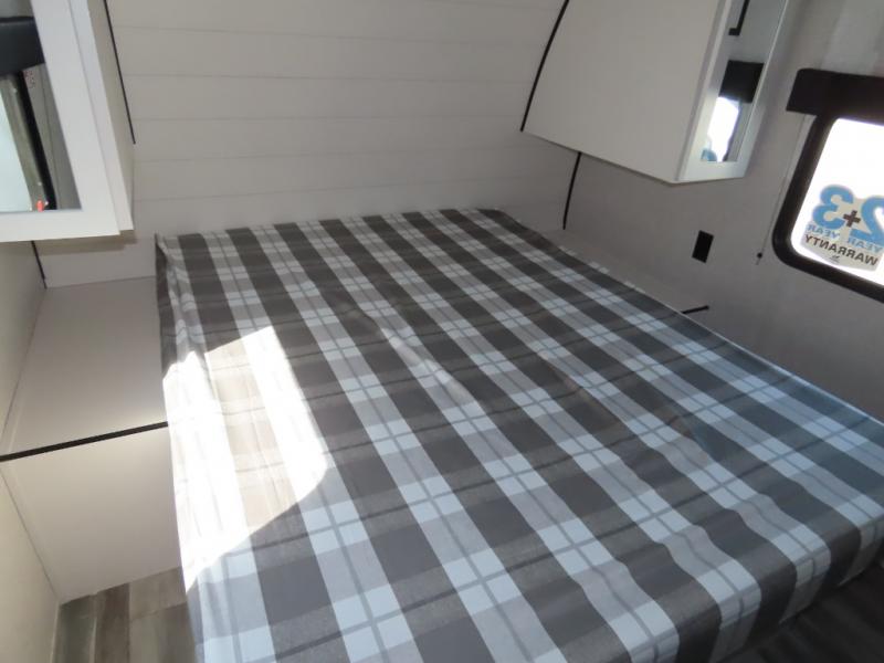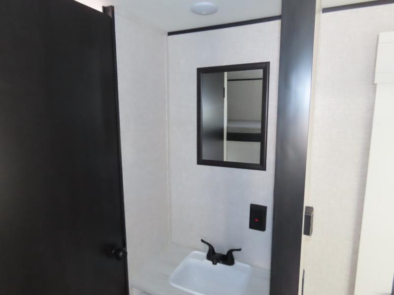 You will appreciate having dual entry doors with this travel trailer! One of the entrances leads directly into the front private bedroom with a 60" x 75" queen bed that has wardrobes on either side. The other entrance leads into the living/kitchen area which has theater seating conveniently across from the entertainment center, but it can be switched out for an optional hide-a-bed sofa if you want more guests to come along. There is also a booth dinette, a three burner cooktop, and a 12V refrigerator. You could even enjoy a cold beverage outside with the outside refrigerator. The full rear bathroom has plenty of space for you to walk around as you get ready after taking a hot shower in the tub/shower!