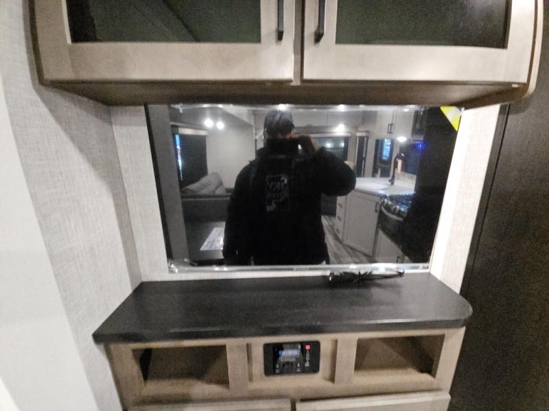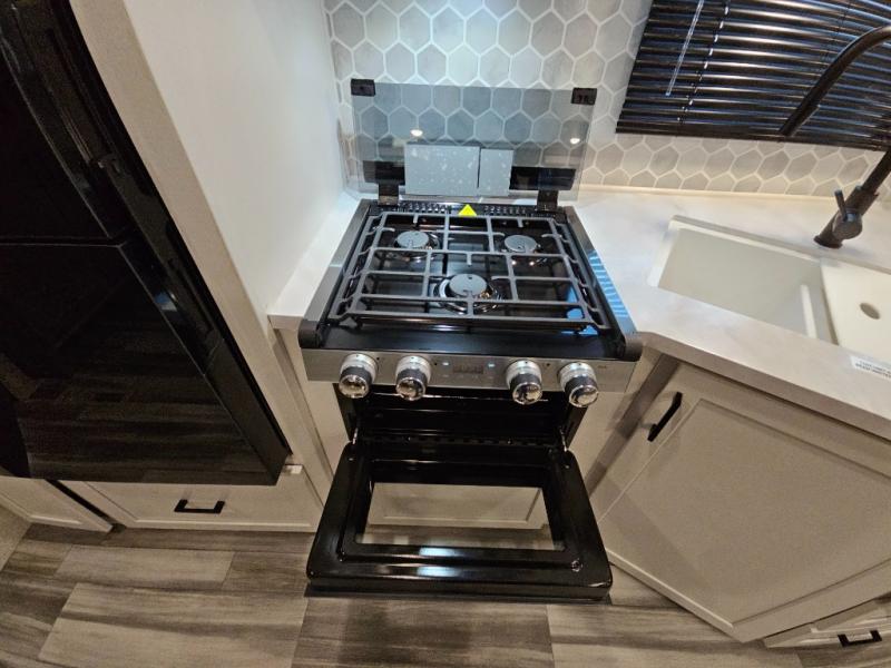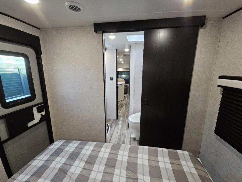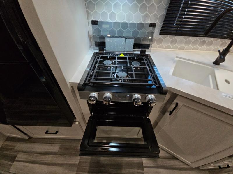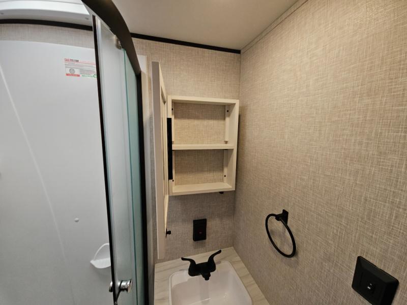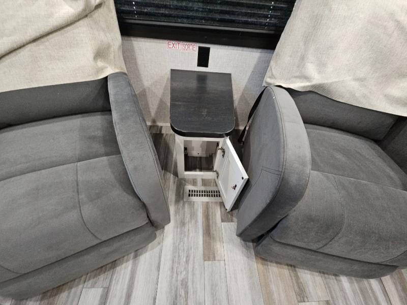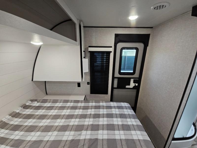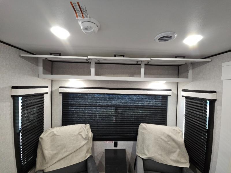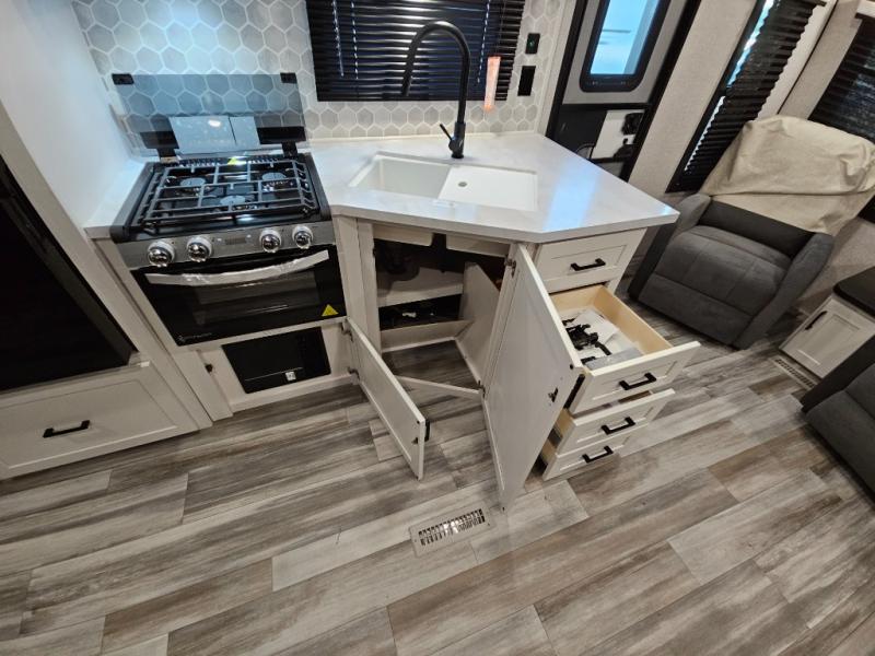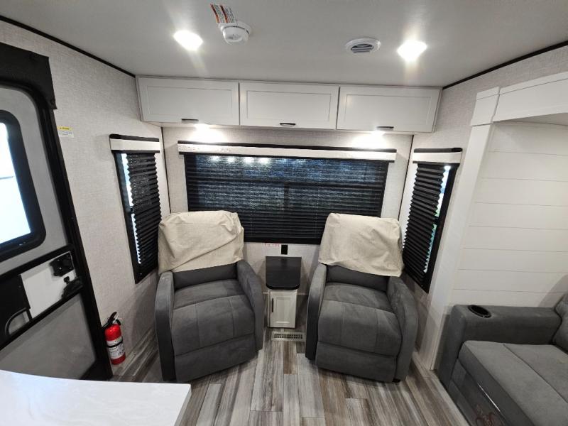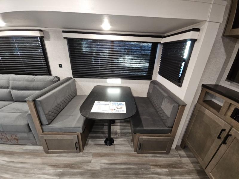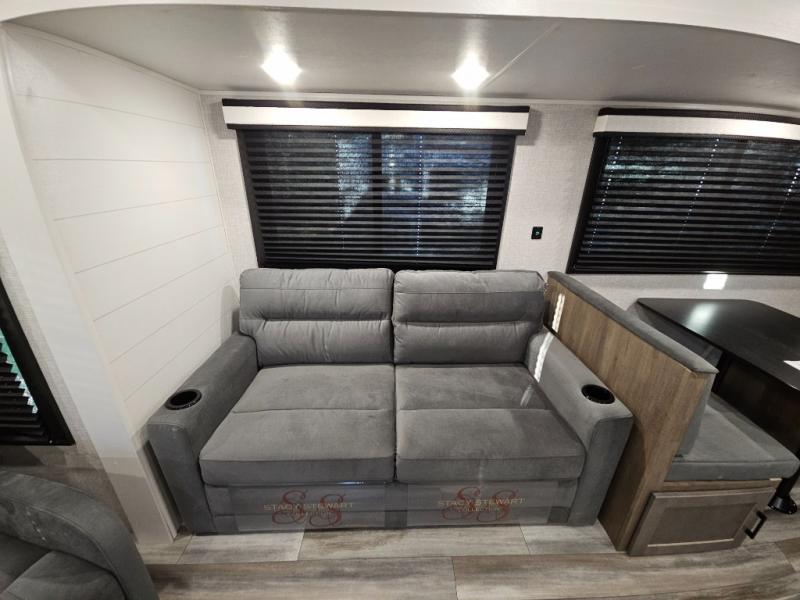 When you want to travel and see new places, this trailer gives you the flexibility to sleep two to four, plus offers a full walk-through bathroom with access from the main area and the front private bedroom. You will also appreciate having a second entry/exit door in the bedroom, a walk-around queen bed, plus dual wardrobes giving you your own side of the bed. The bathroom also has a radius shower and linen storage. The kitchen includes full amenities to make your own meals, and a pantry to keep your dry goods and snacks. You will love the rear dual lounge chairs with table in between to place your drinks, and the jackknife sofa plus booth dinette offer more seating, sleeping space, and extra floor space since they are within a slide.