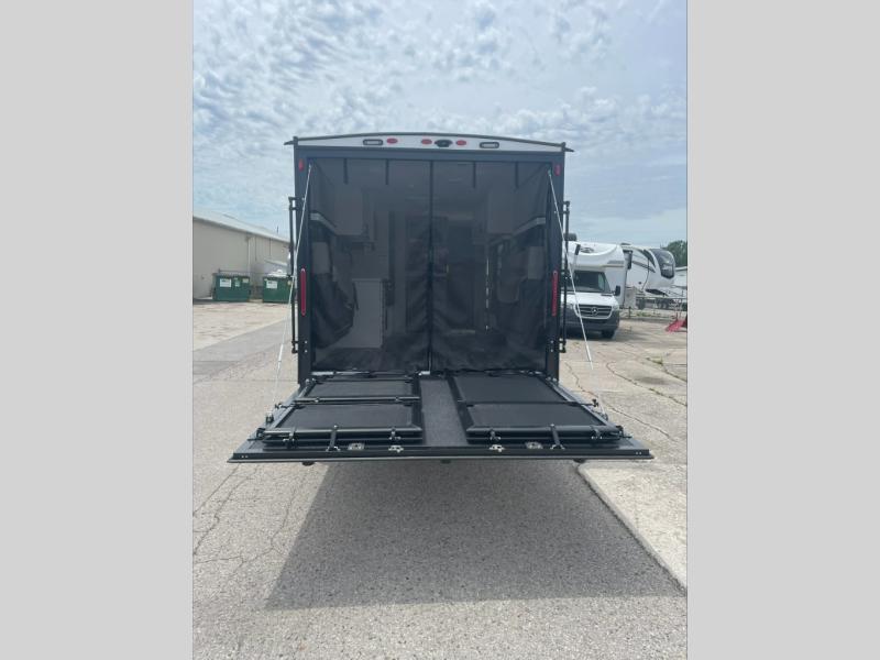 When you are ready to ride your off-road toys, relax in the great outdoors and unwind after a ride and do it all over again the next day, then load up and head to the campsite! You will have 5' 11" of cargo space plus a little more space in between the kitchen amenities and the flip-up bar top with stools to load more gear and such. The 7'3" opening and 7' ramp door makes unloading easy as well. The convertible sofas and removable table allow more to dine, and the double entry bathroom will keep everyone clean before bedtime. The front bedroom offers privacy for the owners, and comfortable nights on a queen bed. And the power awning offers shade during the daytime when you want to relax outside.
