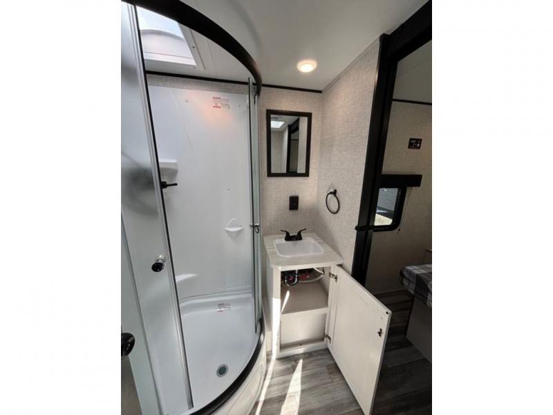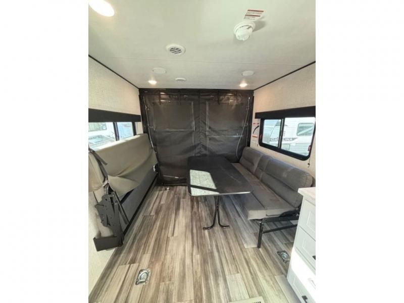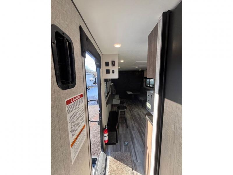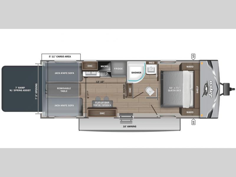 When you are ready to ride your off-road toys, relax in the great outdoors and unwind after a ride and do it all over again the next day, then load up and head to the campsite! You will have 5' 11" of cargo space plus a little more space in between the kitchen amenities and the flip-up bar top with stools to load more gear and such. The 7'3" opening and 7' ramp door makes unloading easy as well. The convertible sofas and removable table allow more to dine, and the double entry bathroom will keep everyone clean before bedtime. The front bedroom offers privacy for the owners, and comfortable nights on a queen bed. And the power awning offers shade during the daytime when you want to relax outside.