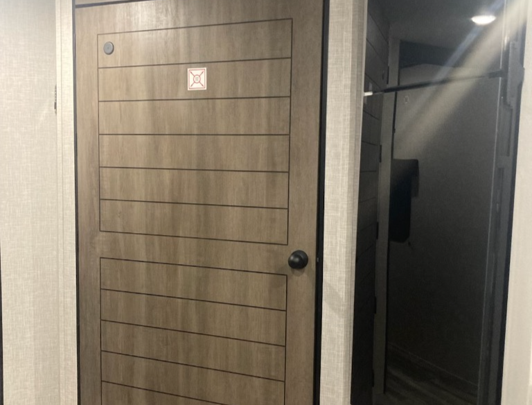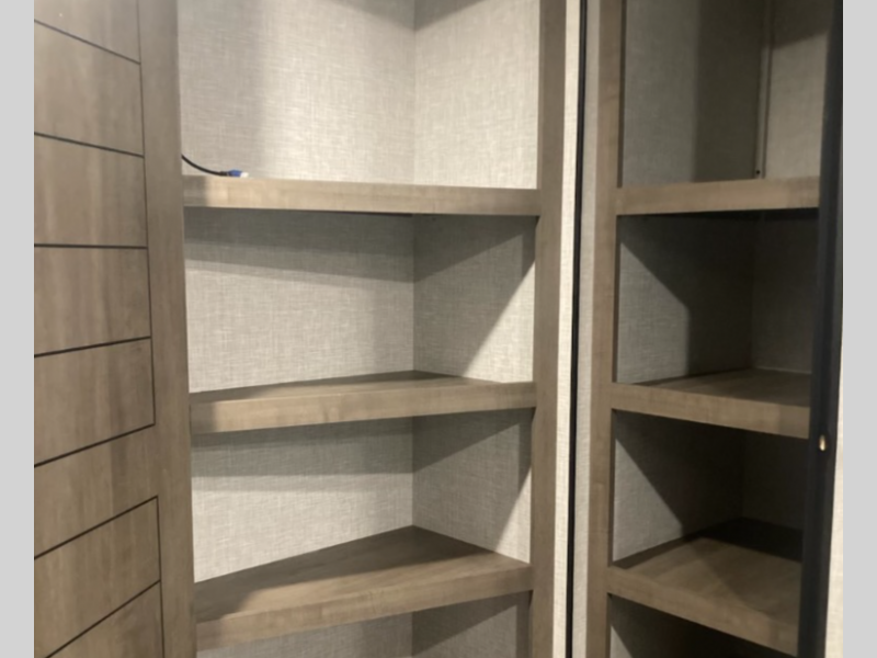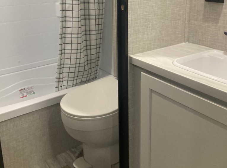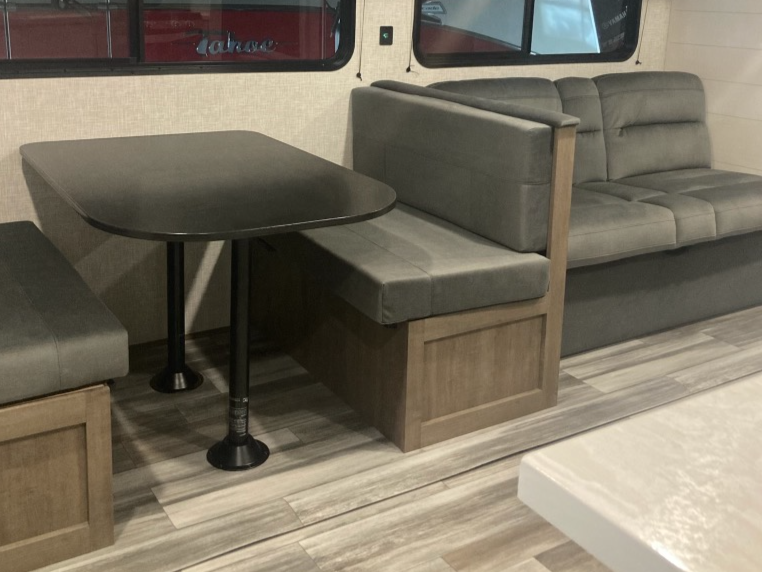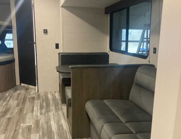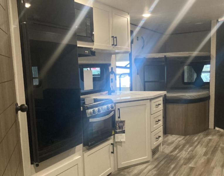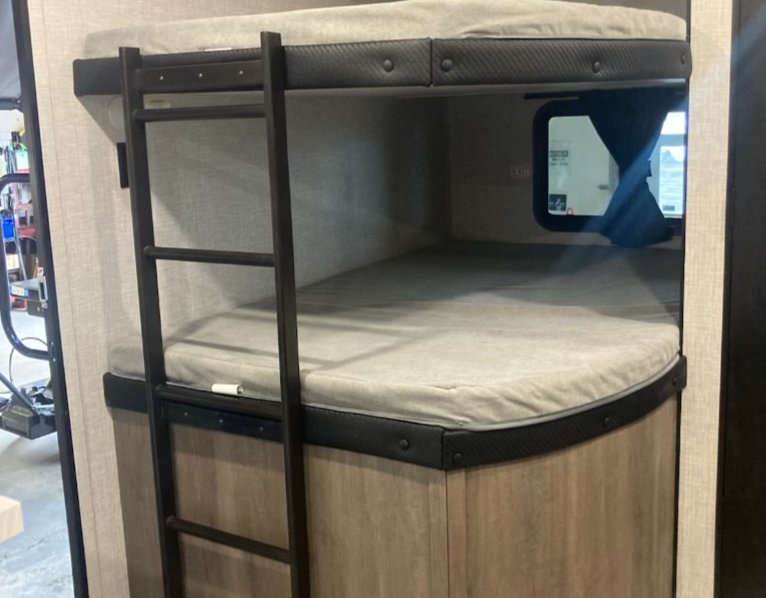 A larger family or group of friends can enjoy camping together in this trailer thanks to the booth dinette and jackknife sofa slide providing more interior floor space and a place for two or maybe more to sleep at night. And the double-size bunks are a fun place to sleep when you need four more spots, plus the privacy curtain will come in handy. The private toilet and tub/shower will keep everyone refreshed and the bathroom sink is just outside the door allowing two people to get ready at one time. The front bedroom offers the owners privacy and there is dual access, two wardrobes and a queen bed to enjoy. The cook will find full amenities indoor, plus there is an outside pull-out griddle, refrigerator, and spray port when you want to cook in the fresh air!