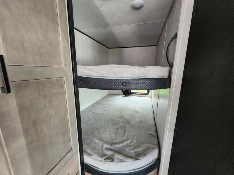Loads of fun like hiking, fishing, and playing outdoor camping games are waiting for you to make that reservation, hitch up and head out! This trailer allows the owners to sleep in privacy behind the space saving sliding door on a 60" x 75" queen bed. And the kids or grandkids can sleep on the double-size bunks in the rear next to the full bathroom including a tub/shower. They even have a wardrobe nearby for their things. The slide out jackknife sofa and U-shaped dinette offers more floor space, a place to relax and dine, plus you can play games at the dinette. The kitchen includes full amenities at your fingertips, plus you all can enjoy the entertainment center with an LED Smart TV when inside. This model also includes an exterior pull-out griddle and a refrigerator to cook breakfast outdoors!