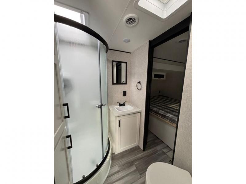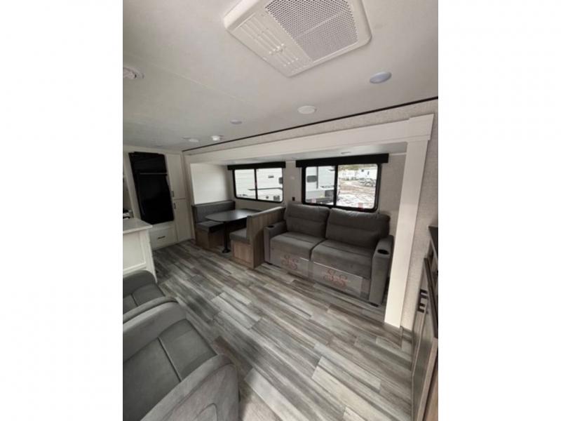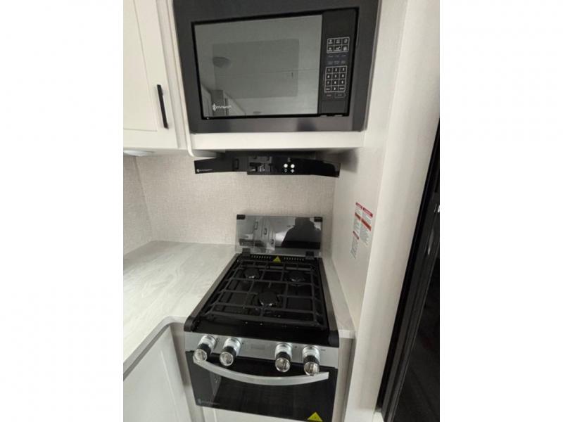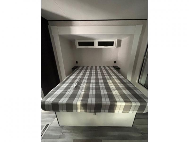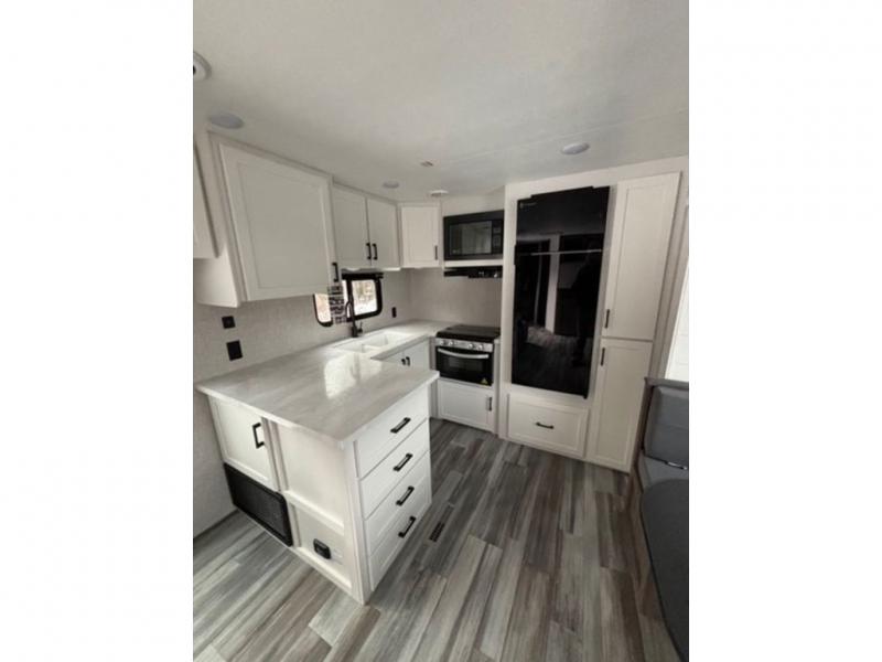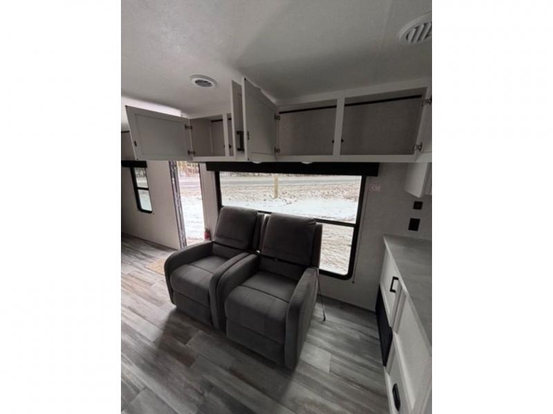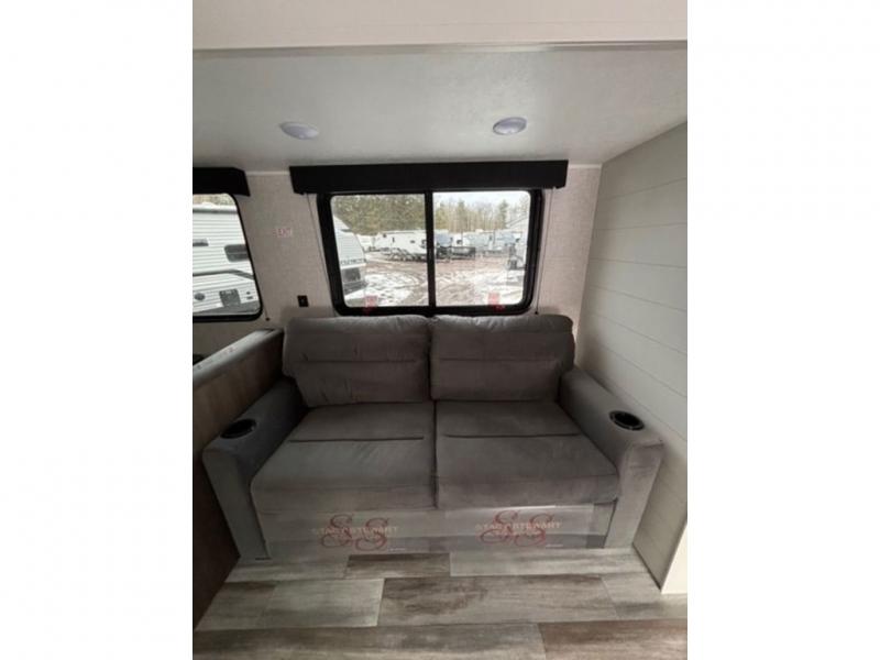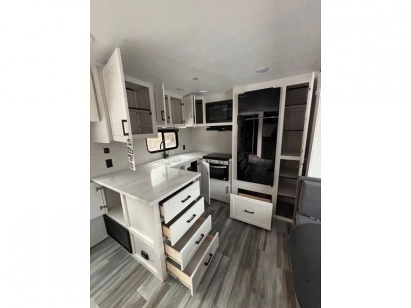 This rear kitchen travel trailer is perfect for your group of five to six! Once you arrive at the campground, you can unload the pass-thru storage, then set up the 18' power awning with LED lights. Head inside to make lunch on the three burner cooktop or in the microwave oven. There is a booth dinette where you can dine together, and you'll find additional seating space on the sofa and dual lounge chairs. Did we mention there is a large slide out for more floor space?! The dual entry bath includes a power vent, medicine cabinet, and a skylight for more natural lighting and extra head space. And don't overlook the front master bedroom with a queen bed slide out, a dresser and a wardrobe, plus additional storage with washer and dryer prep!