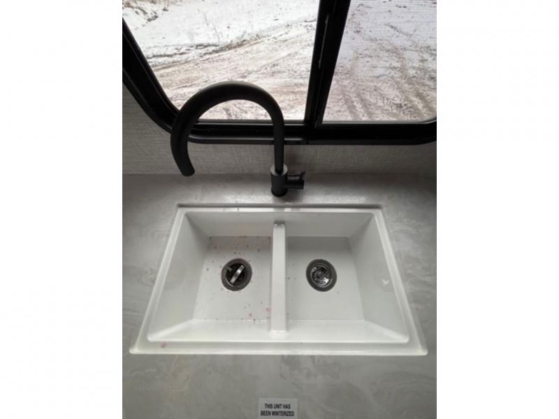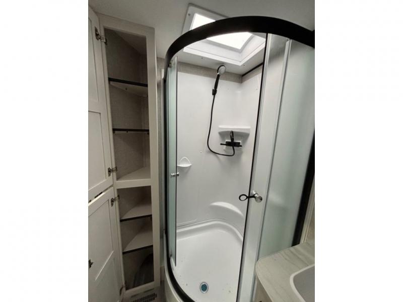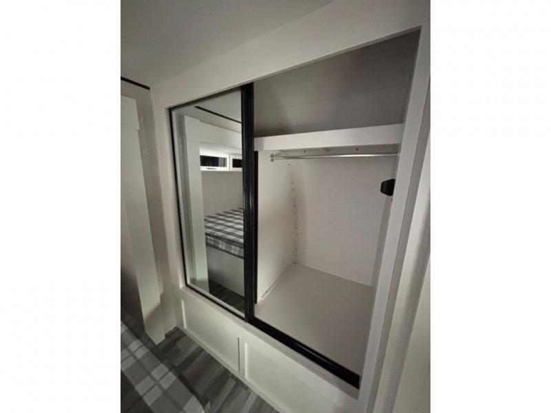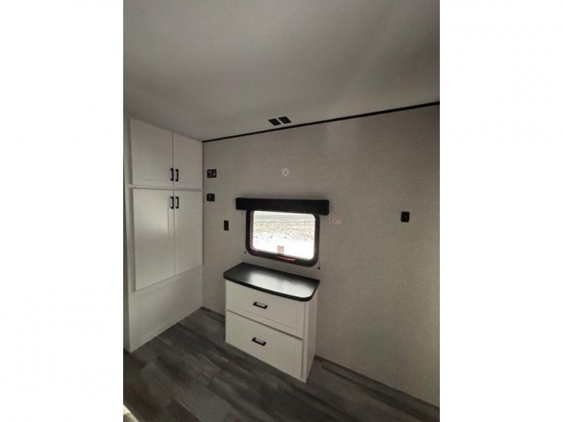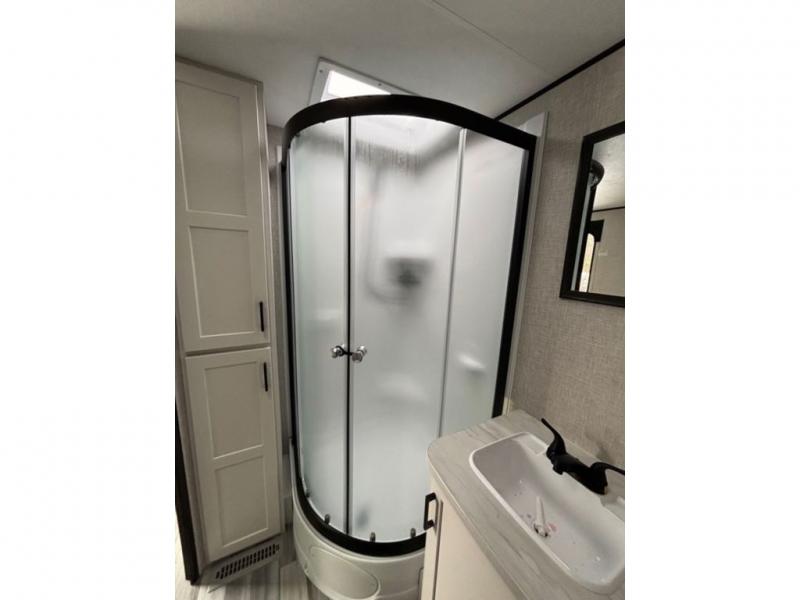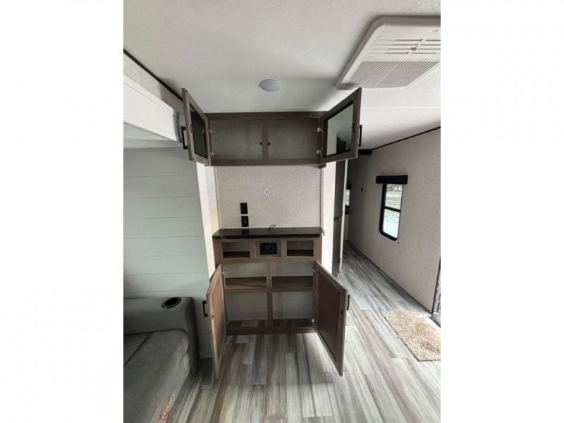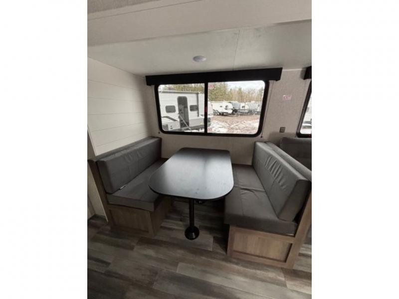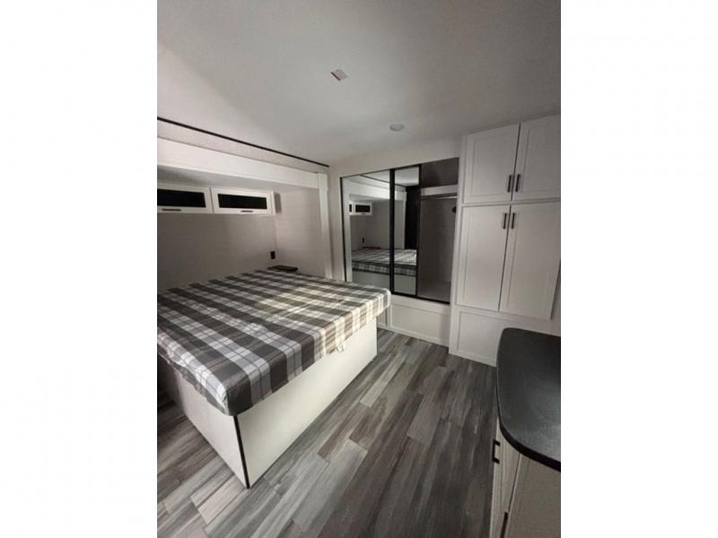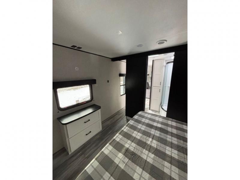 This rear kitchen travel trailer is perfect for your group of five to six! Once you arrive at the campground, you can unload the pass-thru storage, then set up the 18' power awning with LED lights. Head inside to make lunch on the three burner cooktop or in the microwave oven. There is a booth dinette where you can dine together, and you'll find additional seating space on the sofa and dual lounge chairs. Did we mention there is a large slide out for more floor space?! The dual entry bath includes a power vent, medicine cabinet, and a skylight for more natural lighting and extra head space. And don't overlook the front master bedroom with a queen bed slide out, a dresser and a wardrobe, plus additional storage with washer and dryer prep!