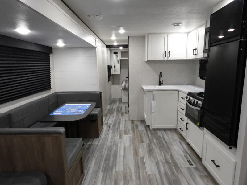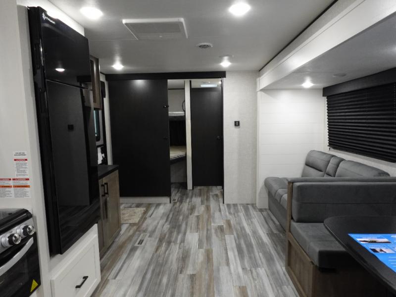You can't go wrong with this Jay Flight in tow! The little ones or your guests will love the rear bunkhouse with 48" x 76" bunk beds plus a half bath here and counter space to set their things on. The front of this unit houses the private bedroom with a queen bed, and the full bath is close by for easy nighttime use. Everyone can meet in the main living area to play a game around the U-shaped dinette or sofa, and there is a wardrobe/entertainment center if you want to add an optional LED Smart TV. A fully-equipped kitchen lets you cook meals inside each day, but you may just find yourself outdoors cooking on the pull-out griddle with an LP Quick Connect!