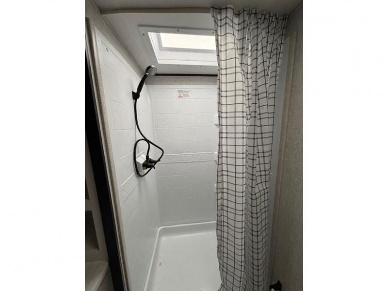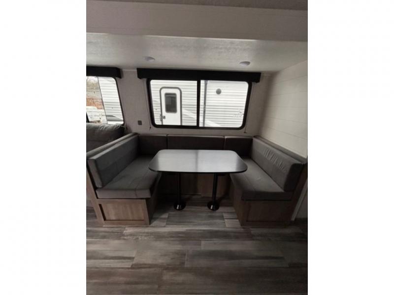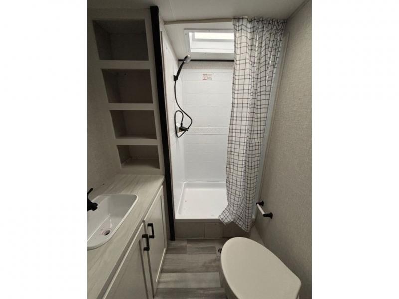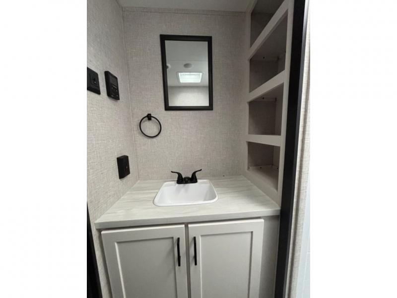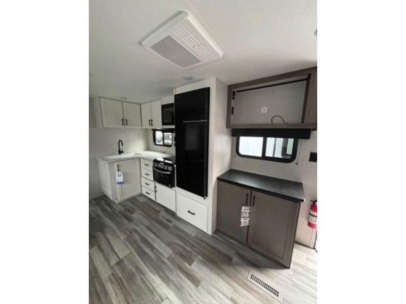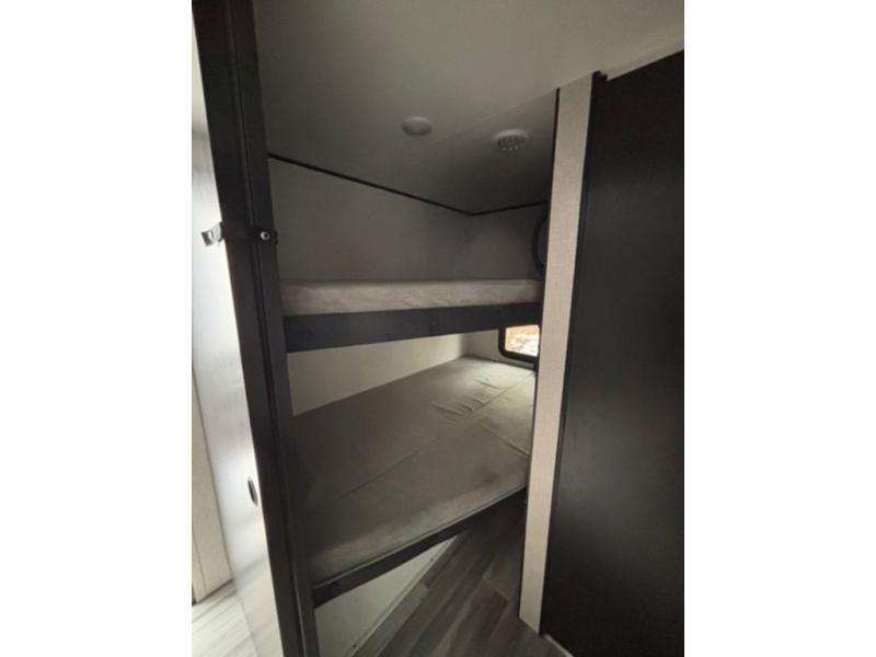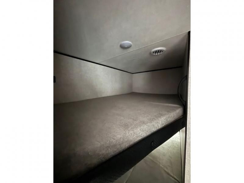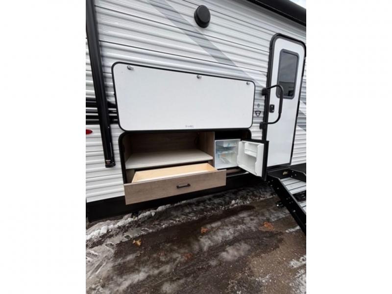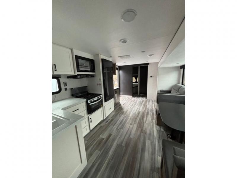 You can't go wrong with this Jay Flight in tow! The little ones or your guests will love the rear bunkhouse with 48" x 76" bunk beds plus a half bath here and counter space to set their things on. The front of this unit houses the private bedroom with a queen bed, and the full bath is close by for easy nighttime use. Everyone can meet in the main living area to play a game around the U-shaped dinette or sofa, and there is a wardrobe/entertainment center if you want to add an optional LED Smart TV. A fully-equipped kitchen lets you cook meals inside each day, but you may just find yourself outdoors cooking on the pull-out griddle with an LP Quick Connect!