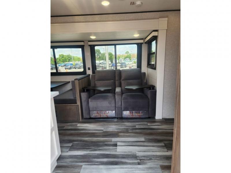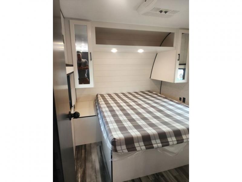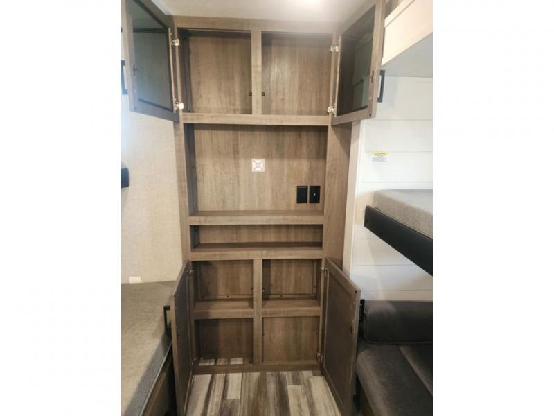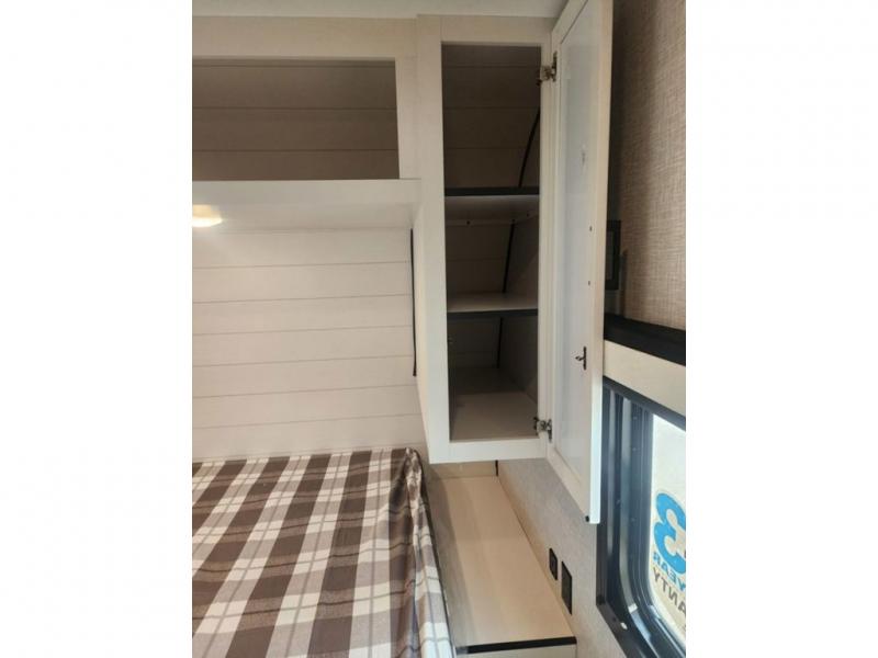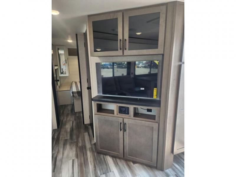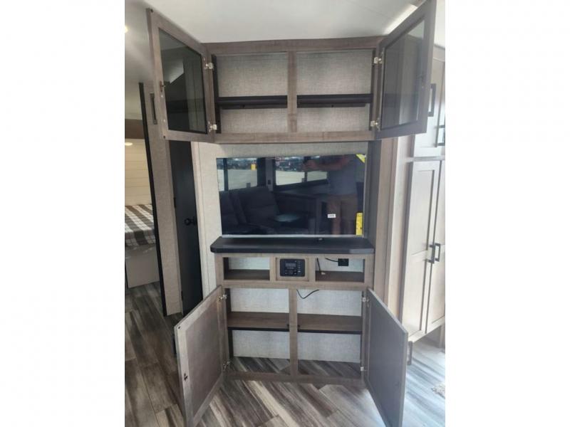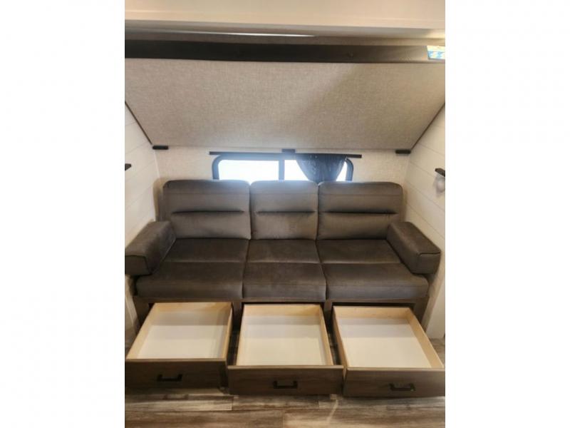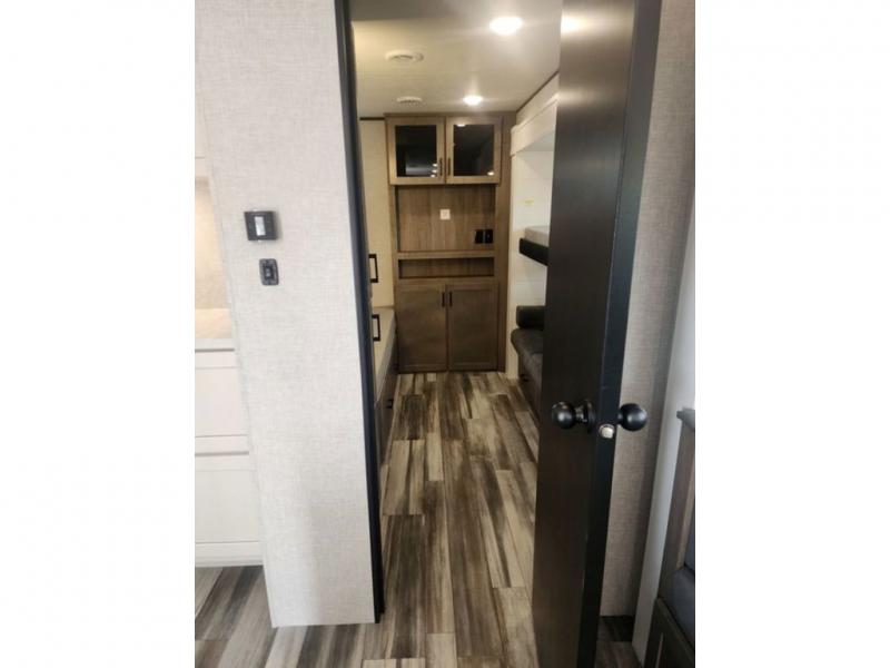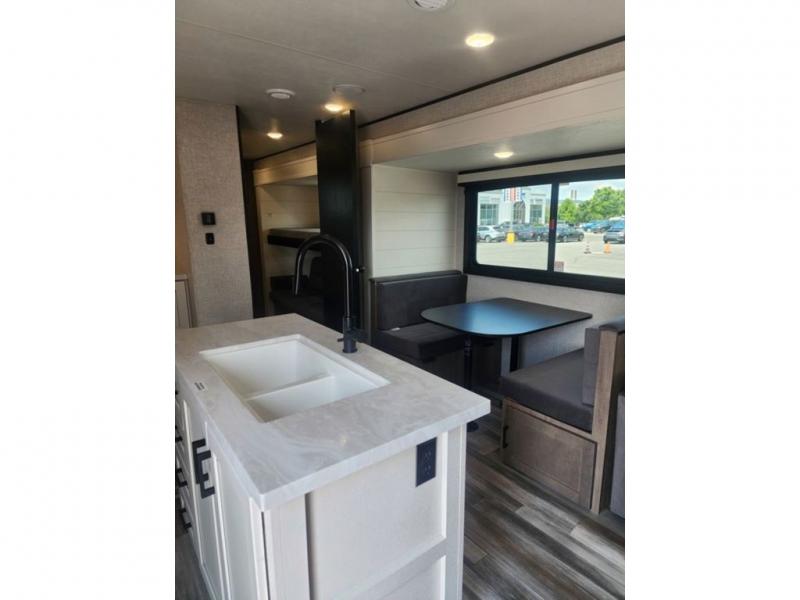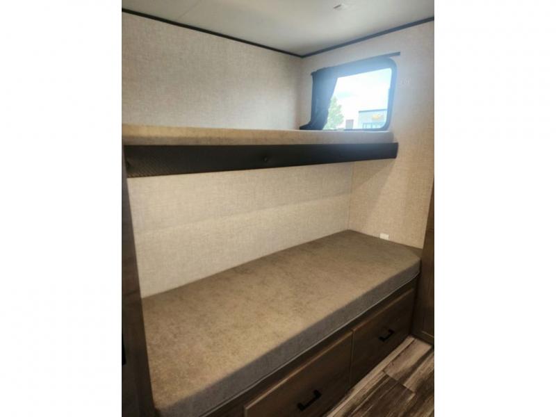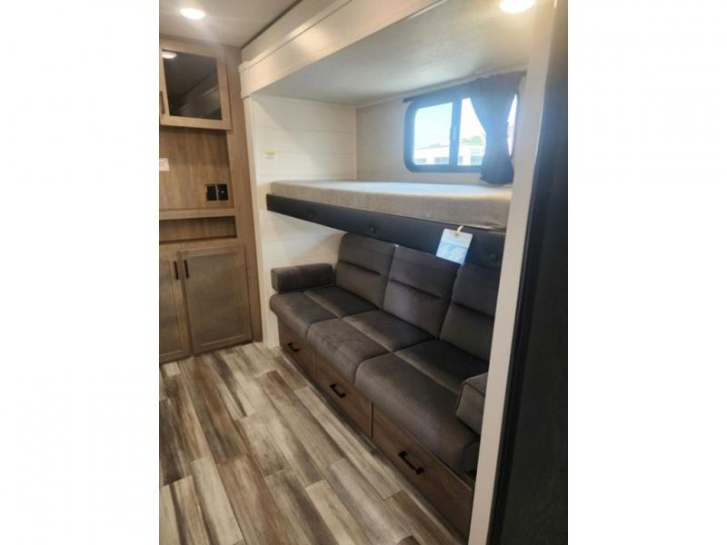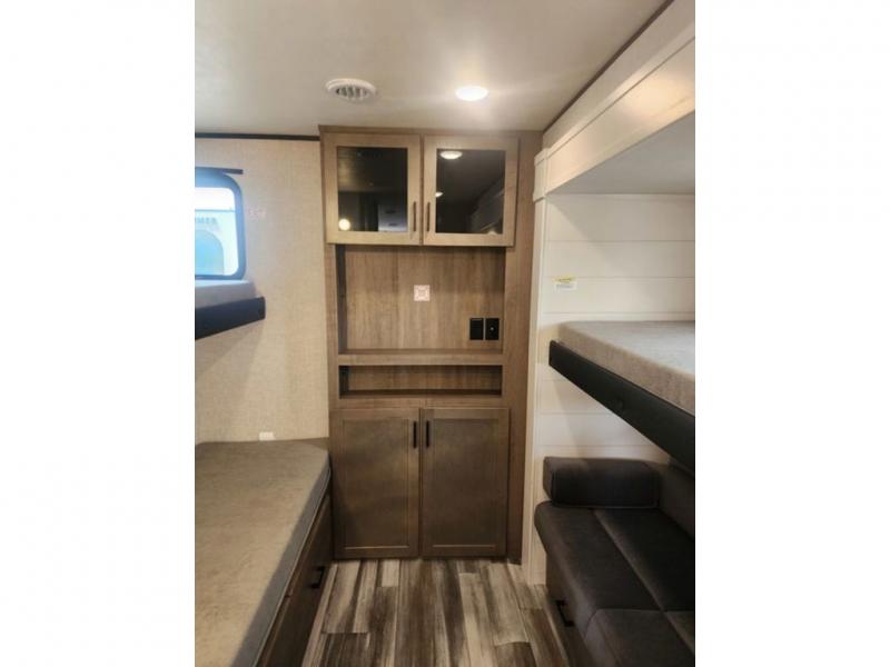 Take the whole crew with you in this travel trailer! The rear private bunkhouse is big enough to house all of the kiddos with a set of 38" x 73" bunk beds, a 27" x 74" bunk above a booth dinette, and an entertainment center. You will have your own privacy with the front private bedroom with a queen bed that has wardrobes on either side for your clothes. Keep everyone squeaky clean with the radius shower in the full bathroom, and their bellies full with the fully equipped kitchen which has a three burner cooktop, kitchen island, hutch, and a 12V refrigerator. Enjoy your meals and games at the booth dinette then transform it into an extra sleeping space, plus you can transform the Jack-knife sofa into one too!