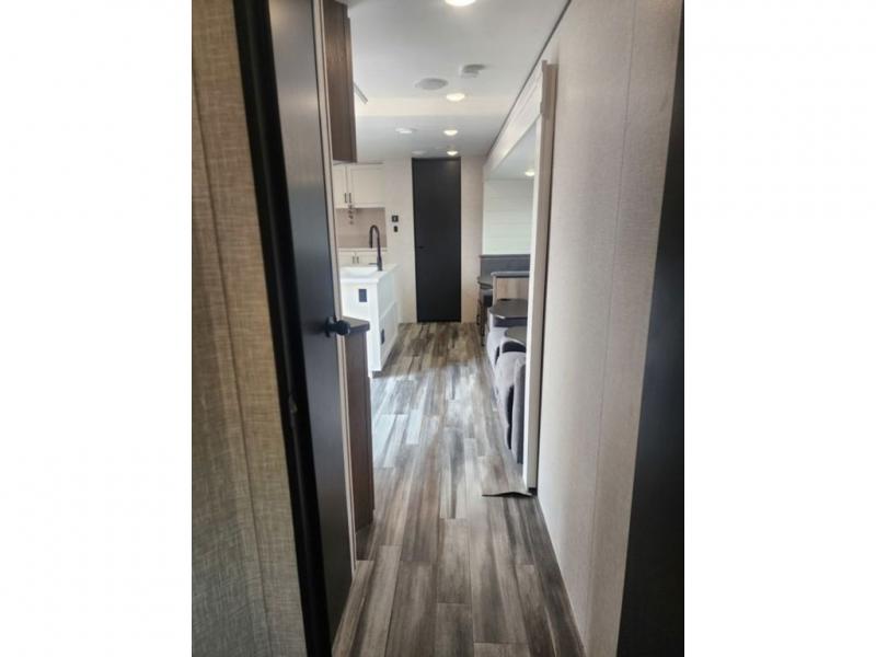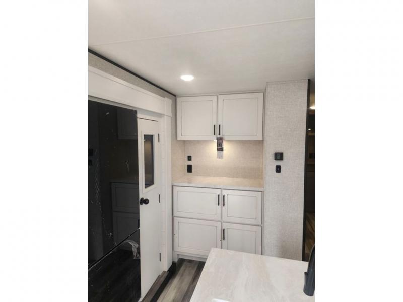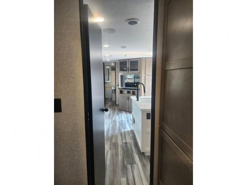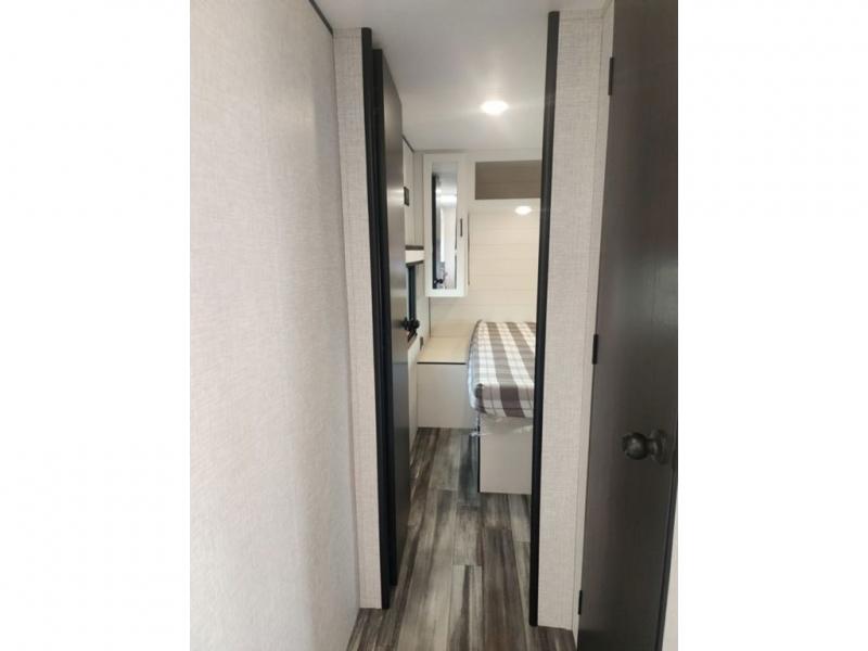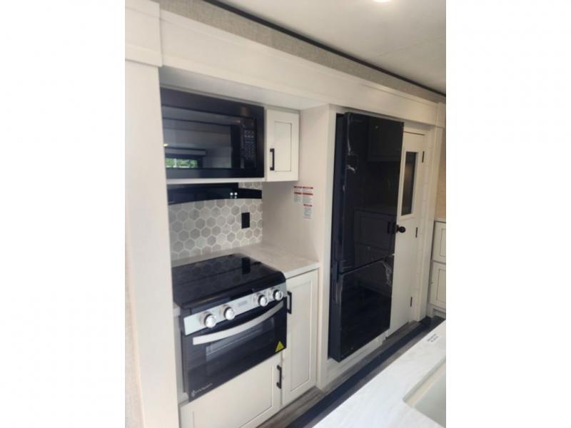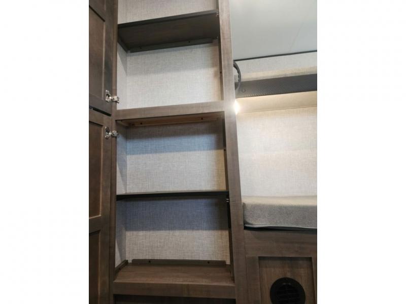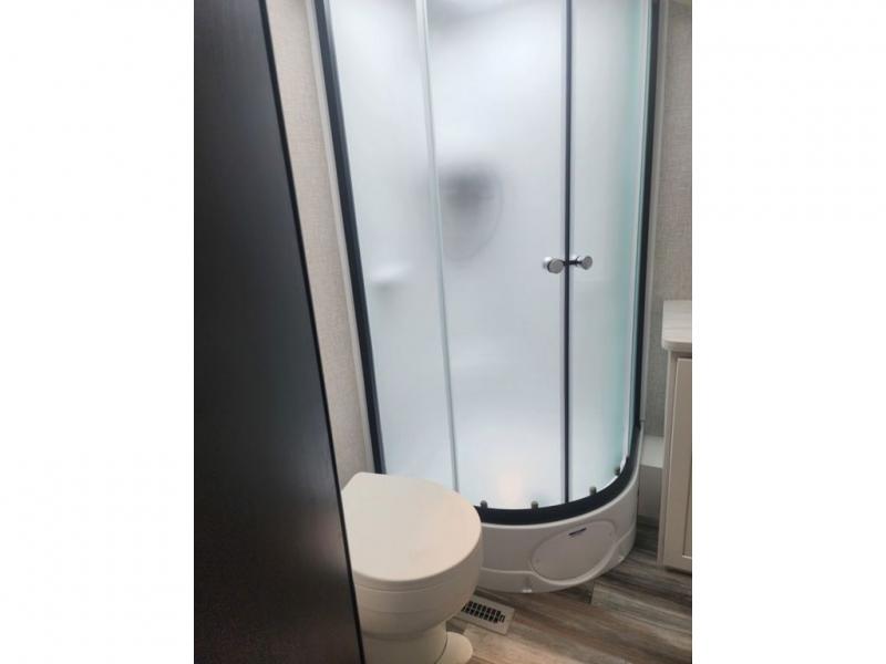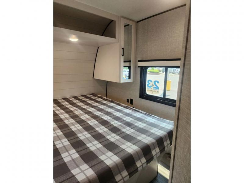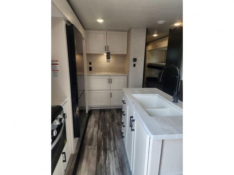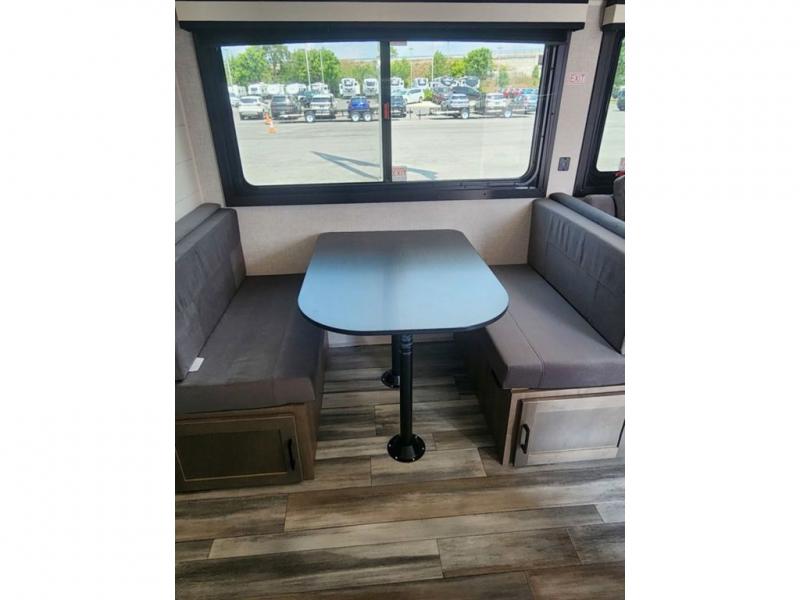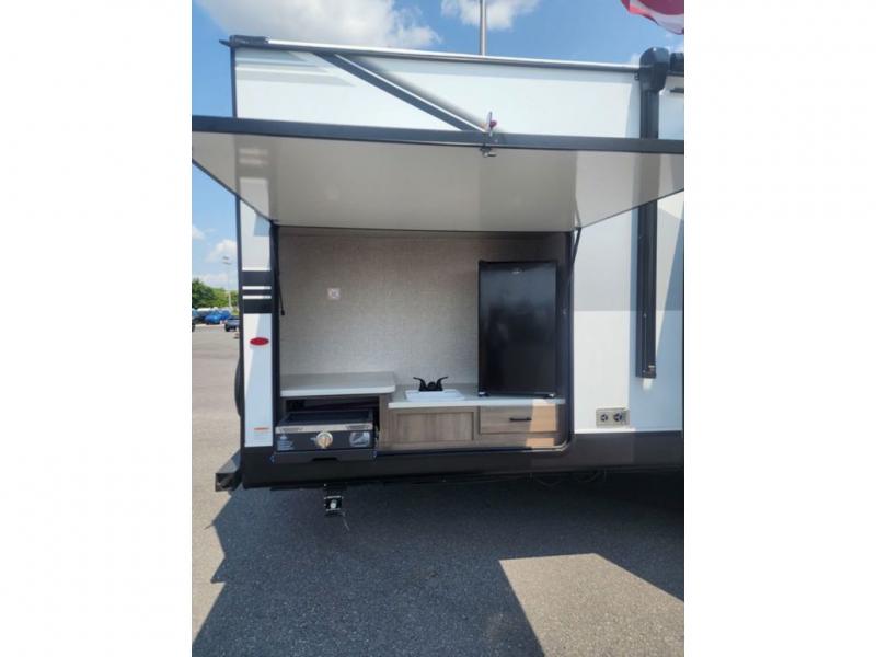Take the whole crew with you in this travel trailer! The rear private bunkhouse is big enough to house all of the kiddos with a set of 38" x 73" bunk beds, a 27" x 74" bunk above a booth dinette, and an entertainment center. You will have your own privacy with the front private bedroom with a queen bed that has wardrobes on either side for your clothes. Keep everyone squeaky clean with the radius shower in the full bathroom, and their bellies full with the fully equipped kitchen which has a three burner cooktop, kitchen island, hutch, and a 12V refrigerator. Enjoy your meals and games at the booth dinette then transform it into an extra sleeping space, plus you can transform the Jack-knife sofa into one too!