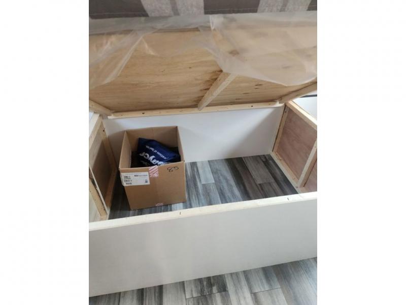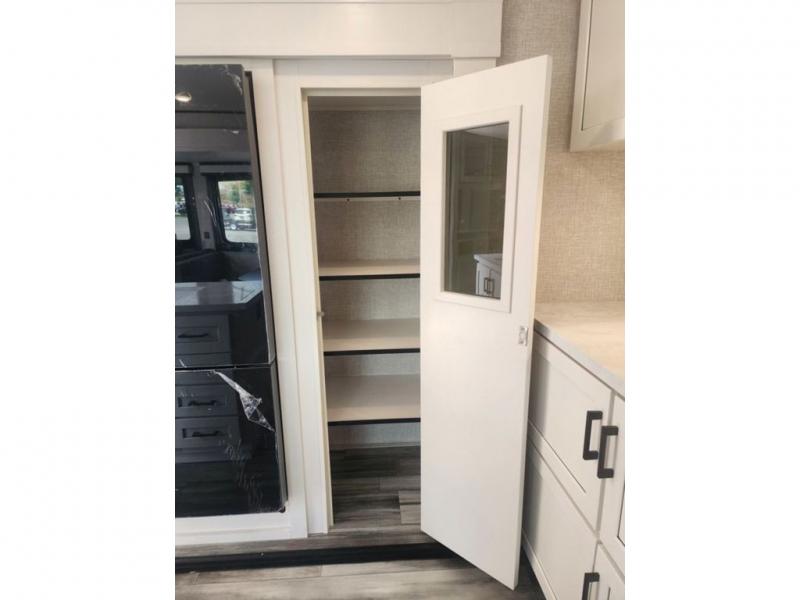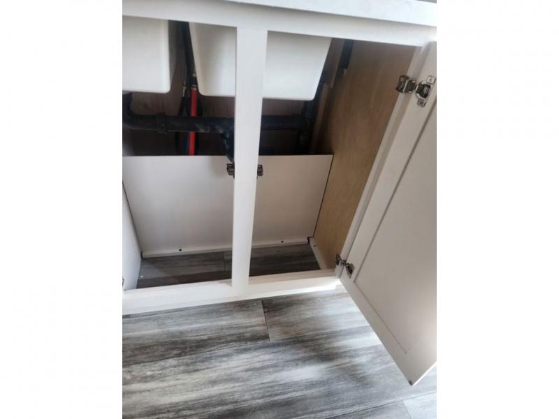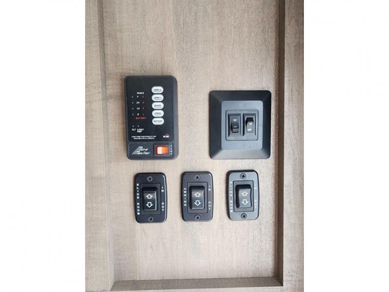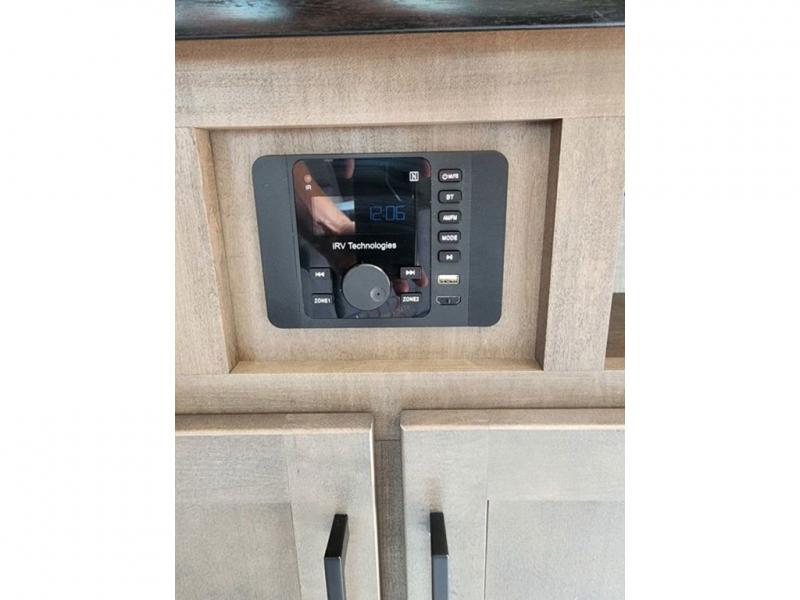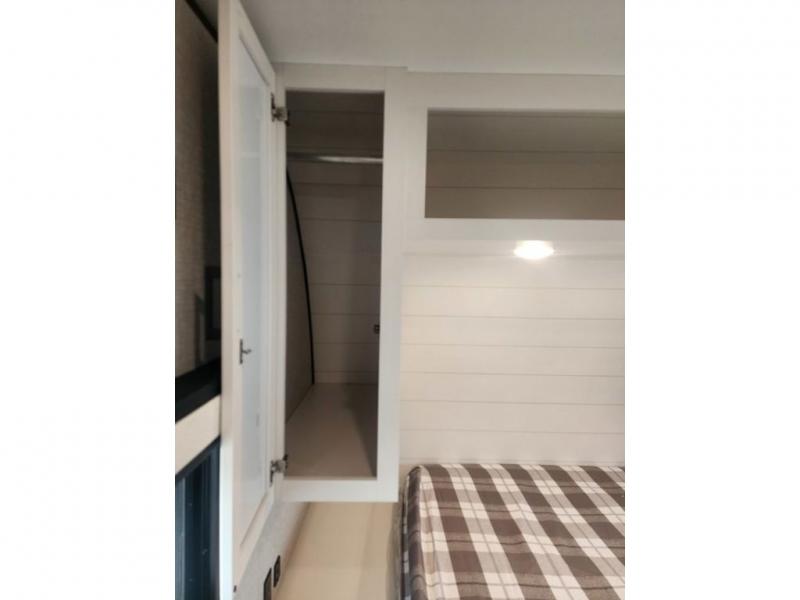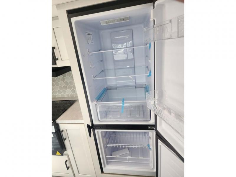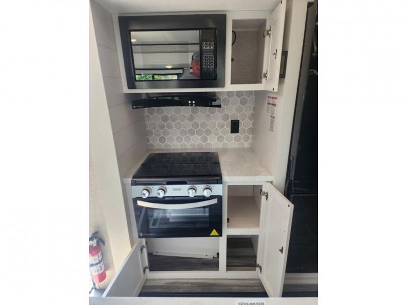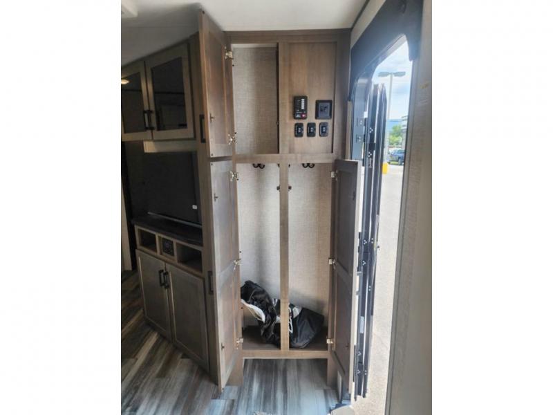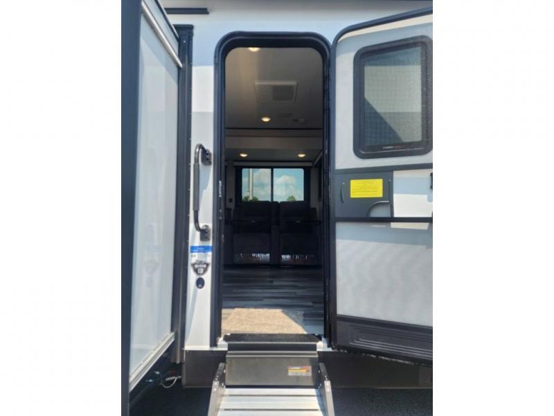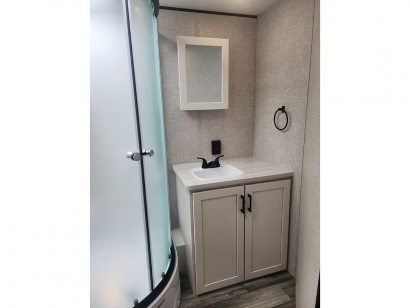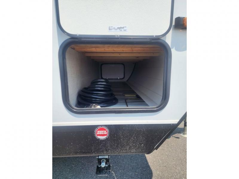 Take the whole crew with you in this travel trailer! The rear private bunkhouse is big enough to house all of the kiddos with a set of 38" x 73" bunk beds, a 27" x 74" bunk above a booth dinette, and an entertainment center. You will have your own privacy with the front private bedroom with a queen bed that has wardrobes on either side for your clothes. Keep everyone squeaky clean with the radius shower in the full bathroom, and their bellies full with the fully equipped kitchen which has a three burner cooktop, kitchen island, hutch, and a 12V refrigerator. Enjoy your meals and games at the booth dinette then transform it into an extra sleeping space, plus you can transform the Jack-knife sofa into one too!