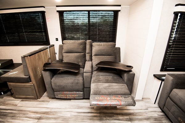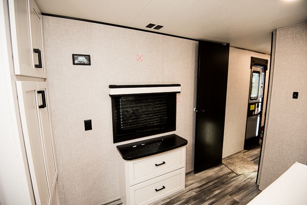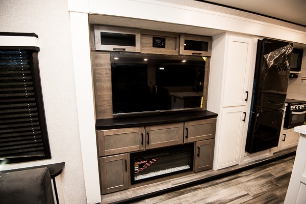 Enjoy a relaxing weekend getaway in this travel trailer! The dual entry bathroom with radius shower creates a front master suite with a queen bed slide, a dresser, and a front large wardrobe with storage space plus washer and dryer prep. The chef will have an easy time preparing their best home cooked meals with the kitchen island, hutch, three burner cooktop, and 12V refrigerator. Enjoy your meals at the booth dinette then play a card game or transform it into an extra sleeping space. The rear living area has a rear Jack-knife sofa for a quick afternoon nap and theater seating across from the entertainment center with a fireplace for the perfect spot on movie night!