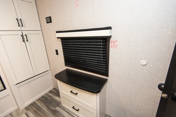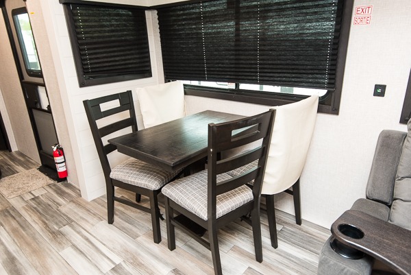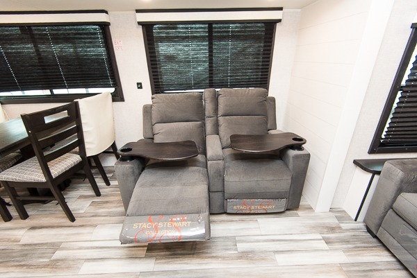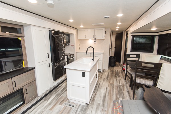 Enjoy a relaxing weekend getaway in this travel trailer! The dual entry bathroom with radius shower creates a front master suite with a queen bed slide, a dresser, and a front large wardrobe with storage space plus washer and dryer prep. The chef will have an easy time preparing their best home cooked meals with the kitchen island, hutch, three burner cooktop, and 12V refrigerator. Enjoy your meals at the booth dinette then play a card game or transform it into an extra sleeping space. The rear living area has a rear Jack-knife sofa for a quick afternoon nap and theater seating across from the entertainment center with a fireplace for the perfect spot on movie night!