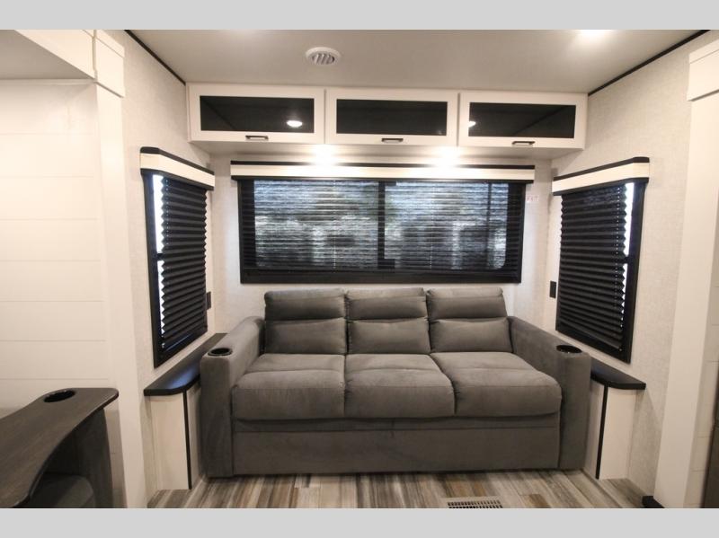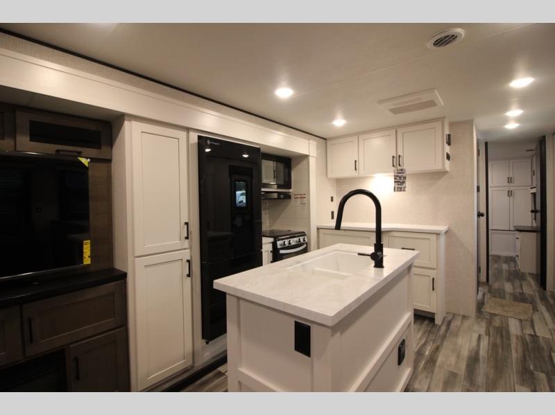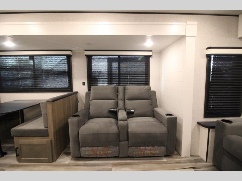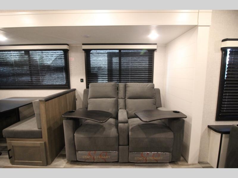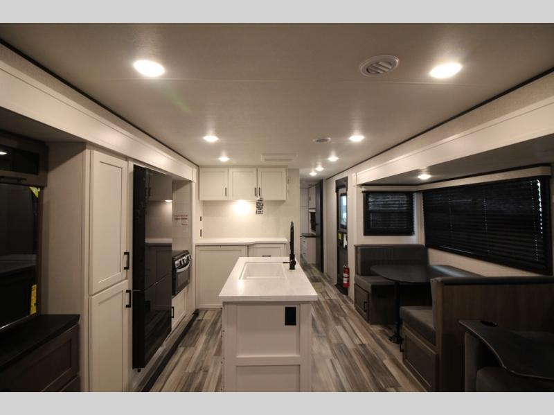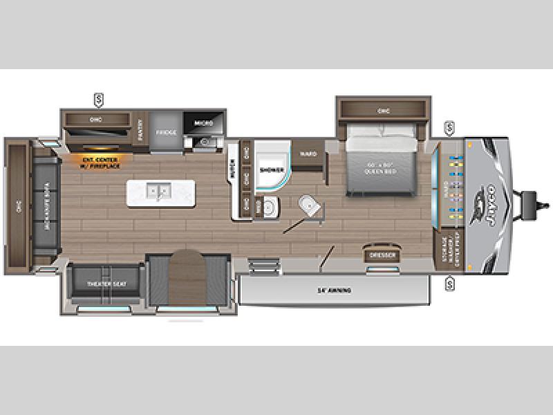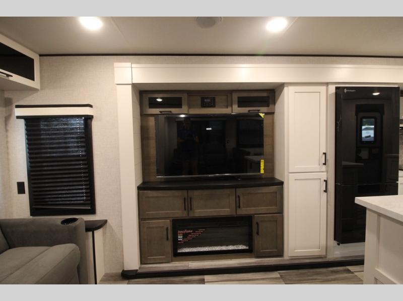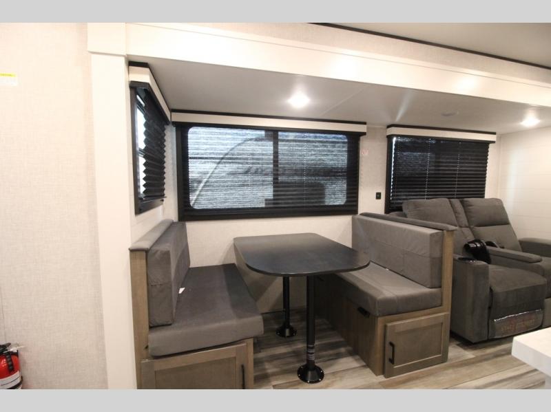 Enjoy a relaxing weekend getaway in this travel trailer! The dual entry bathroom with radius shower creates a front master suite with a queen bed slide, a dresser, and a front large wardrobe with storage space plus washer and dryer prep. The chef will have an easy time preparing their best home cooked meals with the kitchen island, hutch, three burner cooktop, and 12V refrigerator. Enjoy your meals at the booth dinette then play a card game or transform it into an extra sleeping space. The rear living area has a rear Jack-knife sofa for a quick afternoon nap and theater seating across from the entertainment center with a fireplace for the perfect spot on movie night!