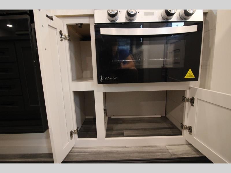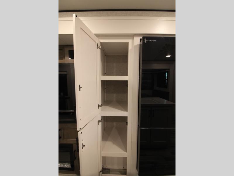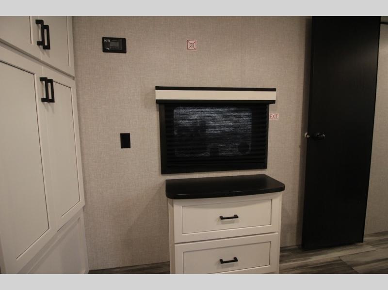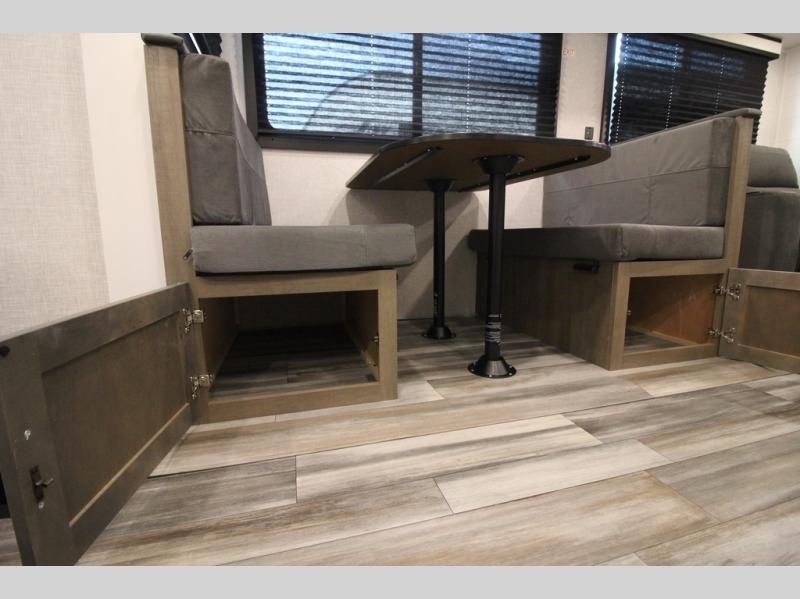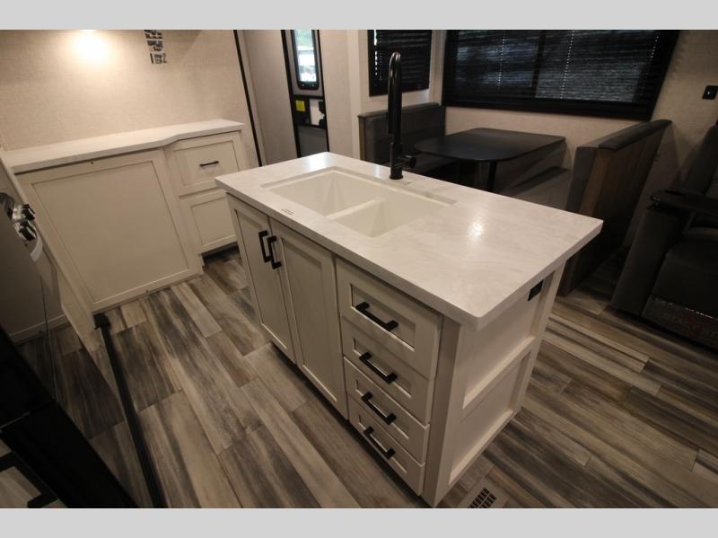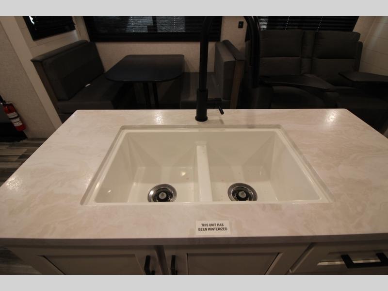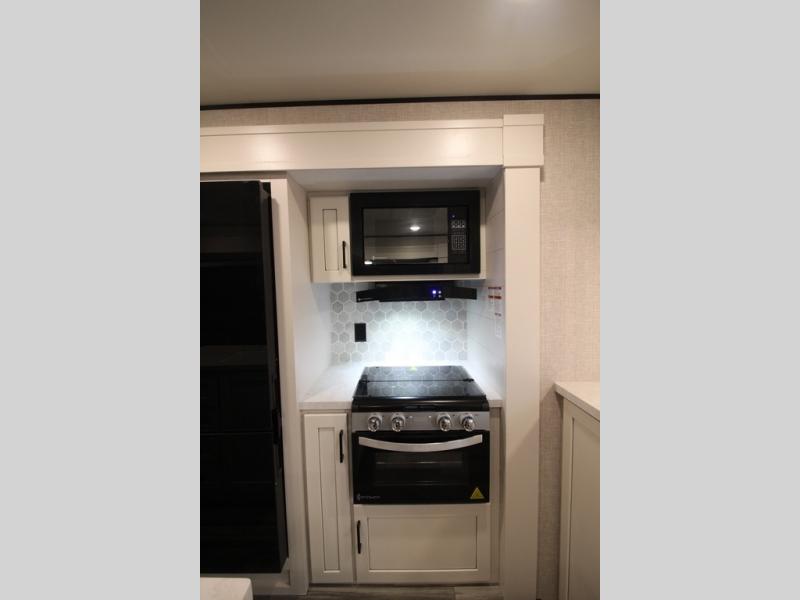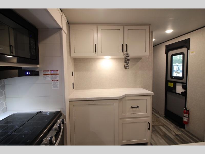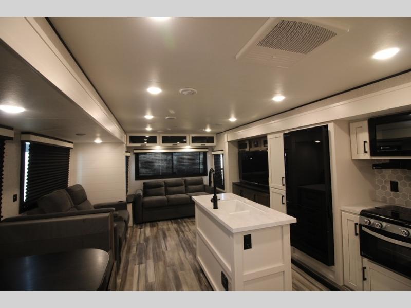 Enjoy a relaxing weekend getaway in this travel trailer! The dual entry bathroom with radius shower creates a front master suite with a queen bed slide, a dresser, and a front large wardrobe with storage space plus washer and dryer prep. The chef will have an easy time preparing their best home cooked meals with the kitchen island, hutch, three burner cooktop, and 12V refrigerator. Enjoy your meals at the booth dinette then play a card game or transform it into an extra sleeping space. The rear living area has a rear Jack-knife sofa for a quick afternoon nap and theater seating across from the entertainment center with a fireplace for the perfect spot on movie night!