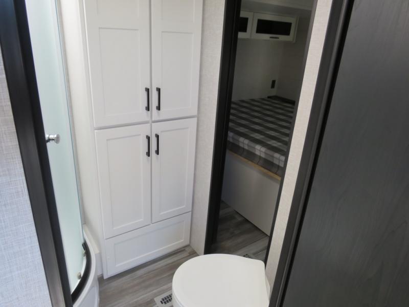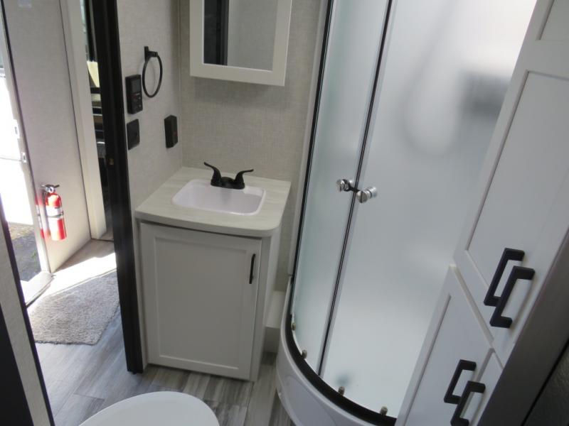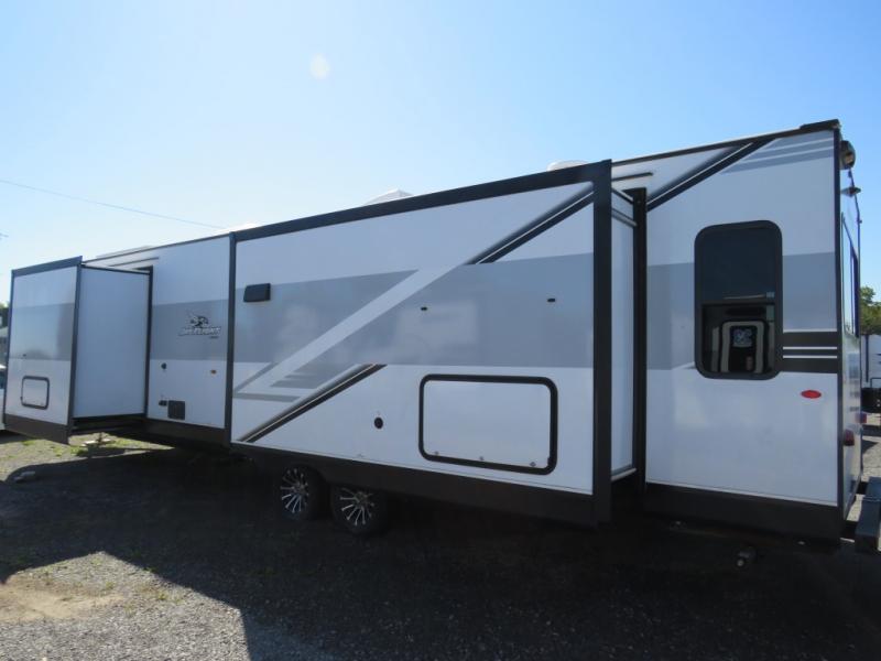 Enjoy a relaxing weekend getaway in this travel trailer! The dual entry bathroom with radius shower creates a front master suite with a queen bed slide, a dresser, and a front large wardrobe with storage space plus washer and dryer prep. The chef will have an easy time preparing their best home cooked meals with the kitchen island, hutch, three burner cooktop, and 12V refrigerator. Enjoy your meals at the booth dinette then play a card game or transform it into an extra sleeping space. The rear living area has a rear Jack-knife sofa for a quick afternoon nap and theater seating across from the entertainment center with a fireplace for the perfect spot on movie night!