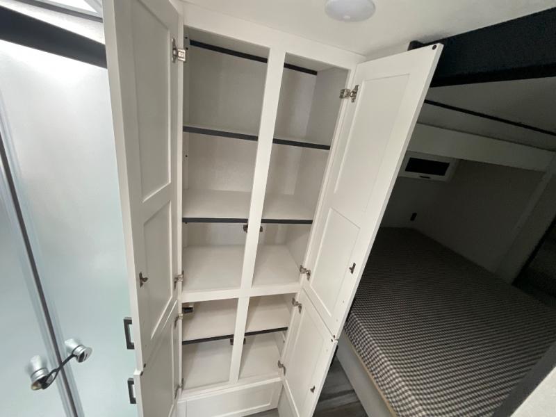 Enjoy a relaxing weekend getaway in this travel trailer! The dual entry bathroom with radius shower creates a front master suite with a queen bed slide, a dresser, and a front large wardrobe with storage space plus washer and dryer prep. The chef will have an easy time preparing their best home cooked meals with the kitchen island, hutch, three burner cooktop, and 12V refrigerator. Enjoy your meals at the booth dinette then play a card game or transform it into an extra sleeping space. The rear living area has a rear Jack-knife sofa for a quick afternoon nap and theater seating across from the entertainment center with a fireplace for the perfect spot on movie night!