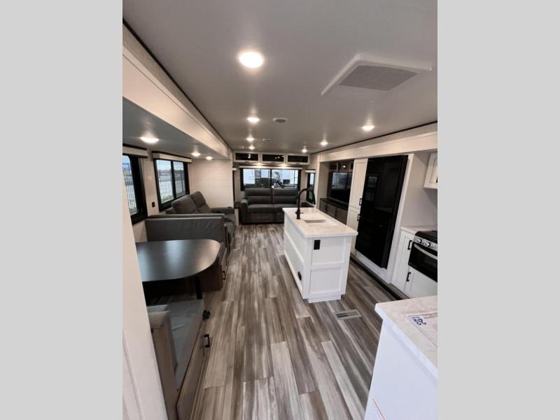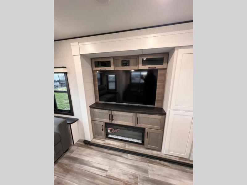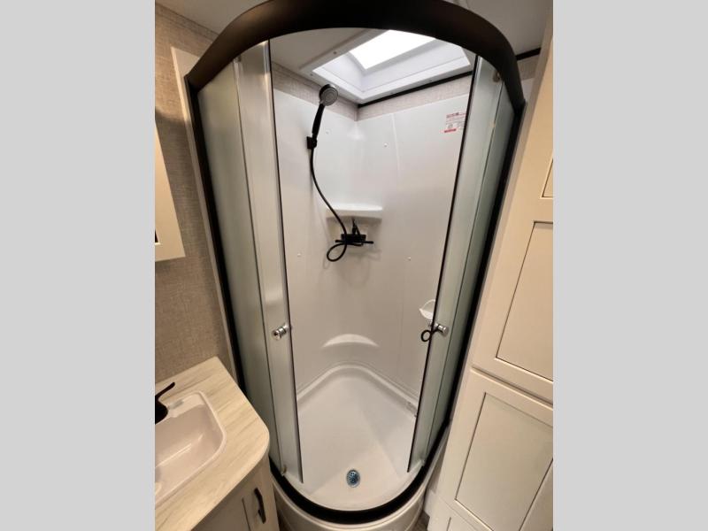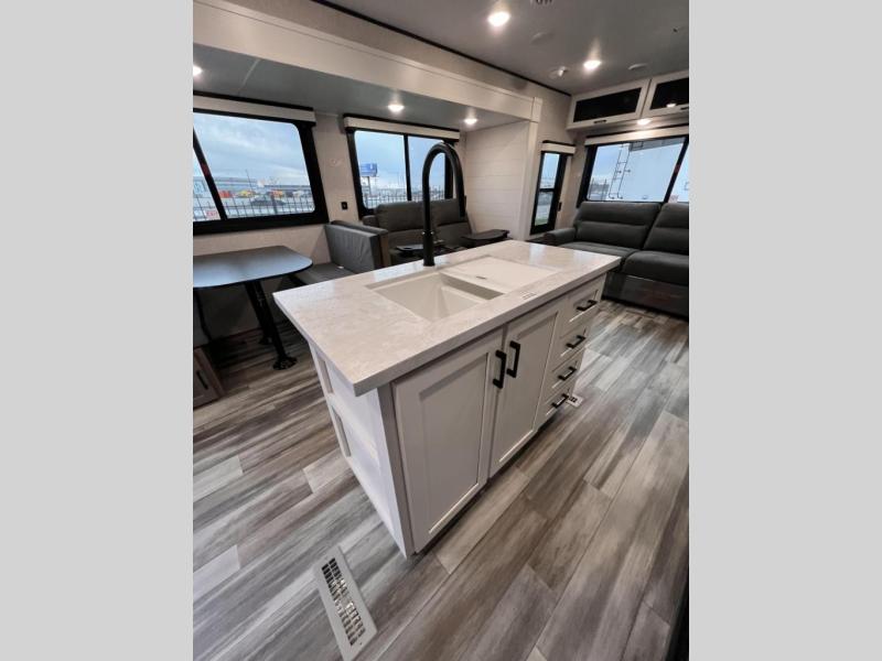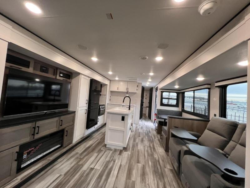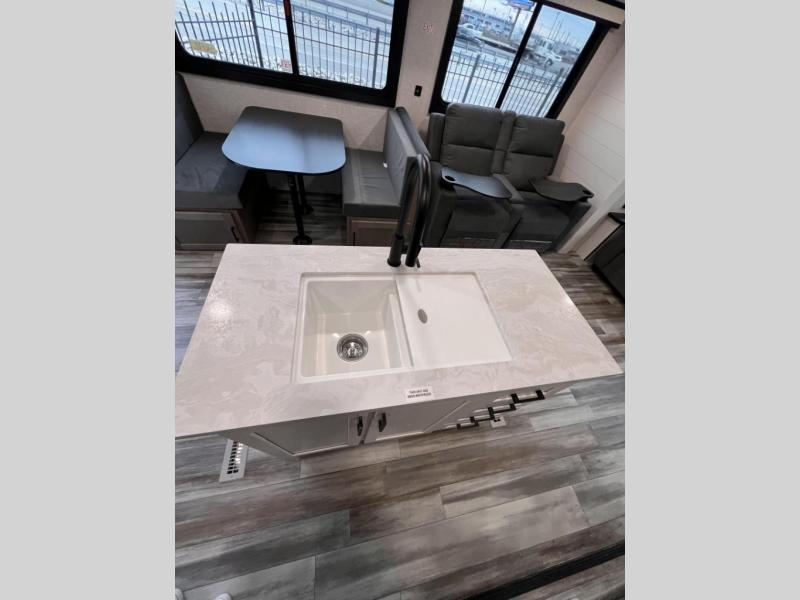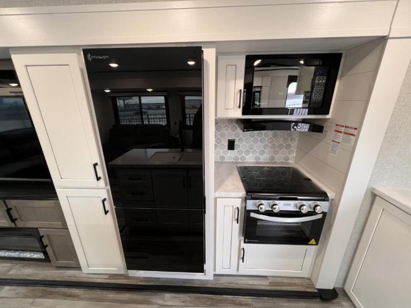 You’ll also notice the top-of-the-line InVision appliances that feature a 10-cubic-foot 12V refrigerator with a convenient bottom freezer and adjustable shelves. Matching is an overhead microwave, a three-burner stove top and an electronic temperature-controlled oven. Equally as impressive as the features previously listed, are the unseen amenities such as the 60,000 BTU on-demand tankless water heater that offers an endless supply of hot water. The oversized 52-gallon freshwater tank is roughly 25% larger than the competition.
