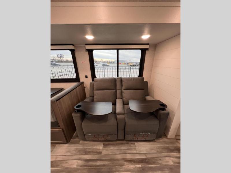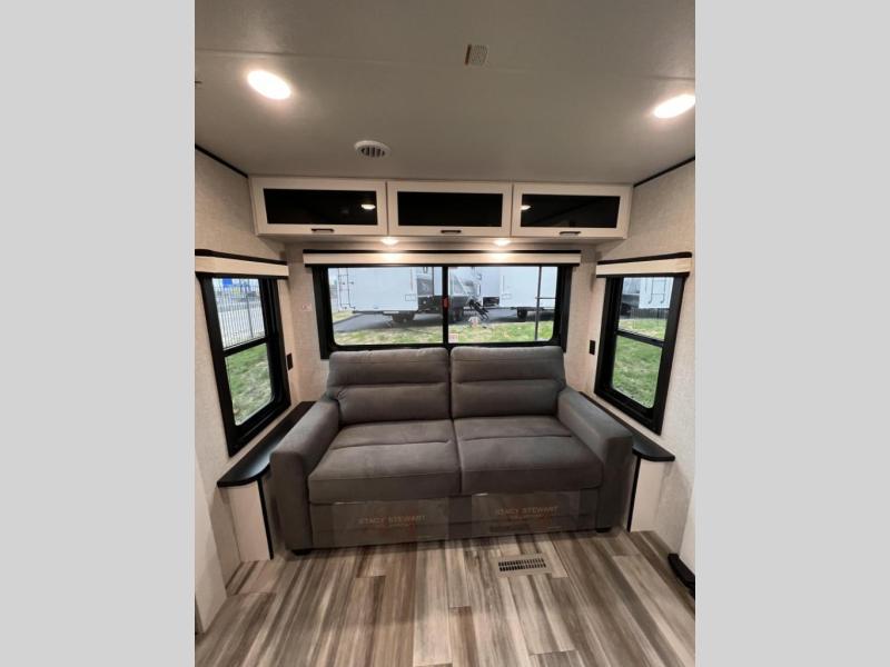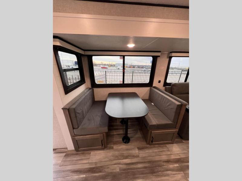 On top of that storage space, are superior and professionally designed pieces of furniture. Jack-knife sofas come with arm bolsters and pull-down center armrests with cupholders. Many floorplans offer different furniture options such as a tri-fold sofas and theater seating. The new MY25 fabric is stain resistant with an added protectant to keep your Jay Flight furniture looking new. This fabric is thoroughly tested and must pass the 50,000 double rub tests. The 4” high-density foam dinette cushions are designed for comfort and won’t break down over time.
