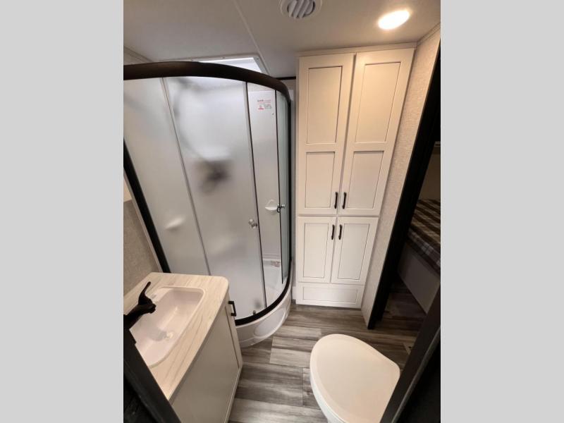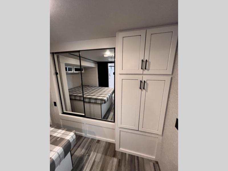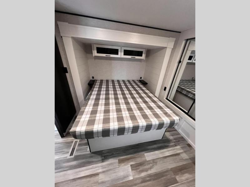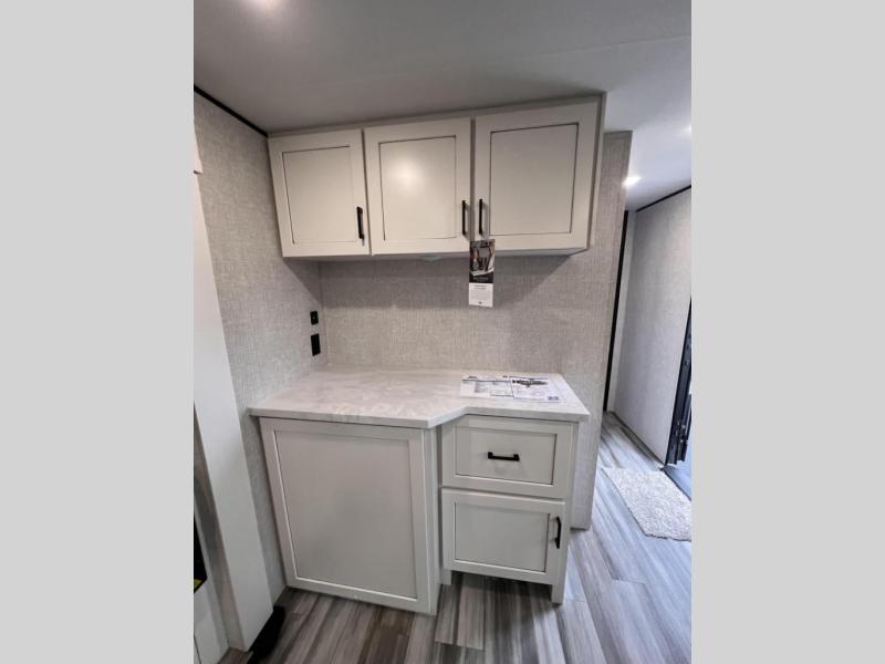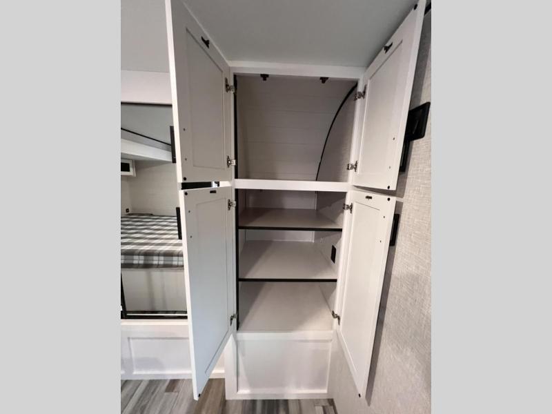 Jayco’s Jay Flight Travel Trailer lengths range from 25'4 to 40'6 for longer trips and roomier stays. Additionally, while most other manufacturers have an interior height of 6’6”, Jay Flight offers 6’9” interior heights, allowing for more head space. On the exterior, you’ll find a neatly finished and lighted exterior pass-thru storage space. The interior design also allows more storage space with its oversized, solid hardwood Maple cabinet doors and kitchen drawers. The hidden cabinet hinges give the Jay Flight a residential look and feel. Other places you’ll find maximized storage are underneath the bed or bunk beds, under the dinette, under the jack-knife sofas and behind a pull-down kickboard that accesses the storage.