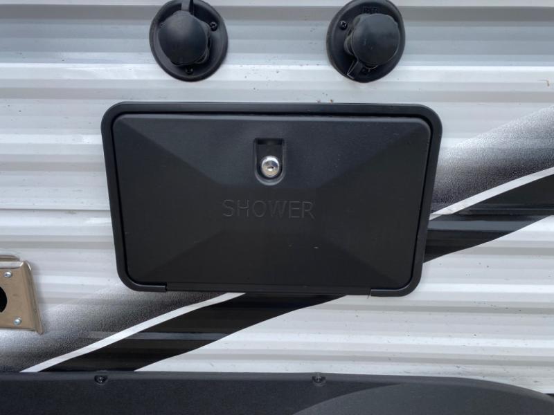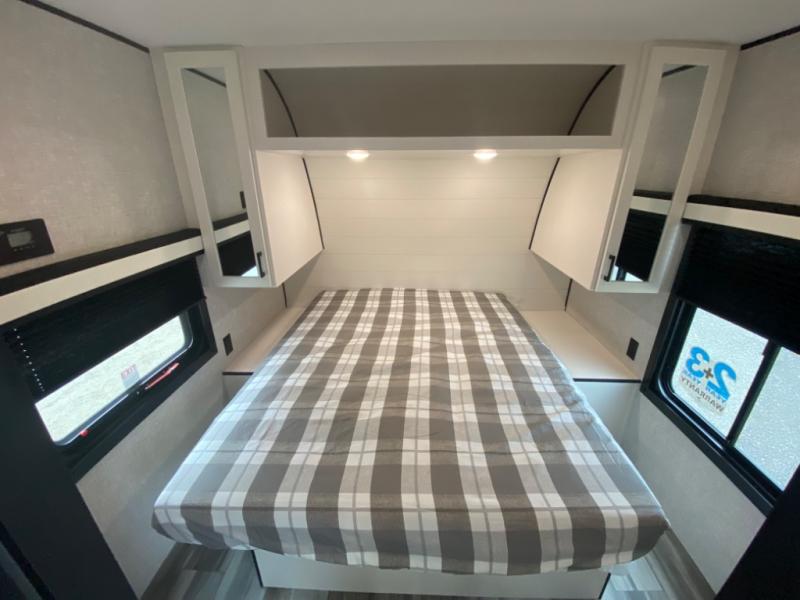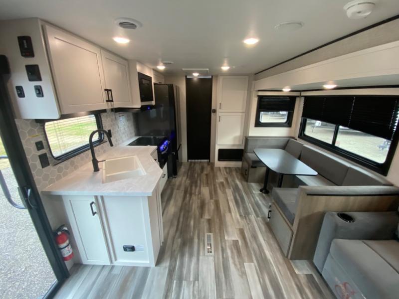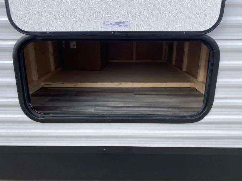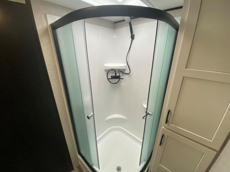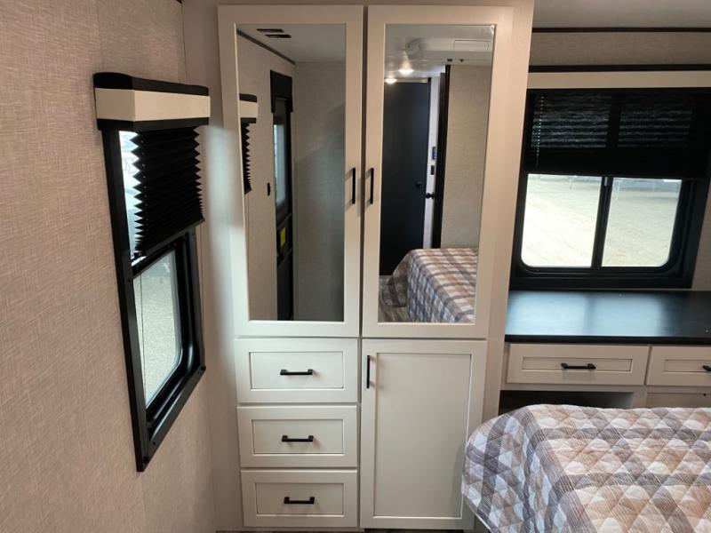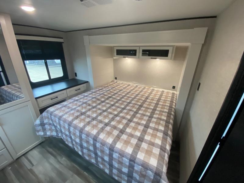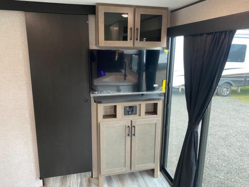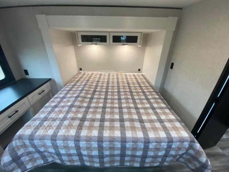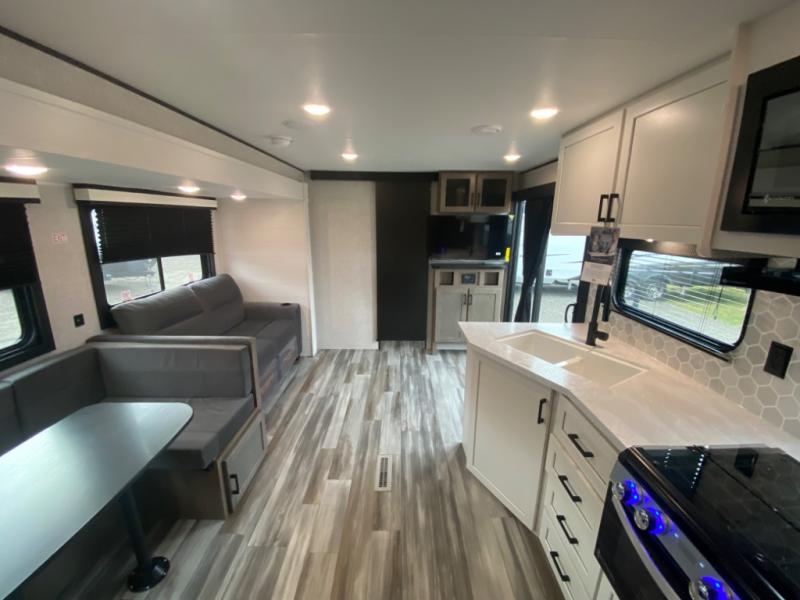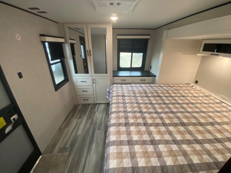 With two private bedrooms, everyone will have a comfortable place to sleep in this travel trailer! The front private bedroom has a 60" x 75" queen bed with wardrobes on either side and the rear private bedroom has a 60" x 80" queen bed slide with a dresser, a wardrobe, one of the exit/entrance doors, and an entrance into the walk-through bathroom which has a radius shower for everyone to stay squeaky clean. The patio doors not only make it easy to enter and exit the unit, but also bring in tons of natural lighting. After you have prepared a delicious home cooked meal, you can can head to the U-shaped dinette to enjoy it there comfortably then relax on the Jack-knife sofa across from the entertainment center!