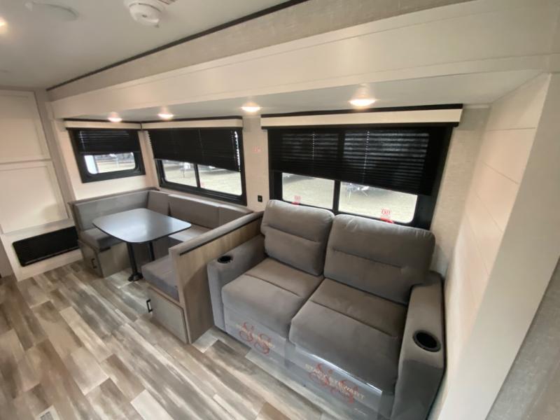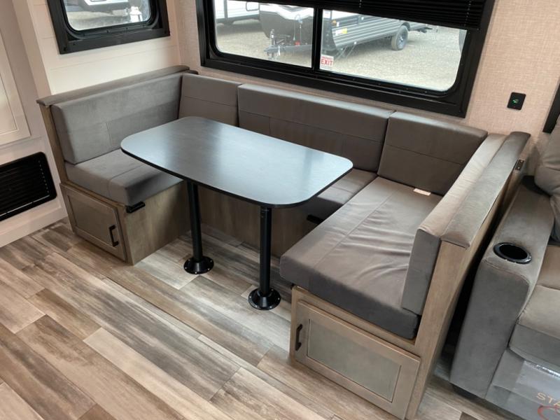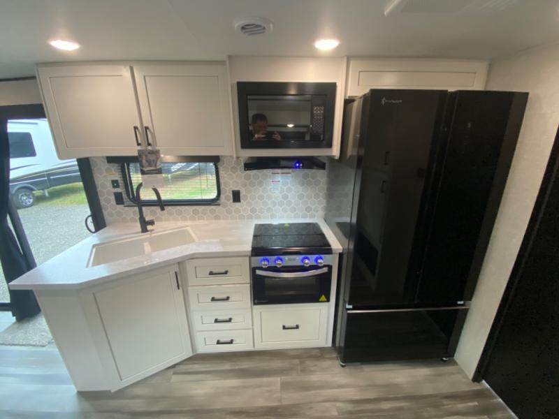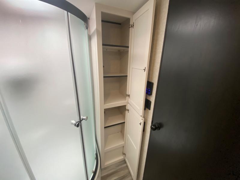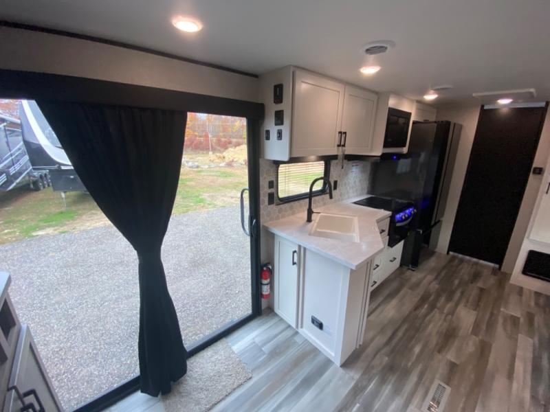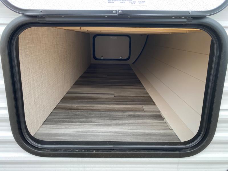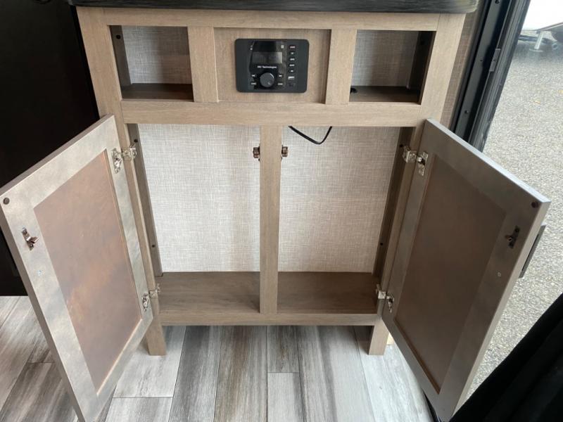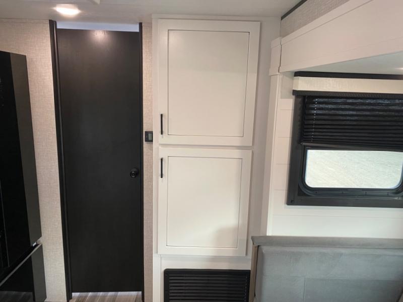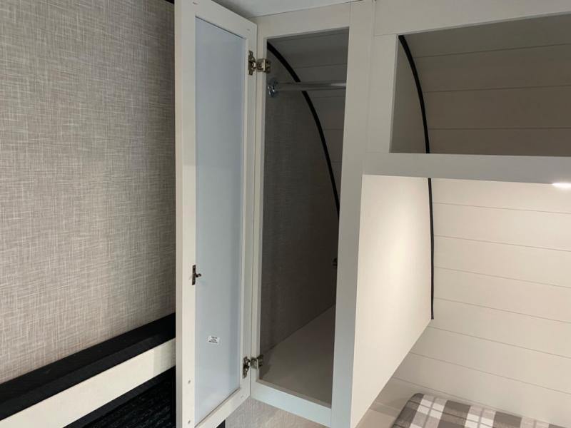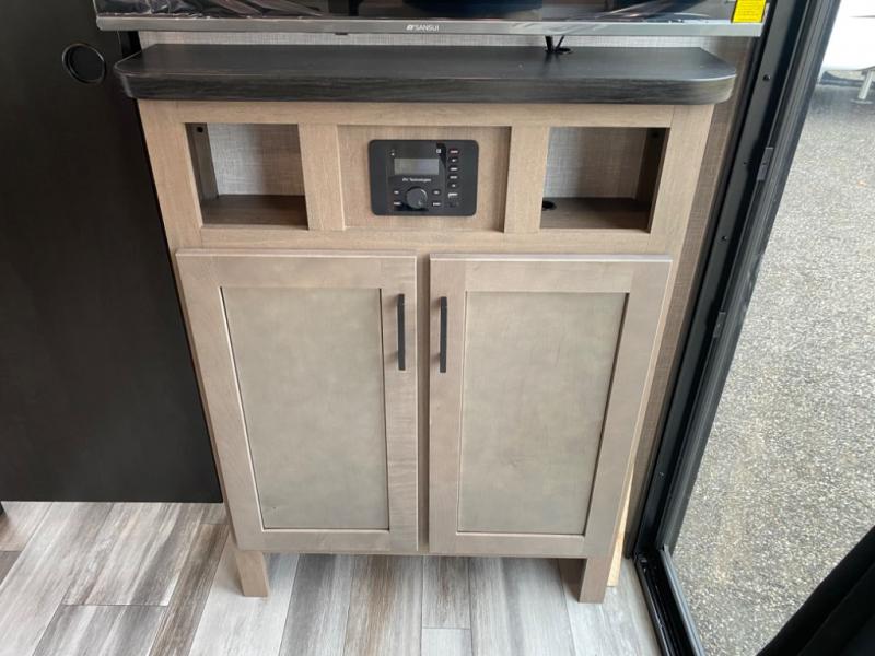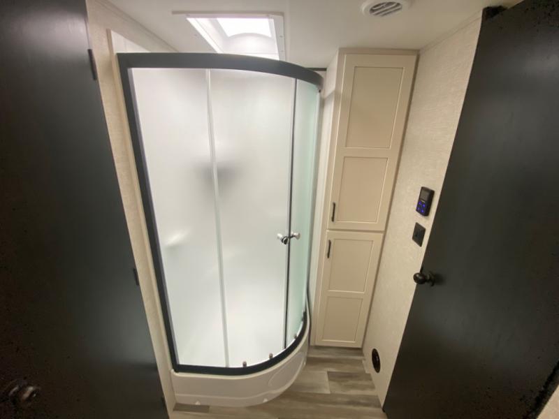 With two private bedrooms, everyone will have a comfortable place to sleep in this travel trailer! The front private bedroom has a 60" x 75" queen bed with wardrobes on either side and the rear private bedroom has a 60" x 80" queen bed slide with a dresser, a wardrobe, one of the exit/entrance doors, and an entrance into the walk-through bathroom which has a radius shower for everyone to stay squeaky clean. The patio doors not only make it easy to enter and exit the unit, but also bring in tons of natural lighting. After you have prepared a delicious home cooked meal, you can can head to the U-shaped dinette to enjoy it there comfortably then relax on the Jack-knife sofa across from the entertainment center!