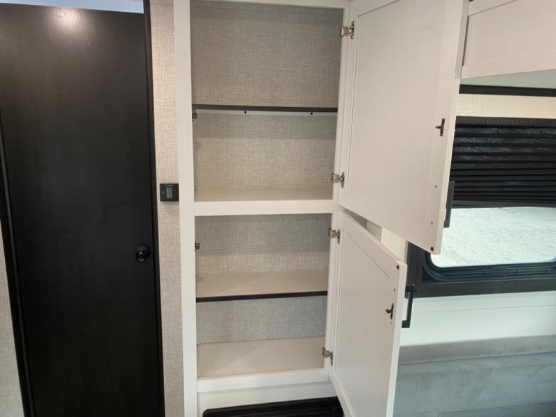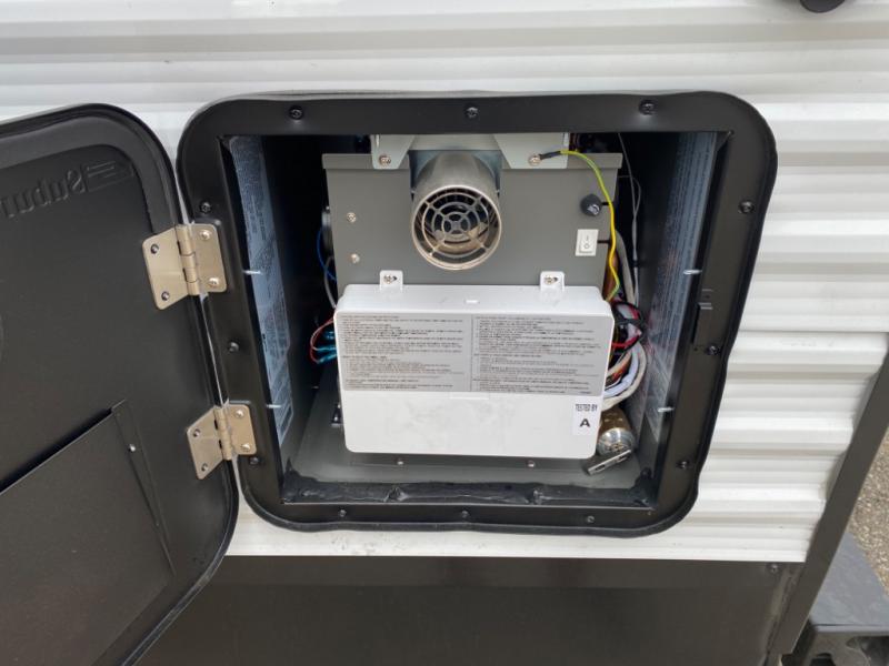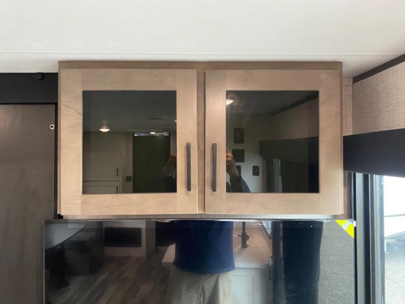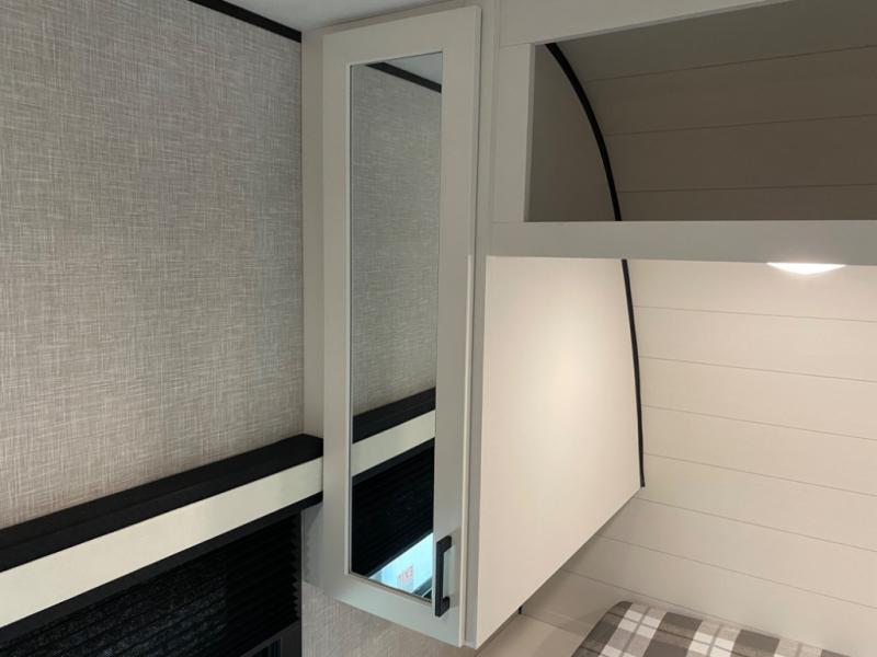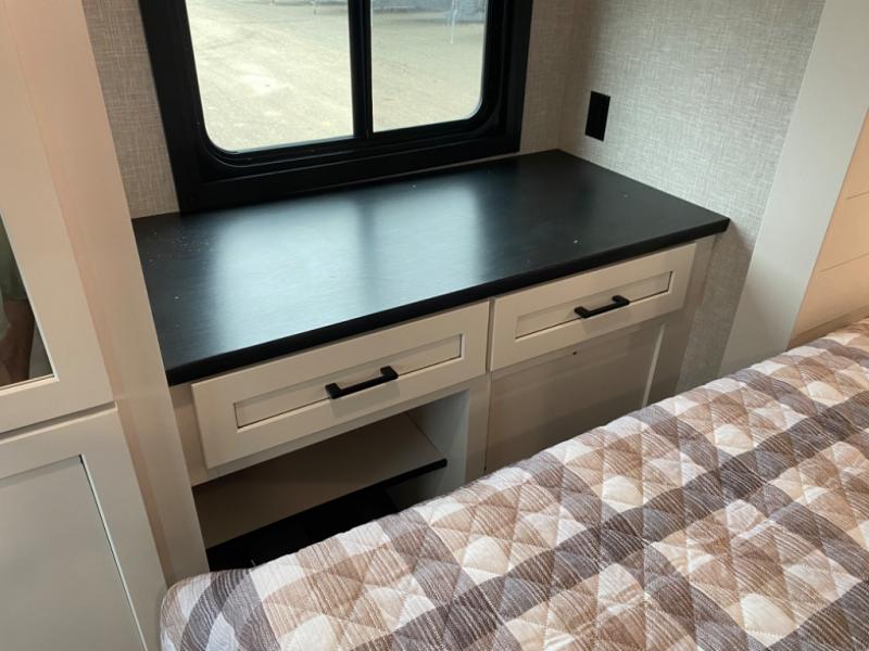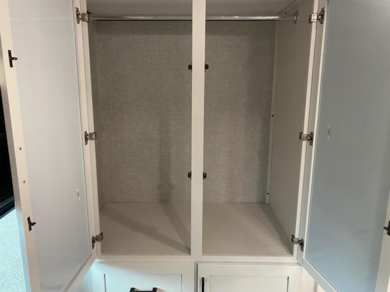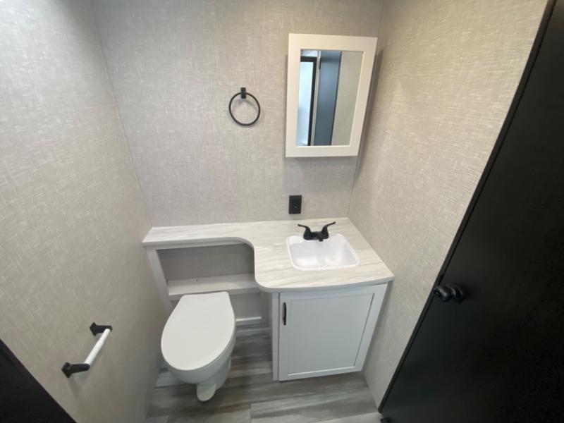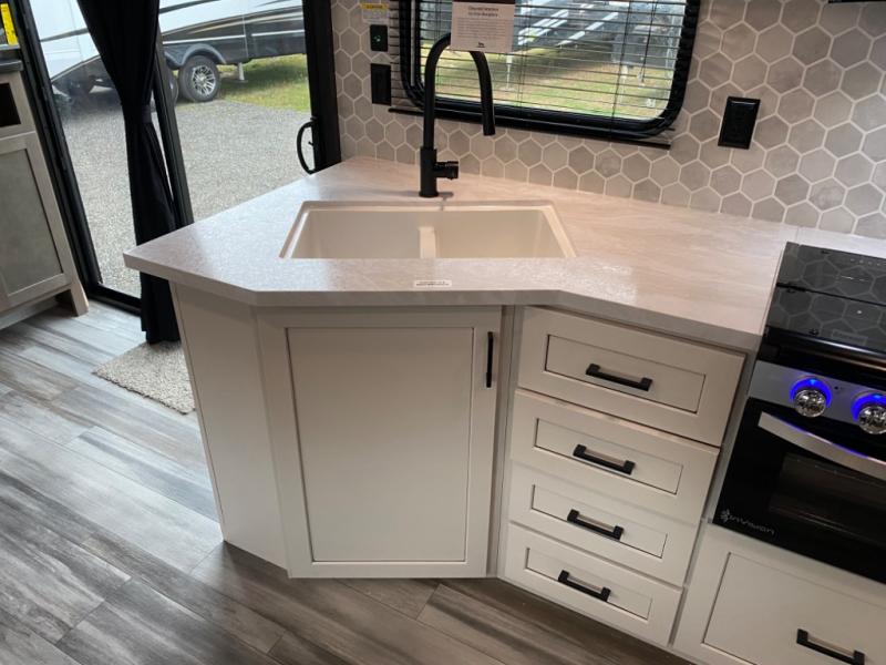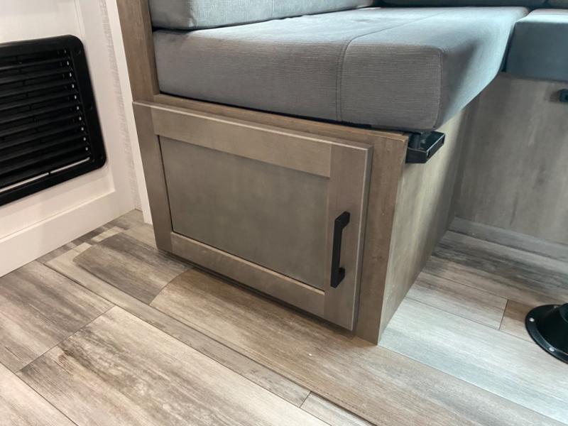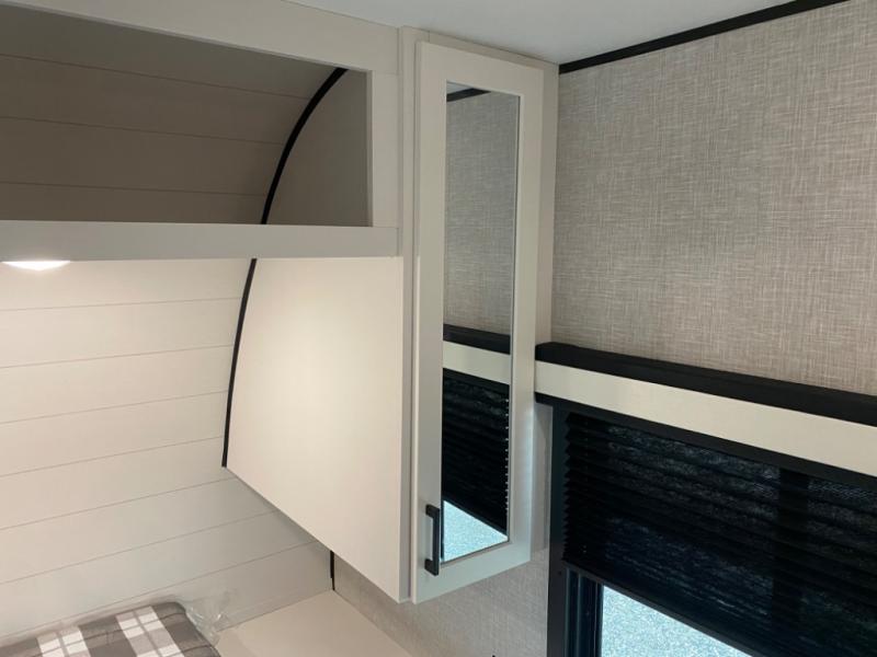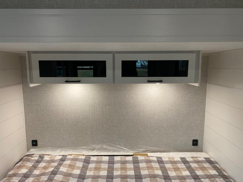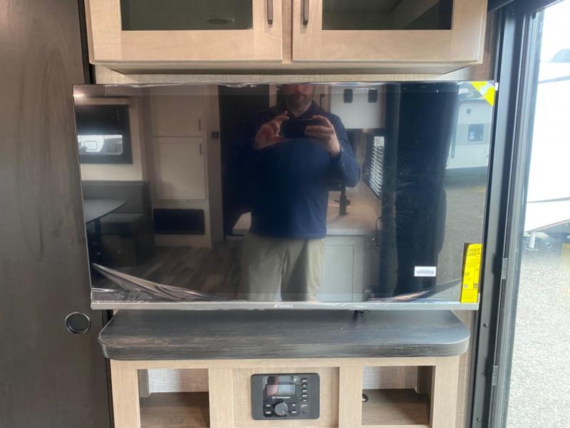 With two private bedrooms, everyone will have a comfortable place to sleep in this travel trailer! The front private bedroom has a 60" x 75" queen bed with wardrobes on either side and the rear private bedroom has a 60" x 80" queen bed slide with a dresser, a wardrobe, one of the exit/entrance doors, and an entrance into the walk-through bathroom which has a radius shower for everyone to stay squeaky clean. The patio doors not only make it easy to enter and exit the unit, but also bring in tons of natural lighting. After you have prepared a delicious home cooked meal, you can can head to the U-shaped dinette to enjoy it there comfortably then relax on the Jack-knife sofa across from the entertainment center!
