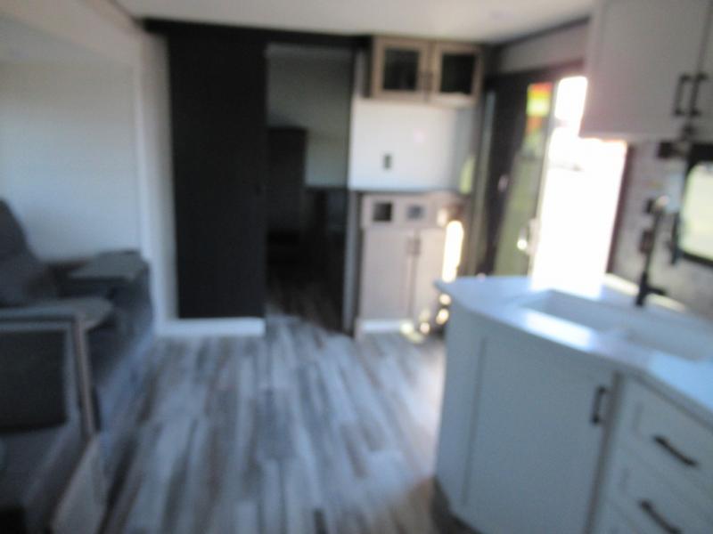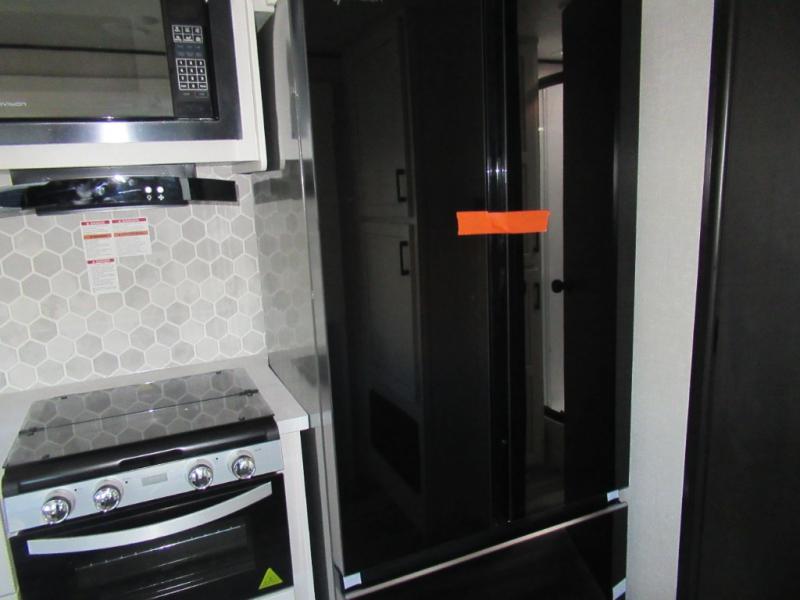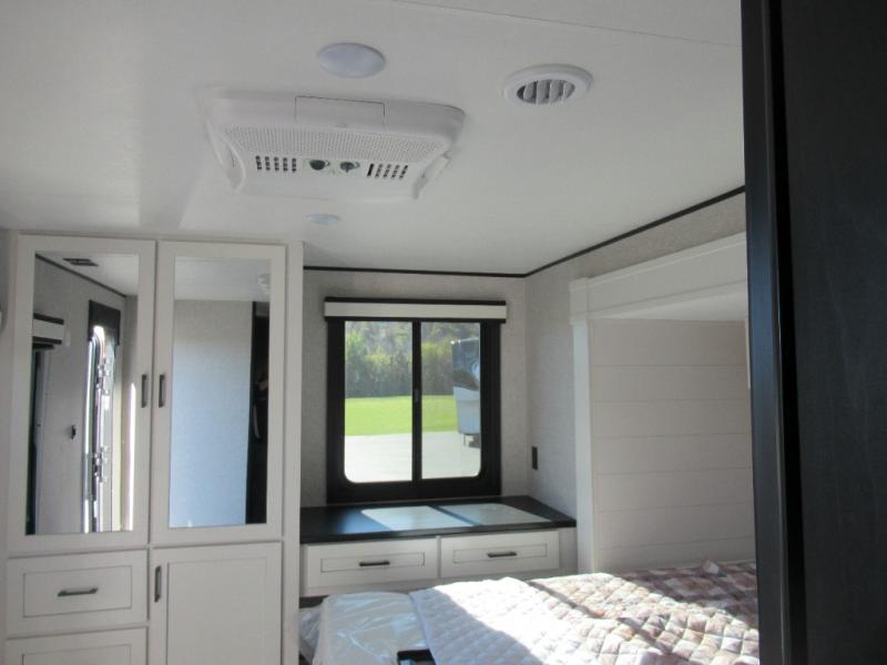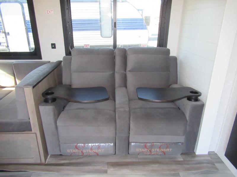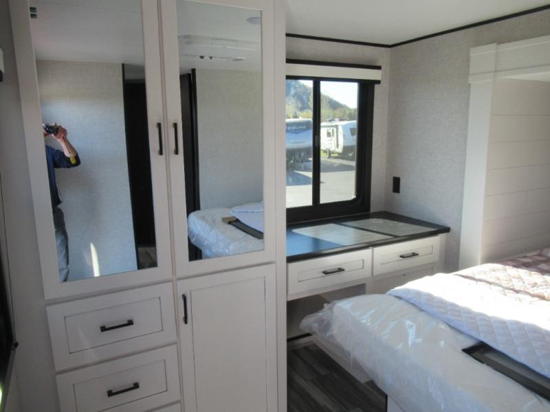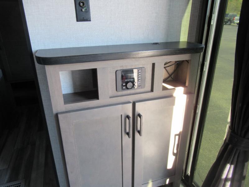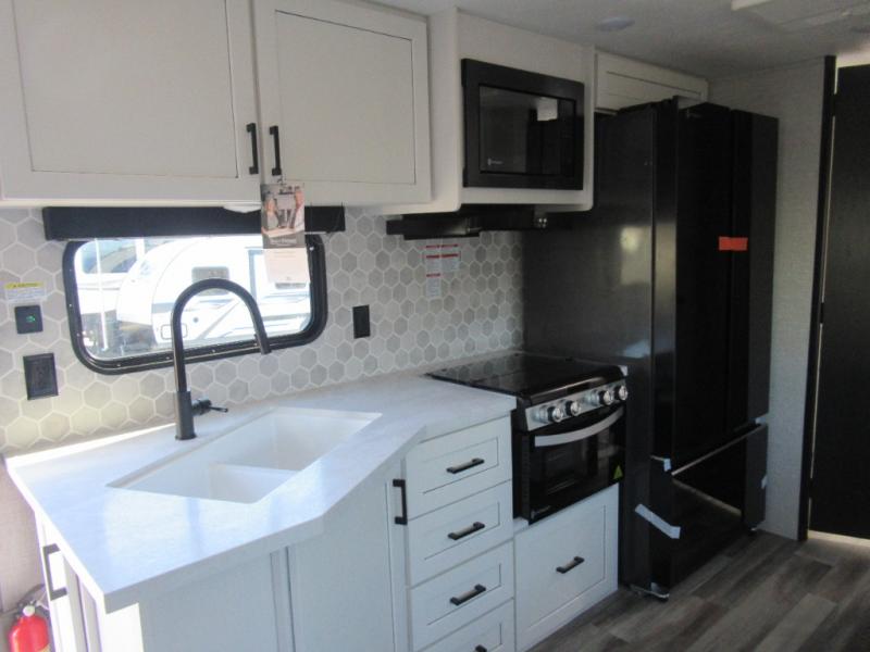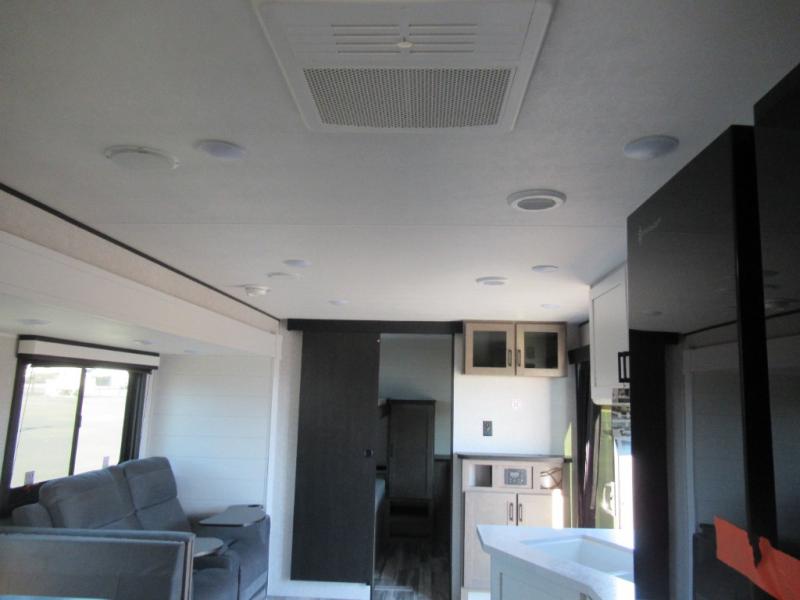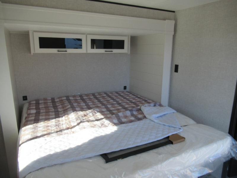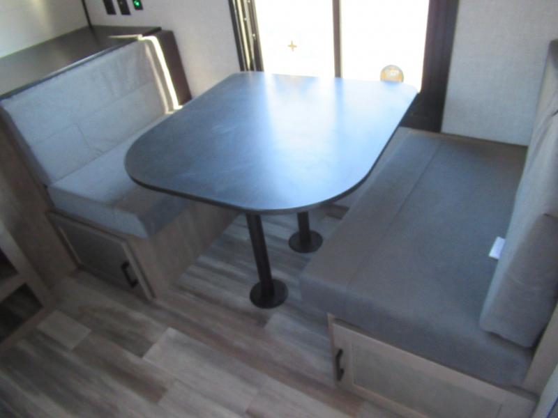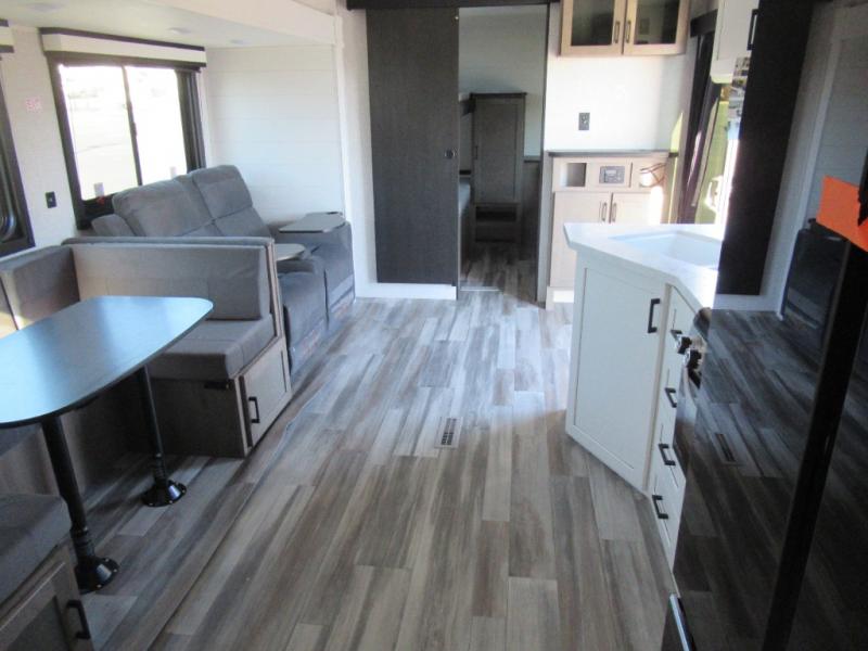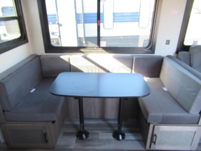 With two private bedrooms, everyone will have a comfortable place to sleep in this travel trailer! The front private bedroom has a 60" x 75" queen bed with wardrobes on either side and the rear private bedroom has a 60" x 80" queen bed slide with a dresser, a wardrobe, one of the exit/entrance doors, and an entrance into the walk-through bathroom which has a radius shower for everyone to stay squeaky clean. The patio doors not only make it easy to enter and exit the unit, but also bring in tons of natural lighting. After you have prepared a delicious home cooked meal, you can can head to the U-shaped dinette to enjoy it there comfortably then relax on the Jack-knife sofa across from the entertainment center!