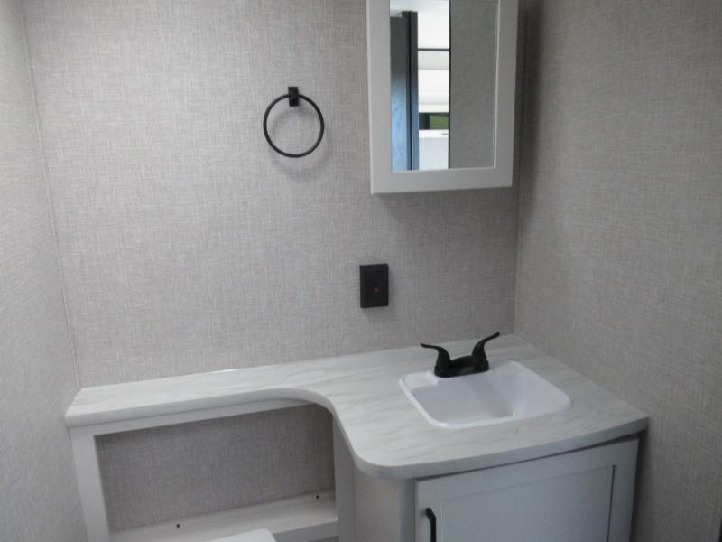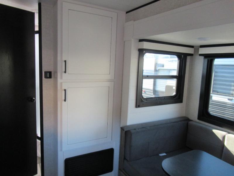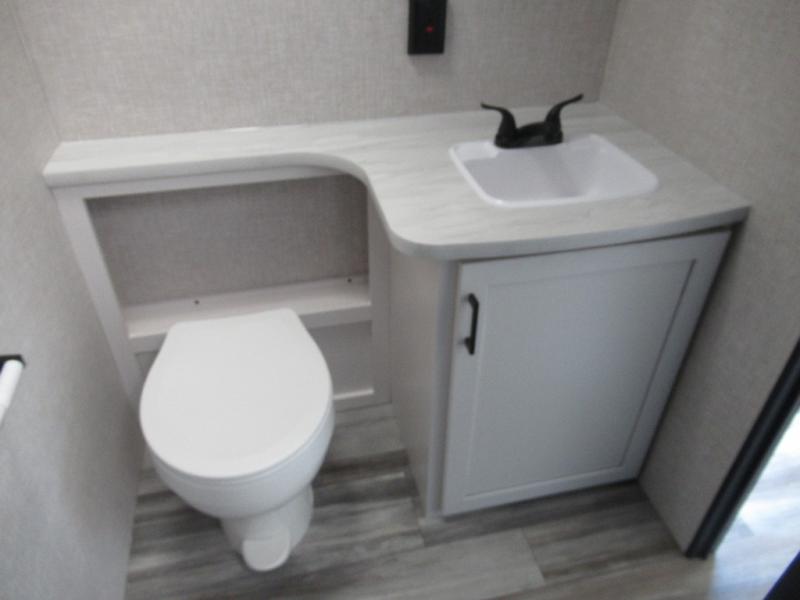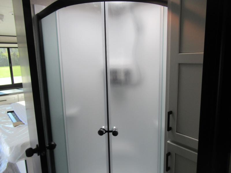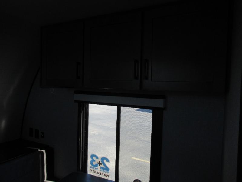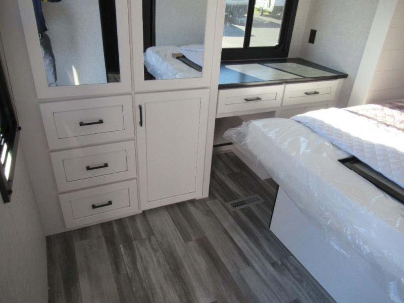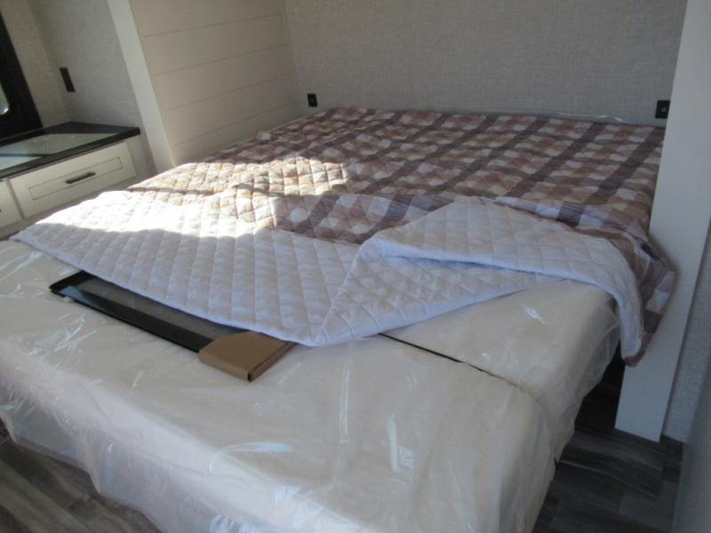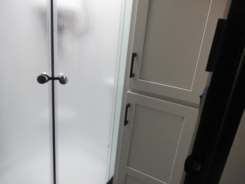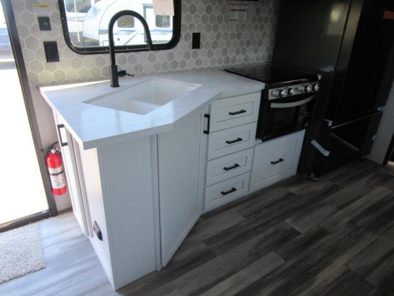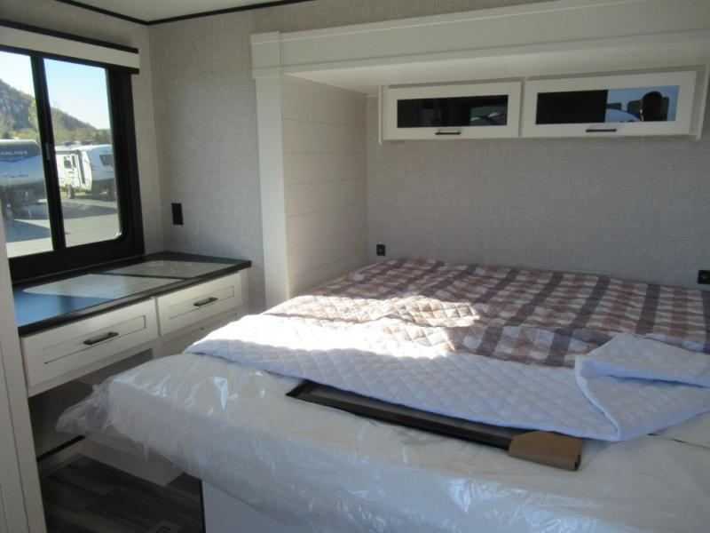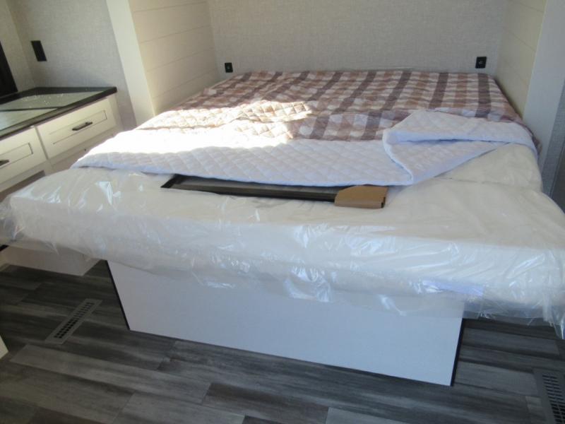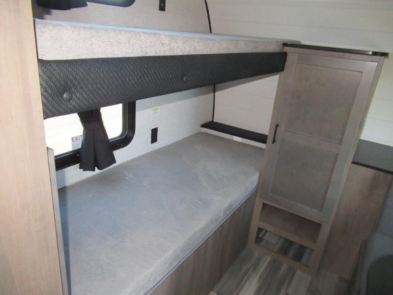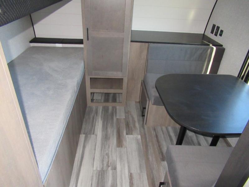 With two private bedrooms, everyone will have a comfortable place to sleep in this travel trailer! The front private bedroom has a 60" x 75" queen bed with wardrobes on either side and the rear private bedroom has a 60" x 80" queen bed slide with a dresser, a wardrobe, one of the exit/entrance doors, and an entrance into the walk-through bathroom which has a radius shower for everyone to stay squeaky clean. The patio doors not only make it easy to enter and exit the unit, but also bring in tons of natural lighting. After you have prepared a delicious home cooked meal, you can can head to the U-shaped dinette to enjoy it there comfortably then relax on the Jack-knife sofa across from the entertainment center!