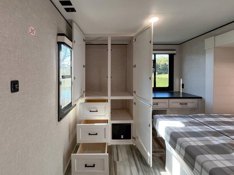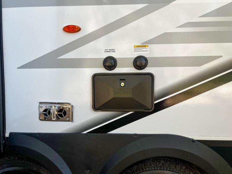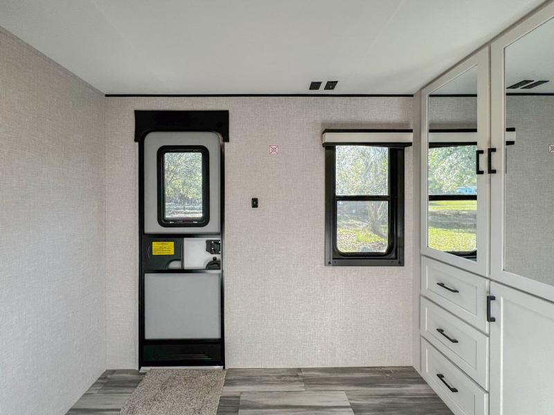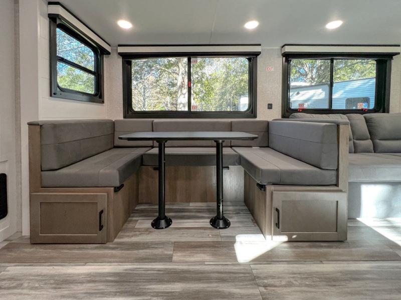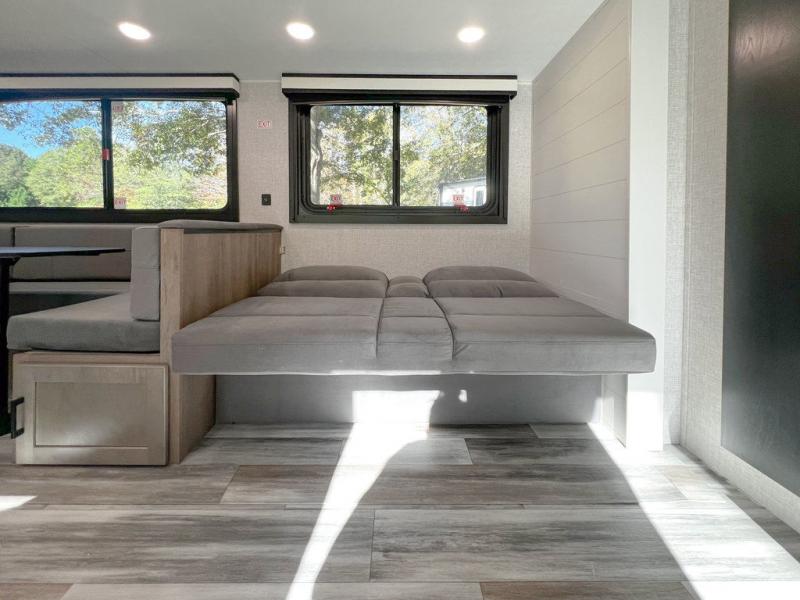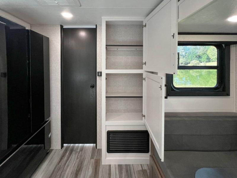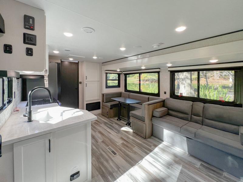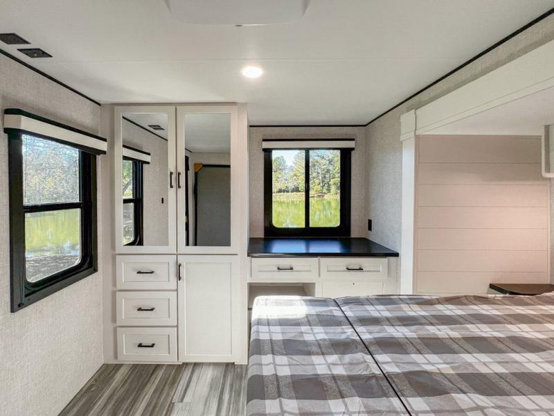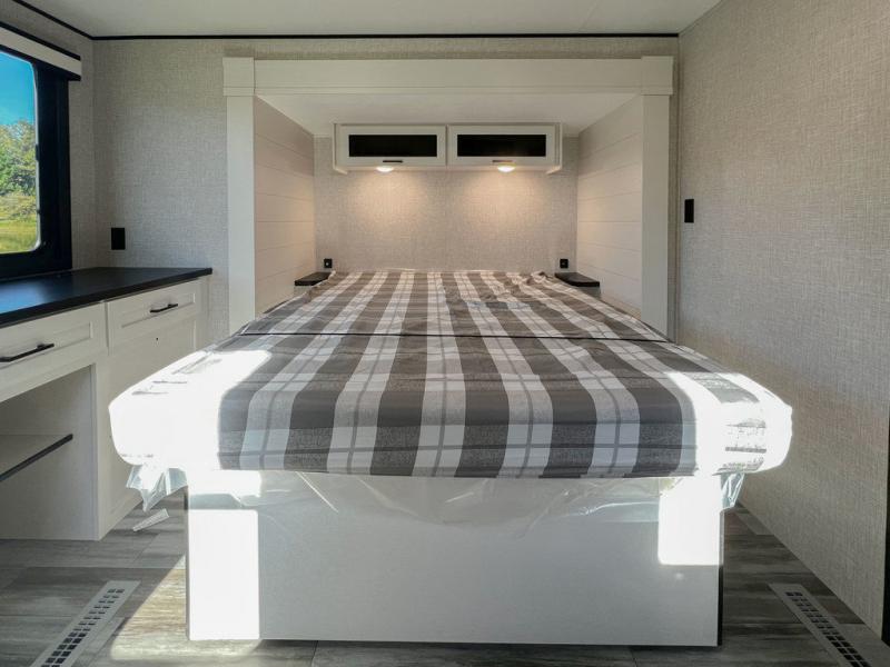 With two private bedrooms, everyone will have a comfortable place to sleep in this travel trailer! The front private bedroom has a 60" x 75" queen bed with wardrobes on either side and the rear private bedroom has a 60" x 80" queen bed slide with a dresser, a wardrobe, one of the exit/entrance doors, and an entrance into the walk-through bathroom which has a radius shower for everyone to stay squeaky clean. The patio doors not only make it easy to enter and exit the unit, but also bring in tons of natural lighting. After you have prepared a delicious home cooked meal, you can can head to the U-shaped dinette to enjoy it there comfortably then relax on the Jack-knife sofa across from the entertainment center!