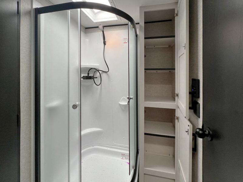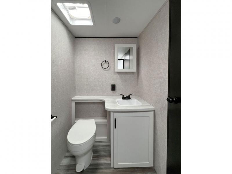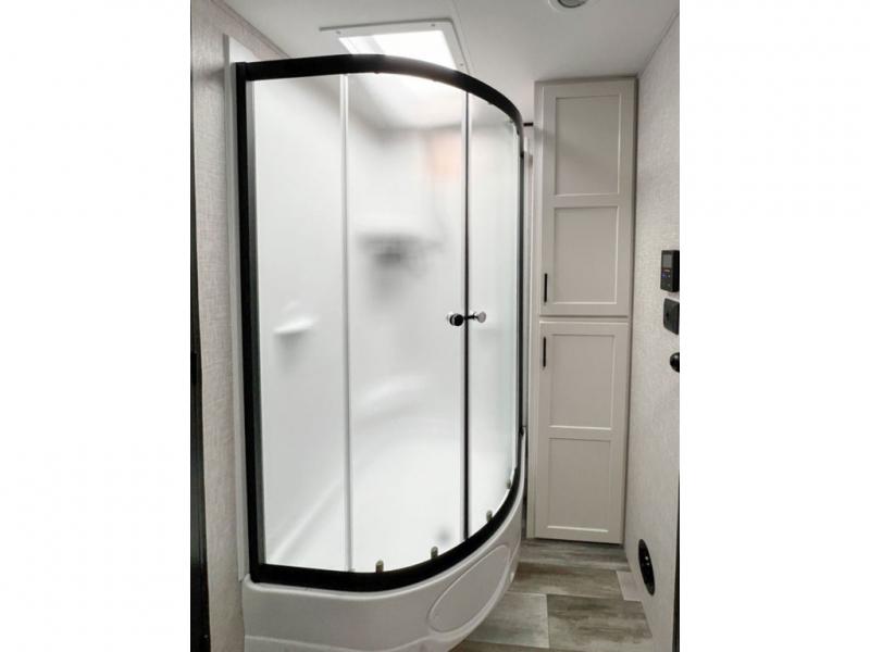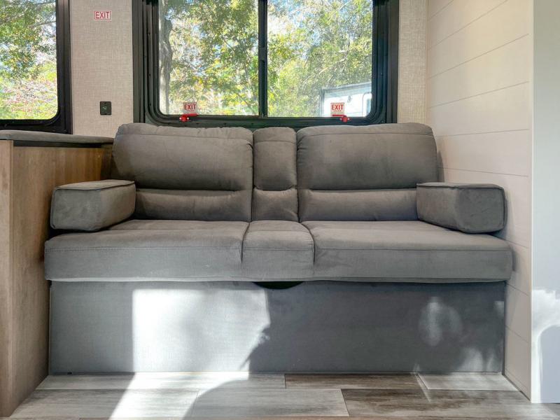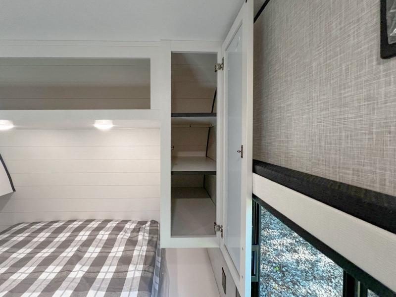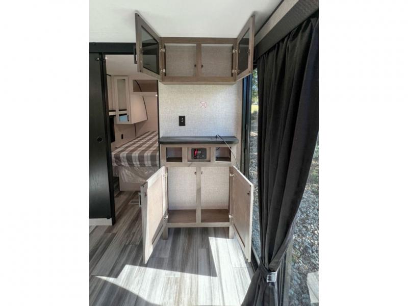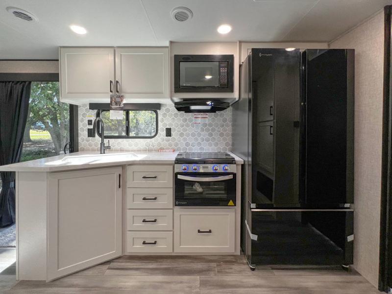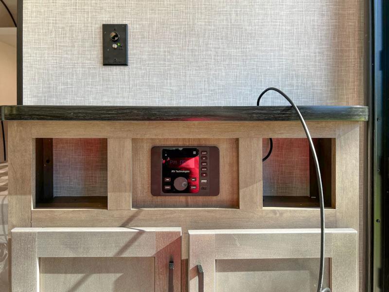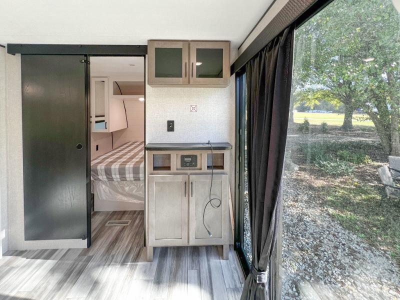 With two private bedrooms, everyone will have a comfortable place to sleep in this travel trailer! The front private bedroom has a 60" x 75" queen bed with wardrobes on either side and the rear private bedroom has a 60" x 80" queen bed slide with a dresser, a wardrobe, one of the exit/entrance doors, and an entrance into the walk-through bathroom which has a radius shower for everyone to stay squeaky clean. The patio doors not only make it easy to enter and exit the unit, but also bring in tons of natural lighting. After you have prepared a delicious home cooked meal, you can can head to the U-shaped dinette to enjoy it there comfortably then relax on the Jack-knife sofa across from the entertainment center!