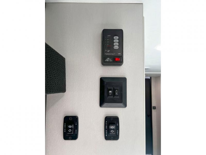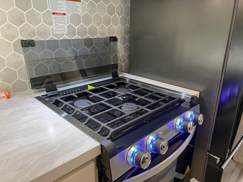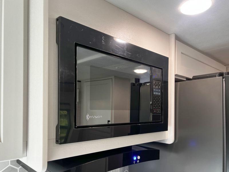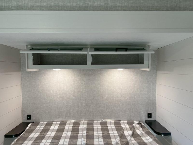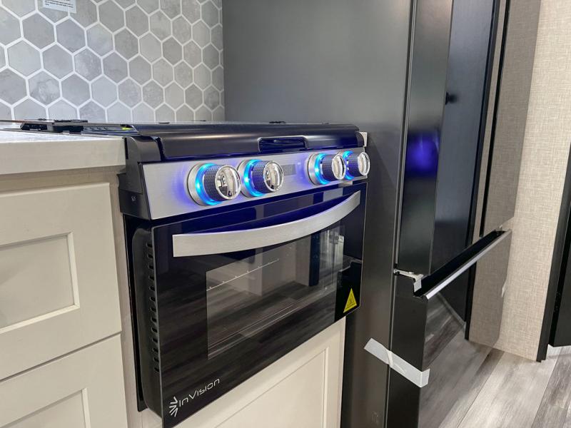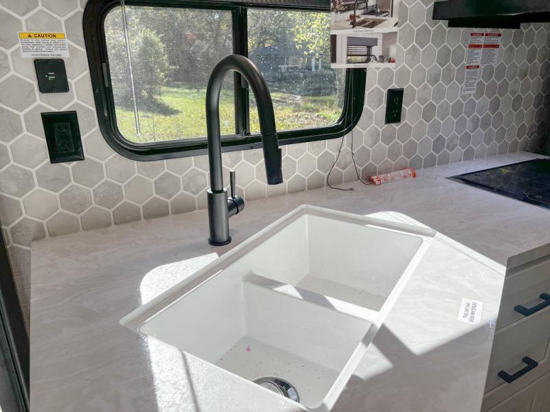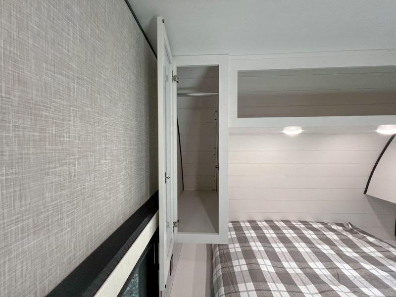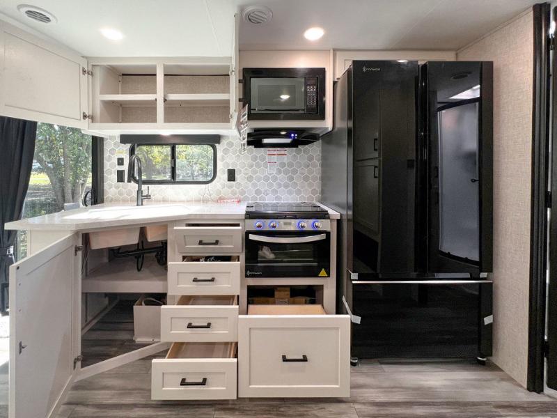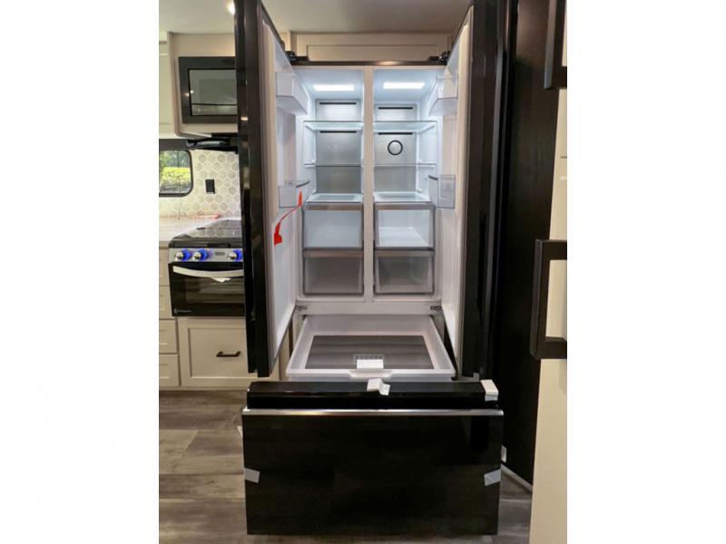 With two private bedrooms, everyone will have a comfortable place to sleep in this travel trailer! The front private bedroom has a 60" x 75" queen bed with wardrobes on either side and the rear private bedroom has a 60" x 80" queen bed slide with a dresser, a wardrobe, one of the exit/entrance doors, and an entrance into the walk-through bathroom which has a radius shower for everyone to stay squeaky clean. The patio doors not only make it easy to enter and exit the unit, but also bring in tons of natural lighting. After you have prepared a delicious home cooked meal, you can can head to the U-shaped dinette to enjoy it there comfortably then relax on the Jack-knife sofa across from the entertainment center!