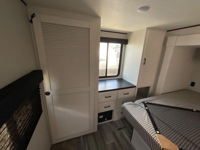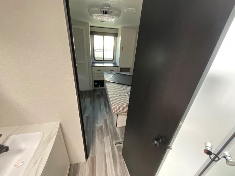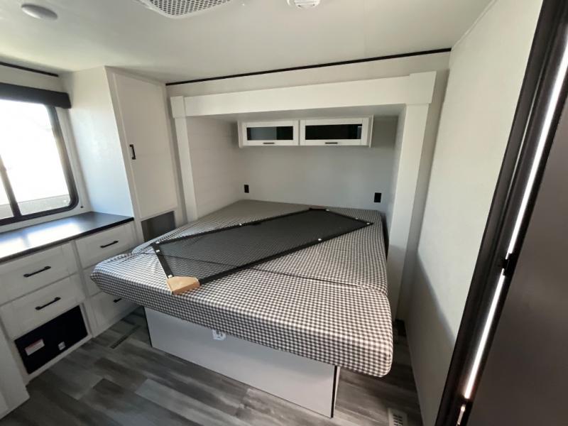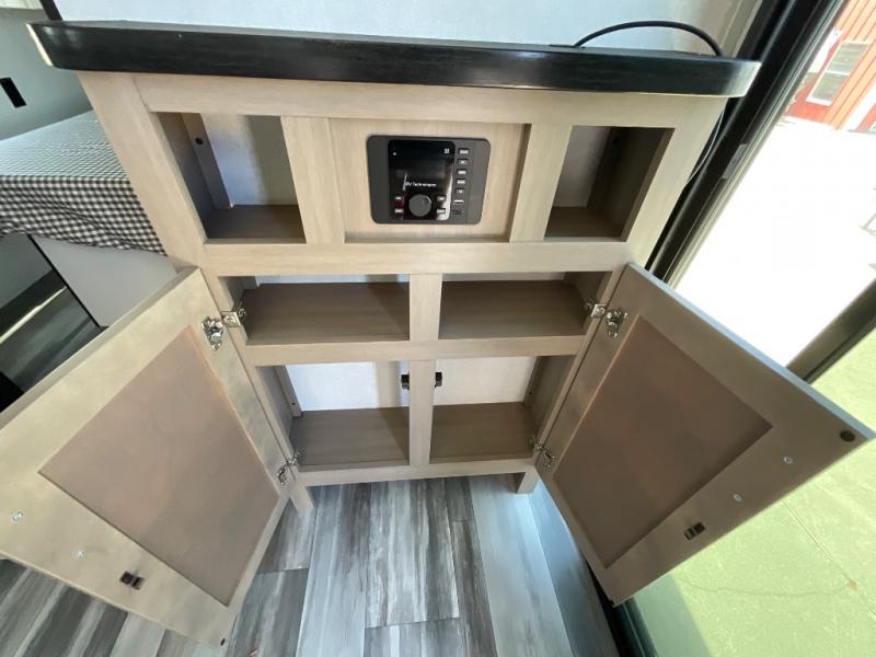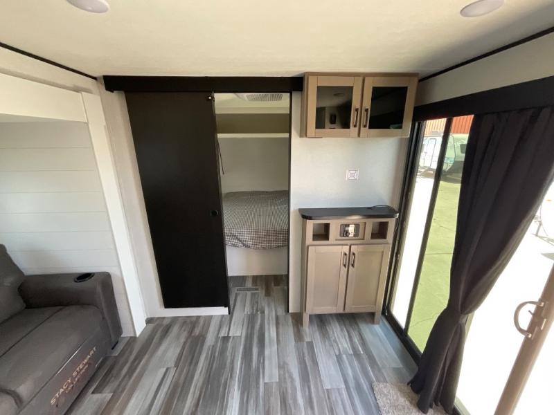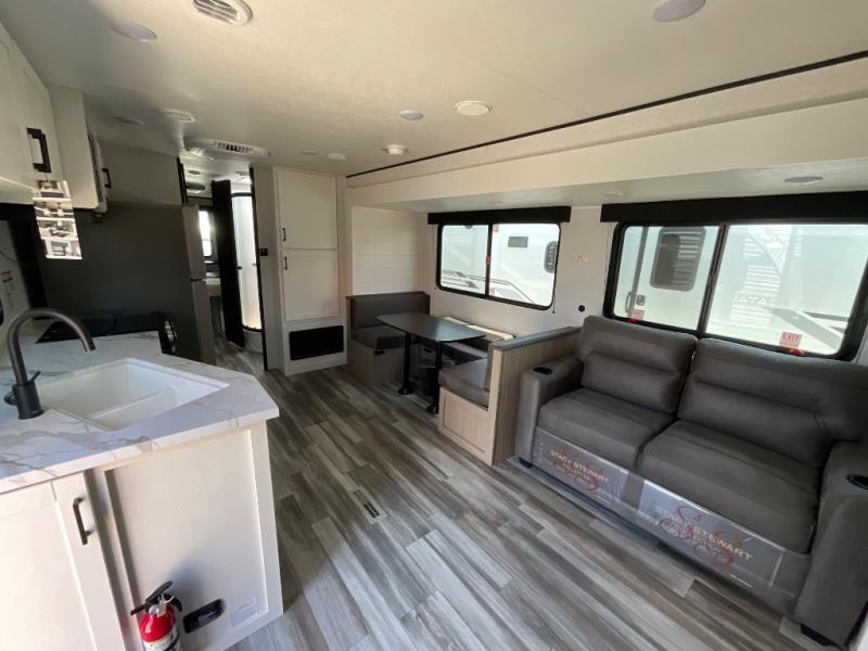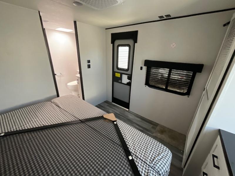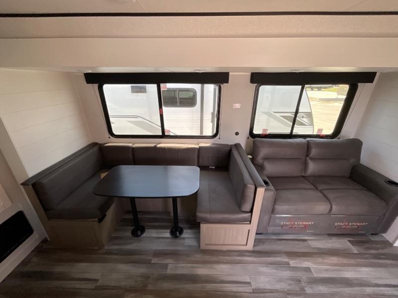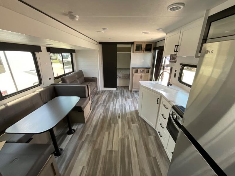 With two private bedrooms, everyone will have a comfortable place to sleep in this travel trailer! The front private bedroom has a 60" x 75" queen bed with wardrobes on either side and the rear private bedroom has a 60" x 80" queen bed slide with a dresser, a wardrobe, one of the exit/entrance doors, and an entrance into the walk-through bathroom which has a radius shower for everyone to stay squeaky clean. The patio doors not only make it easy to enter and exit the unit, but also bring in tons of natural lighting. After you have prepared a delicious home cooked meal, you can can head to the U-shaped dinette to enjoy it there comfortably then relax on the Jack-knife sofa across from the entertainment center!