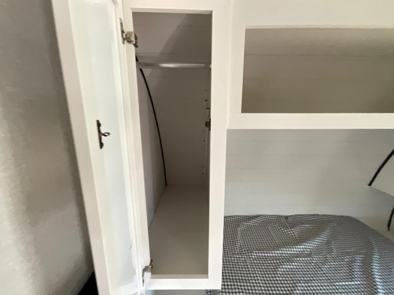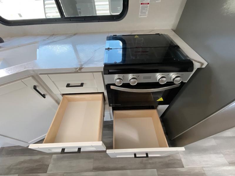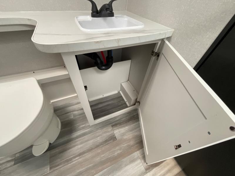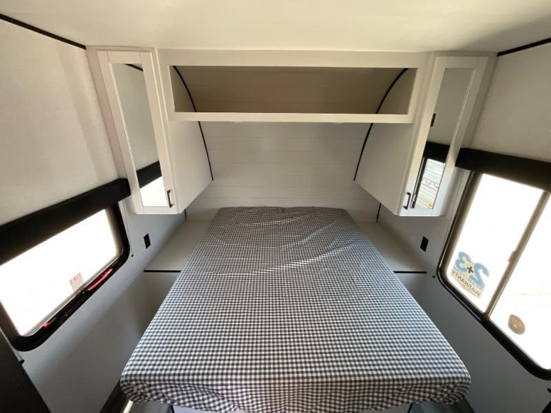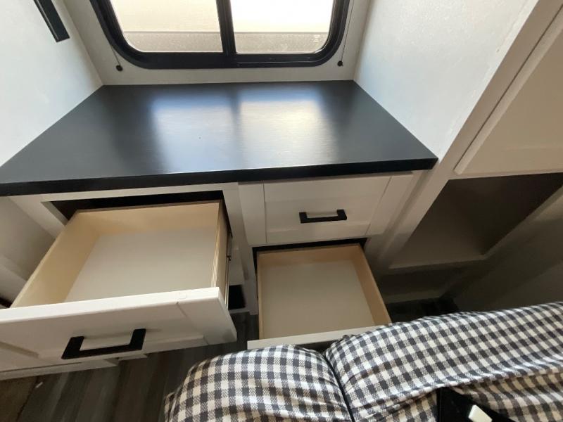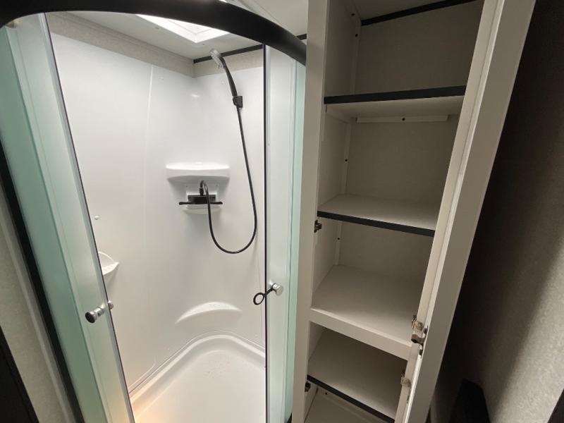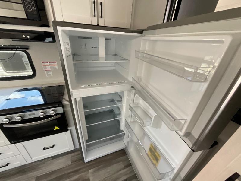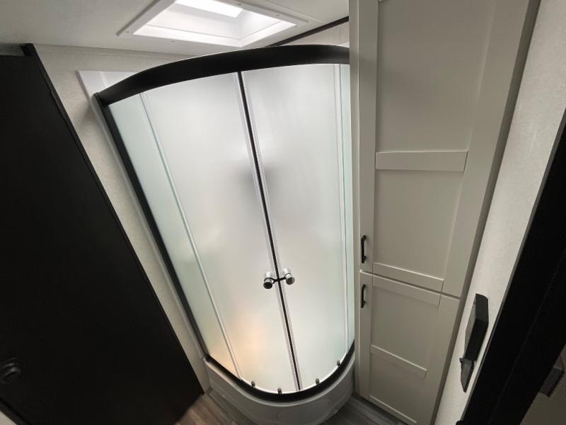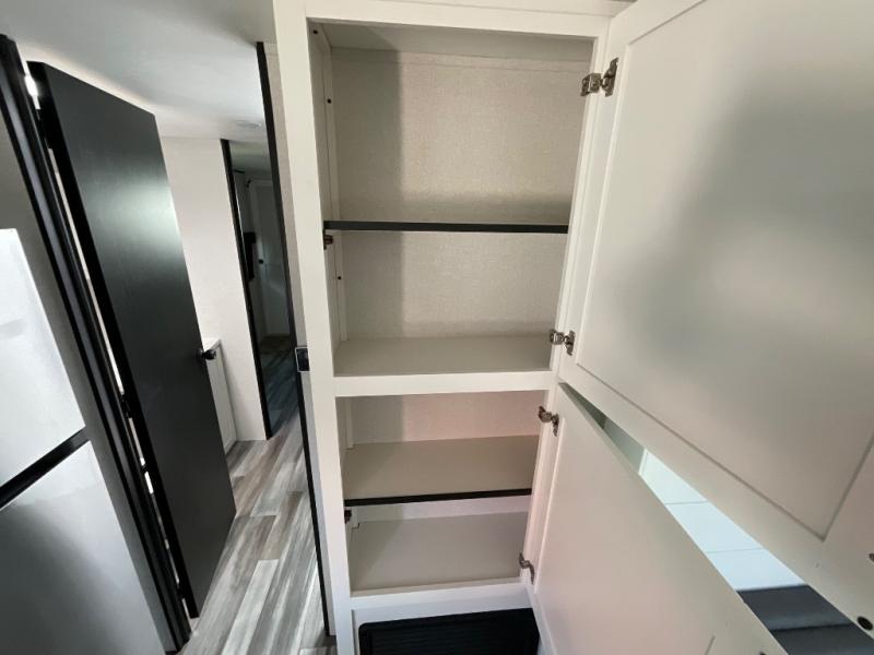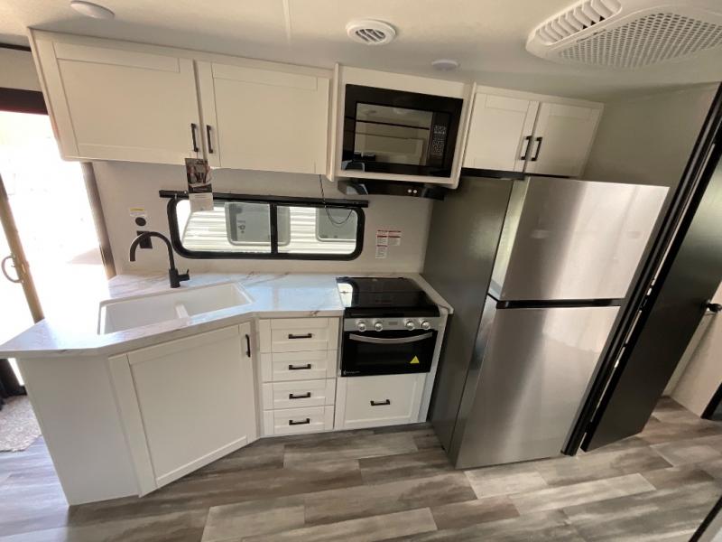 With two private bedrooms, everyone will have a comfortable place to sleep in this travel trailer! The front private bedroom has a 60" x 75" queen bed with wardrobes on either side and the rear private bedroom has a 60" x 80" queen bed slide with a dresser, a wardrobe, one of the exit/entrance doors, and an entrance into the walk-through bathroom which has a radius shower for everyone to stay squeaky clean. The patio doors not only make it easy to enter and exit the unit, but also bring in tons of natural lighting. After you have prepared a delicious home cooked meal, you can can head to the U-shaped dinette to enjoy it there comfortably then relax on the Jack-knife sofa across from the entertainment center!