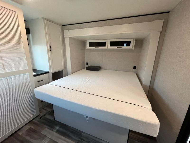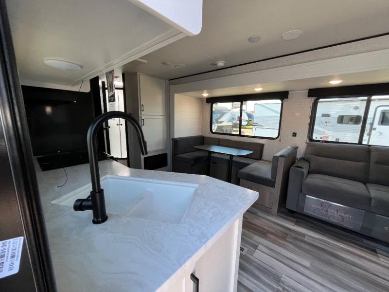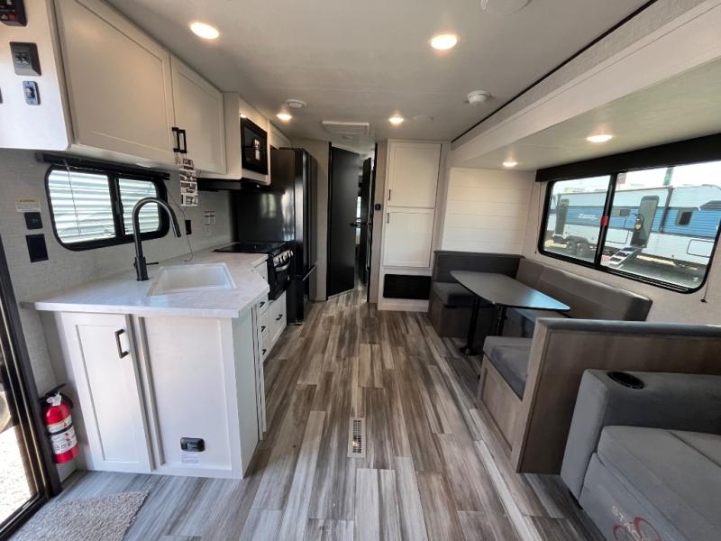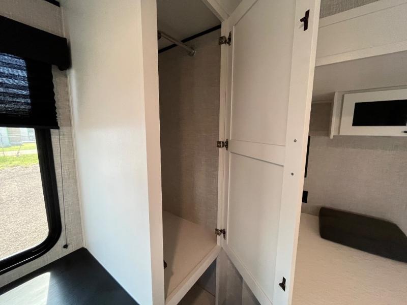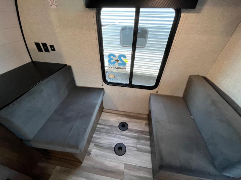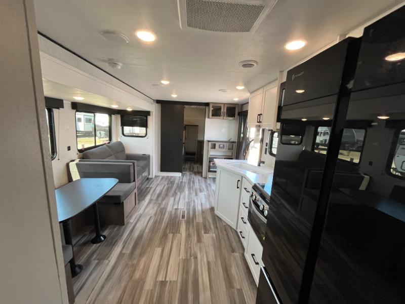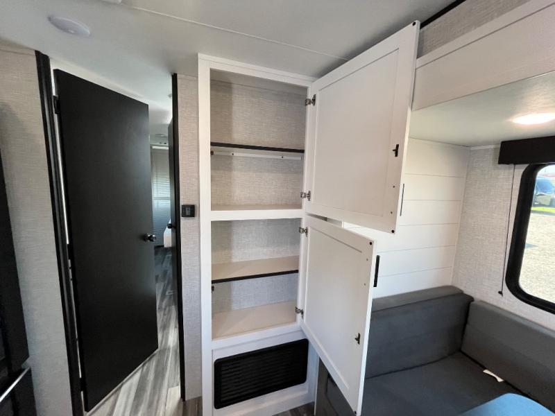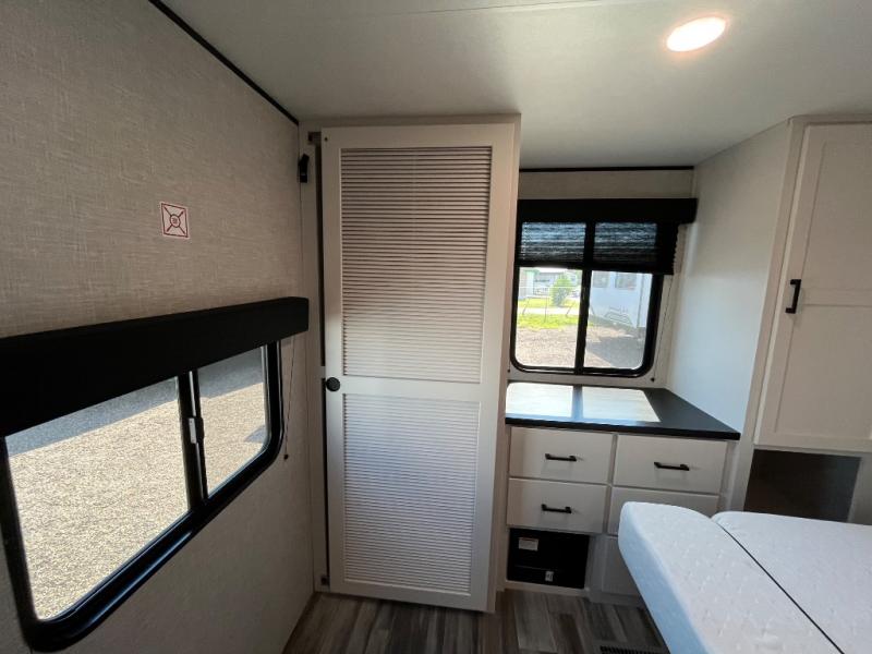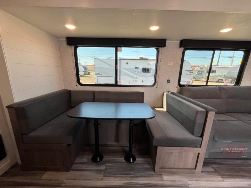 With two private bedrooms, everyone will have a comfortable place to sleep in this travel trailer! The front private bedroom has a 60" x 75" queen bed with wardrobes on either side and the rear private bedroom has a 60" x 80" queen bed slide with a dresser, a wardrobe, one of the exit/entrance doors, and an entrance into the walk-through bathroom which has a radius shower for everyone to stay squeaky clean. The patio doors not only make it easy to enter and exit the unit, but also bring in tons of natural lighting. After you have prepared a delicious home cooked meal, you can can head to the U-shaped dinette to enjoy it there comfortably then relax on the Jack-knife sofa across from the entertainment center!