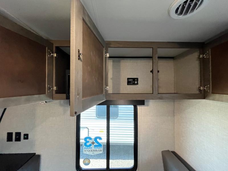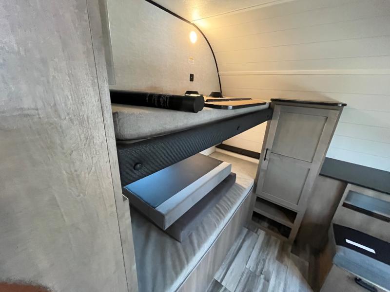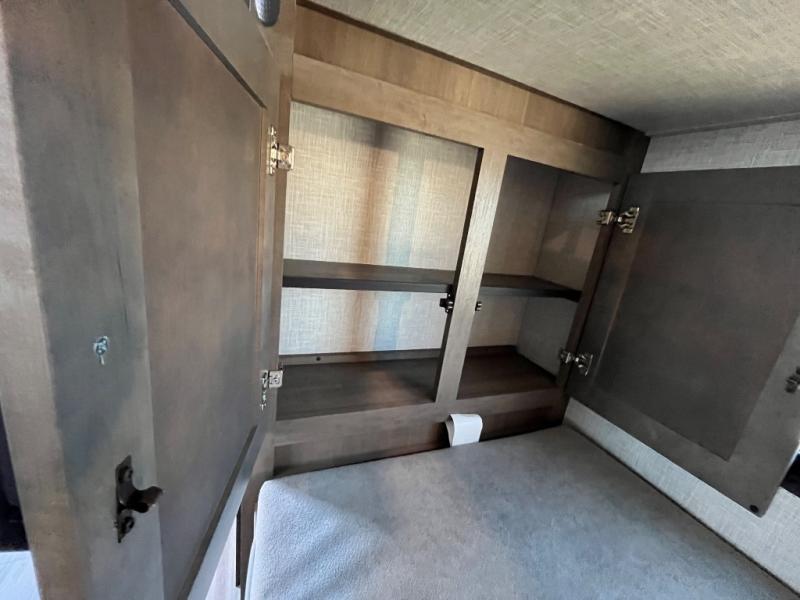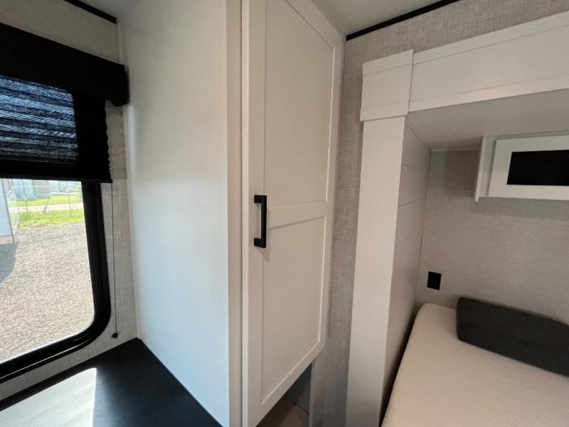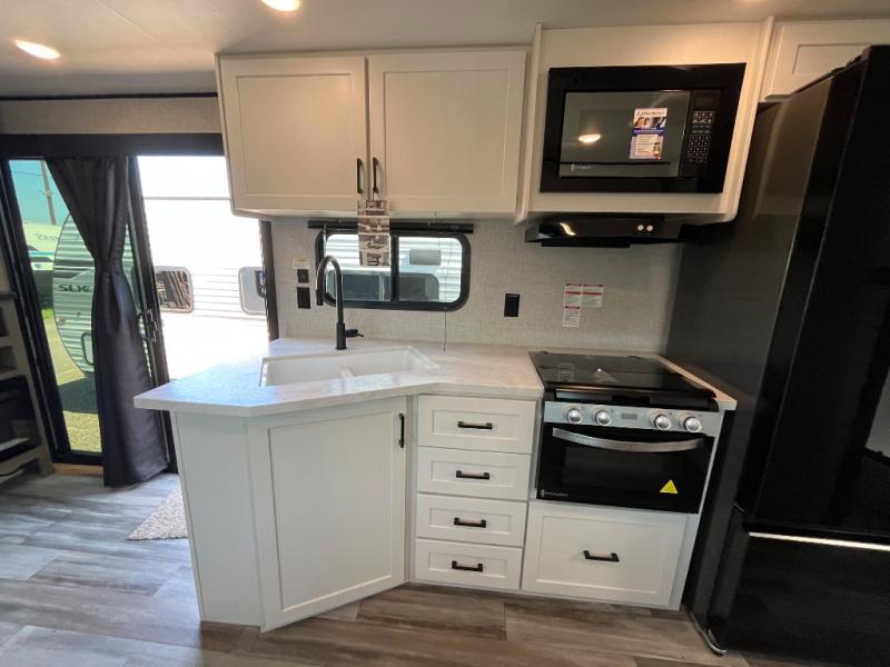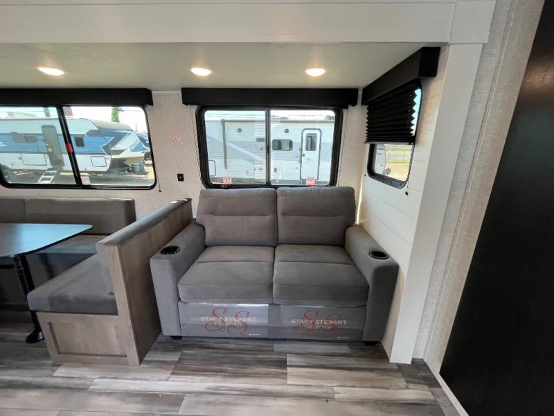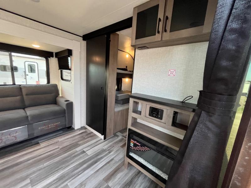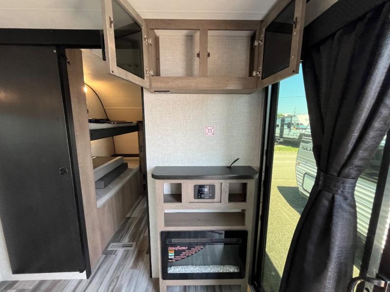 With two private bedrooms, everyone will have a comfortable place to sleep in this travel trailer! The front private bedroom has a 60" x 75" queen bed with wardrobes on either side and the rear private bedroom has a 60" x 80" queen bed slide with a dresser, a wardrobe, one of the exit/entrance doors, and an entrance into the walk-through bathroom which has a radius shower for everyone to stay squeaky clean. The patio doors not only make it easy to enter and exit the unit, but also bring in tons of natural lighting. After you have prepared a delicious home cooked meal, you can can head to the U-shaped dinette to enjoy it there comfortably then relax on the Jack-knife sofa across from the entertainment center!