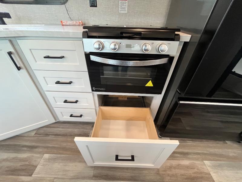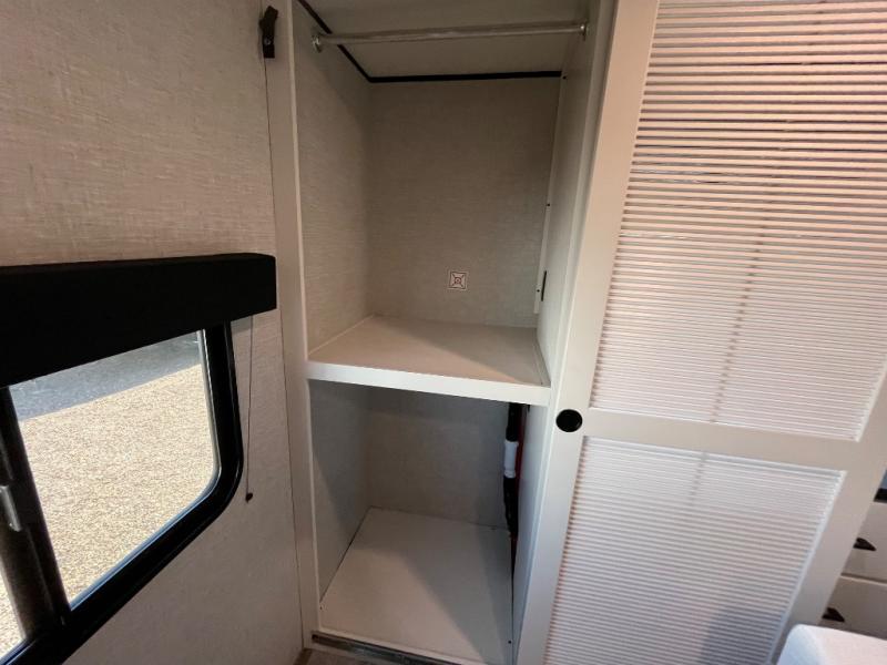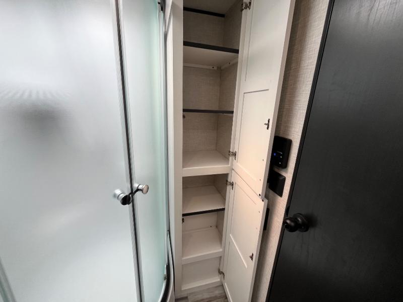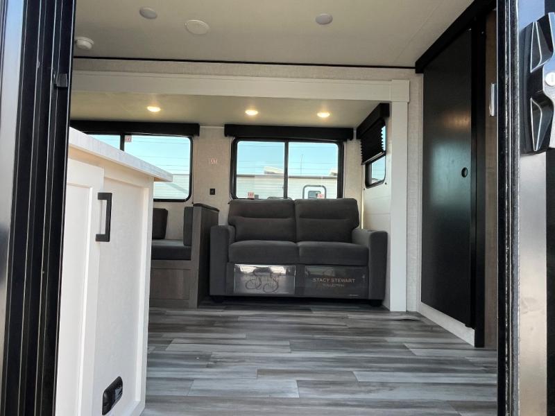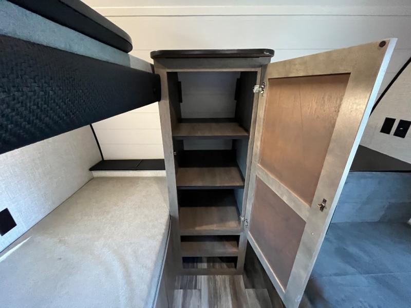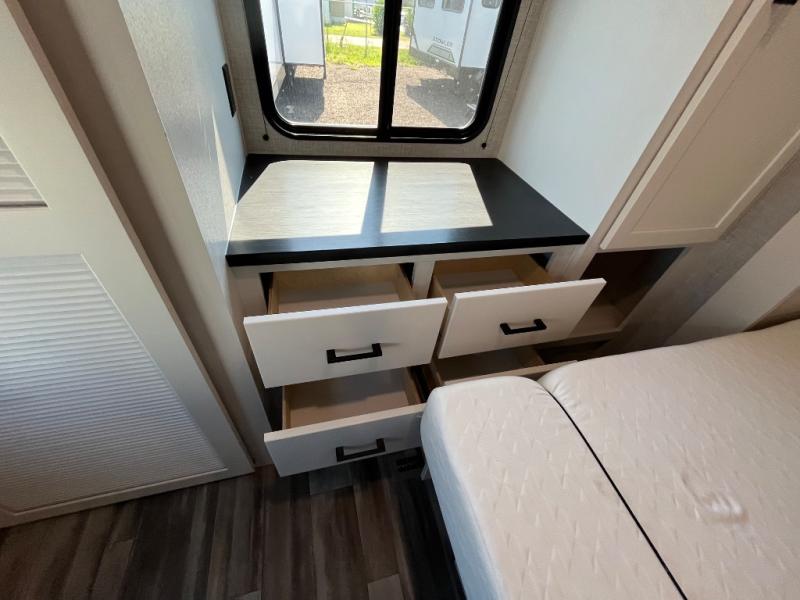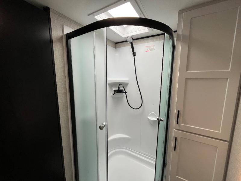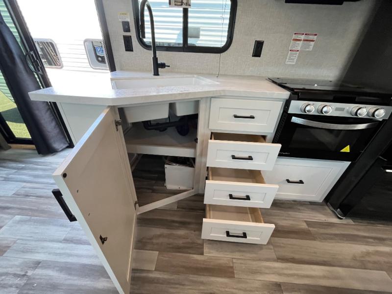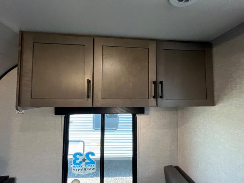 With two private bedrooms, everyone will have a comfortable place to sleep in this travel trailer! The front private bedroom has a 60" x 75" queen bed with wardrobes on either side and the rear private bedroom has a 60" x 80" queen bed slide with a dresser, a wardrobe, one of the exit/entrance doors, and an entrance into the walk-through bathroom which has a radius shower for everyone to stay squeaky clean. The patio doors not only make it easy to enter and exit the unit, but also bring in tons of natural lighting. After you have prepared a delicious home cooked meal, you can can head to the U-shaped dinette to enjoy it there comfortably then relax on the Jack-knife sofa across from the entertainment center!