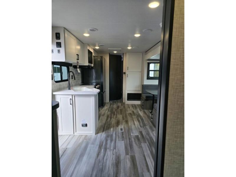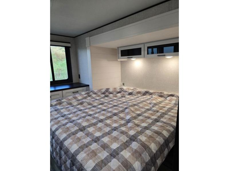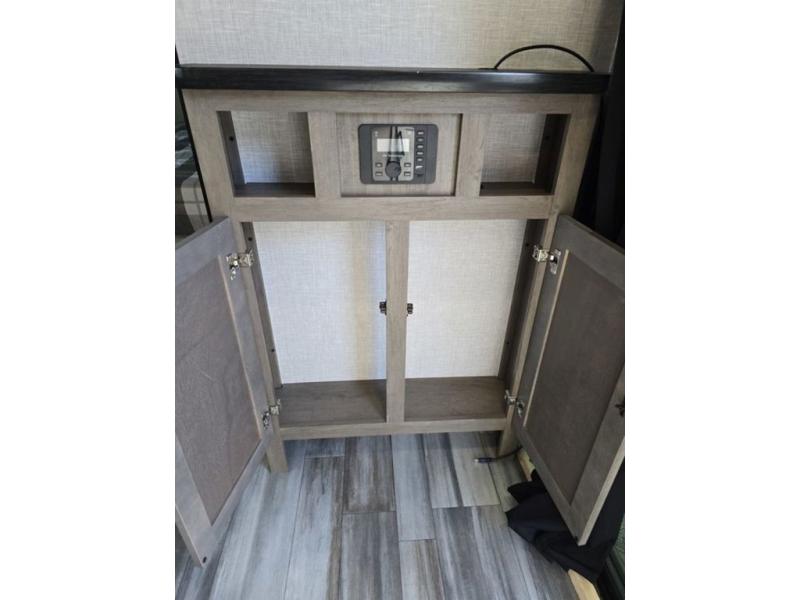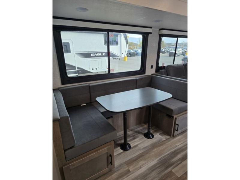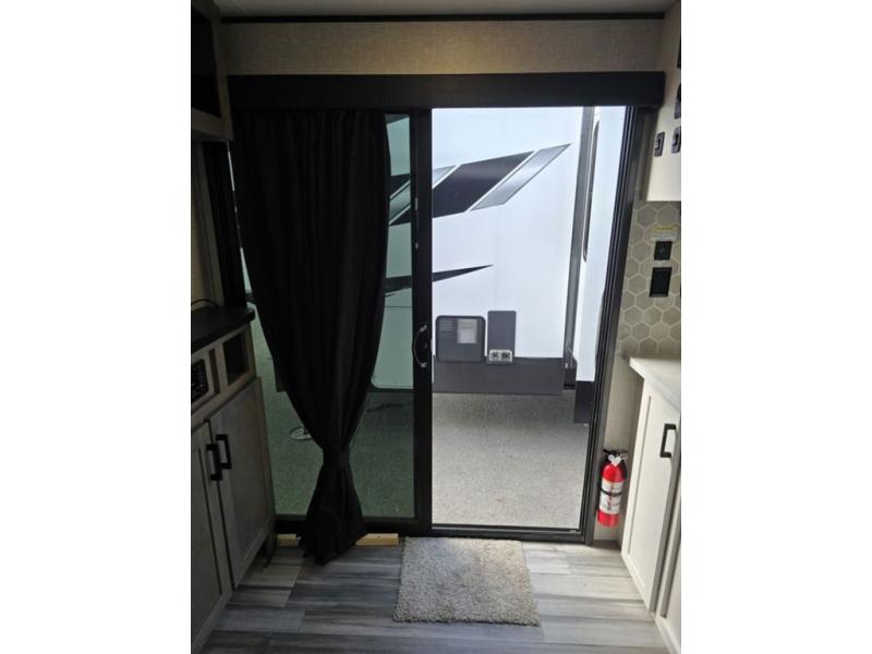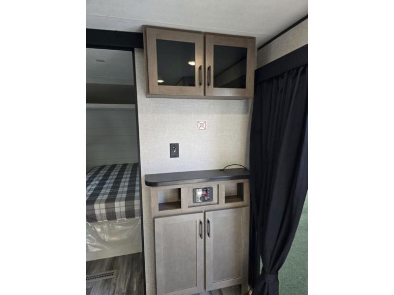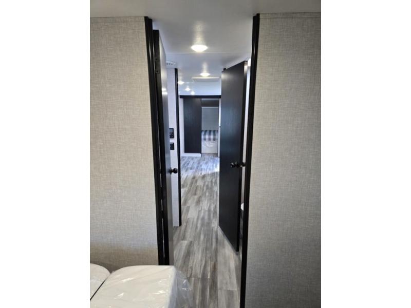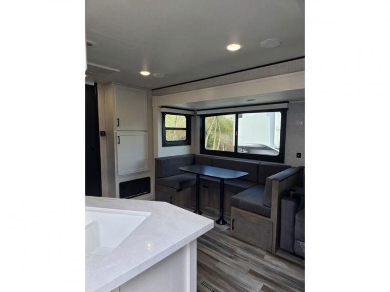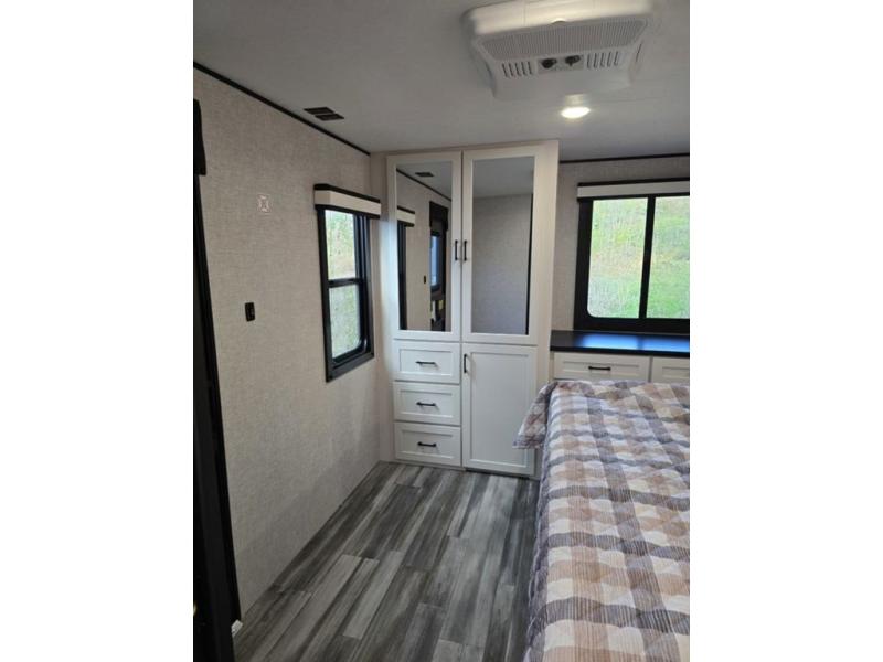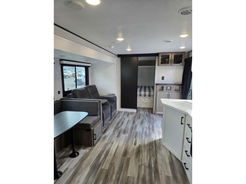 With two private bedrooms, everyone will have a comfortable place to sleep in this travel trailer! The front private bedroom has a 60" x 75" queen bed with wardrobes on either side and the rear private bedroom has a 60" x 80" queen bed slide with a dresser, a wardrobe, one of the exit/entrance doors, and an entrance into the walk-through bathroom which has a radius shower for everyone to stay squeaky clean. The patio doors not only make it easy to enter and exit the unit, but also bring in tons of natural lighting. After you have prepared a delicious home cooked meal, you can can head to the U-shaped dinette to enjoy it there comfortably then relax on the Jack-knife sofa across from the entertainment center!