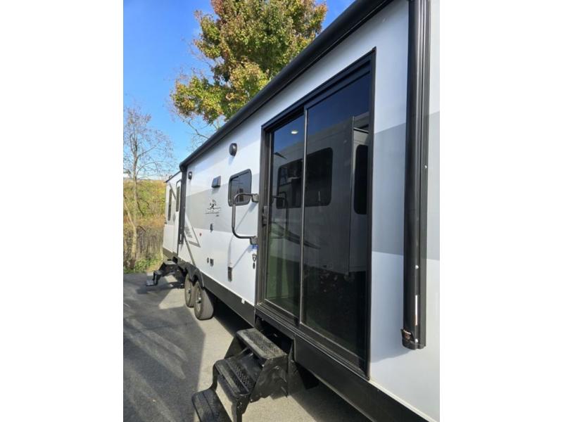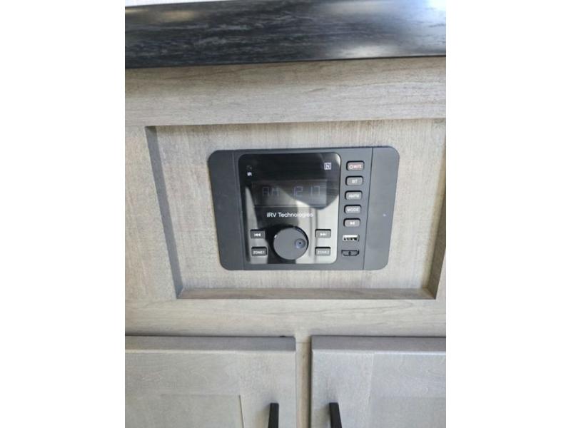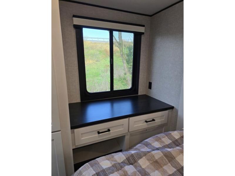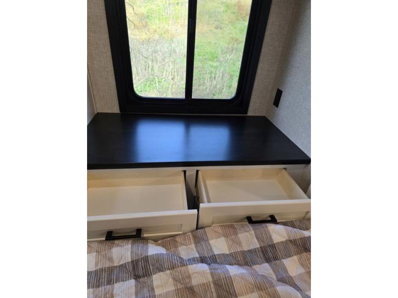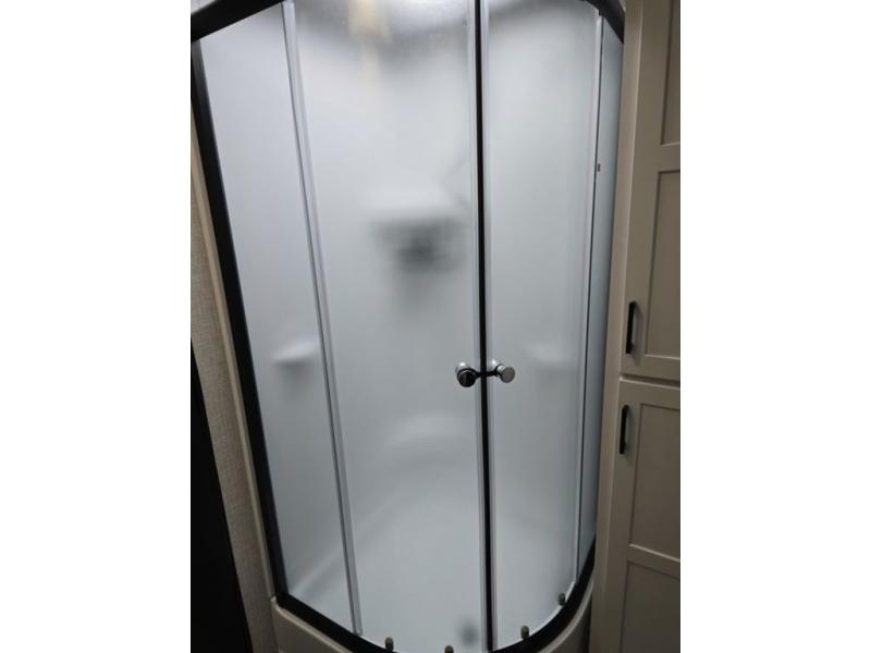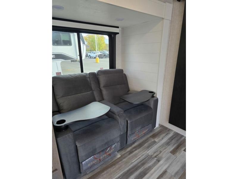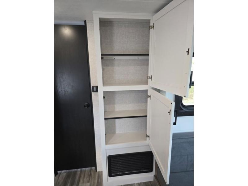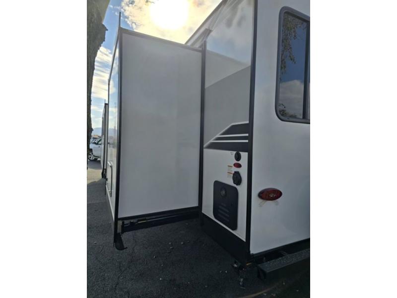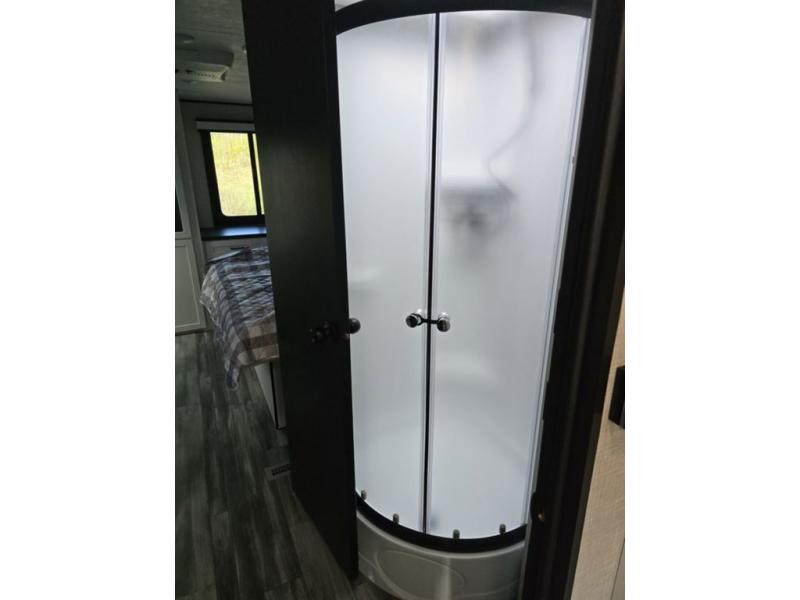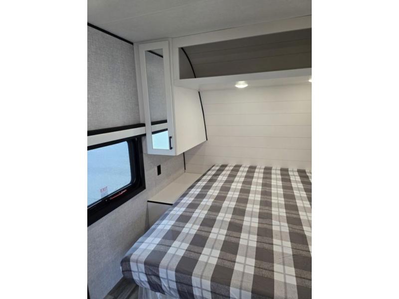 With two private bedrooms, everyone will have a comfortable place to sleep in this travel trailer! The front private bedroom has a 60" x 75" queen bed with wardrobes on either side and the rear private bedroom has a 60" x 80" queen bed slide with a dresser, a wardrobe, one of the exit/entrance doors, and an entrance into the walk-through bathroom which has a radius shower for everyone to stay squeaky clean. The patio doors not only make it easy to enter and exit the unit, but also bring in tons of natural lighting. After you have prepared a delicious home cooked meal, you can can head to the U-shaped dinette to enjoy it there comfortably then relax on the Jack-knife sofa across from the entertainment center!
