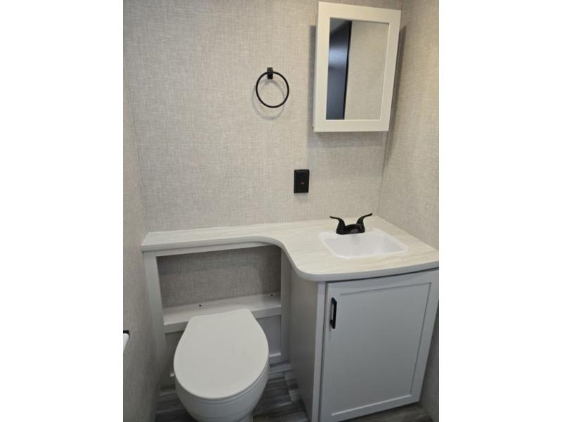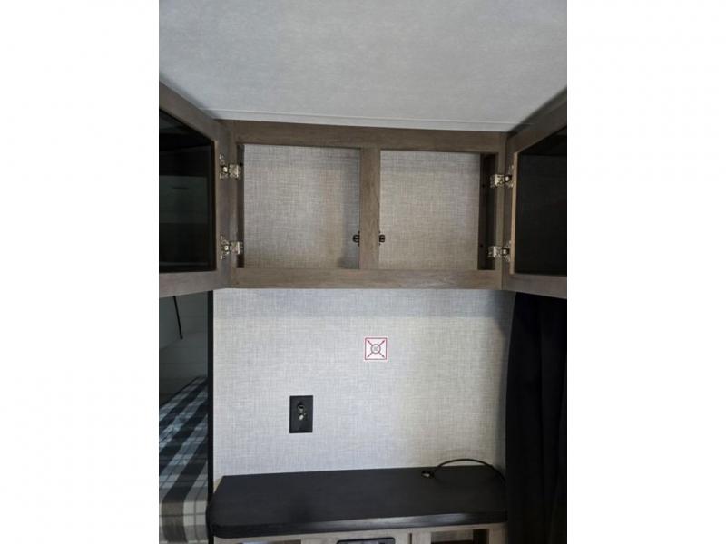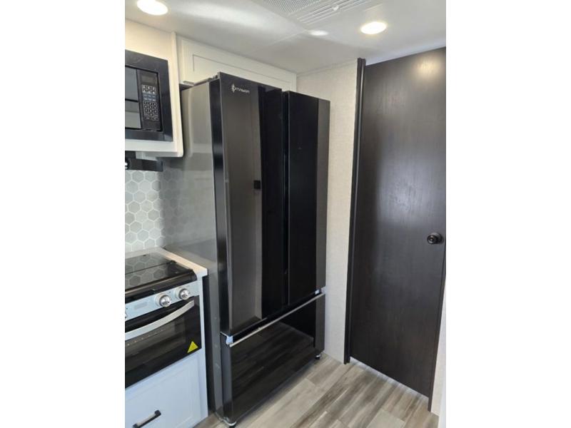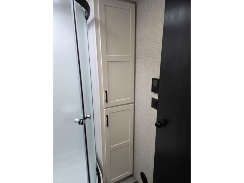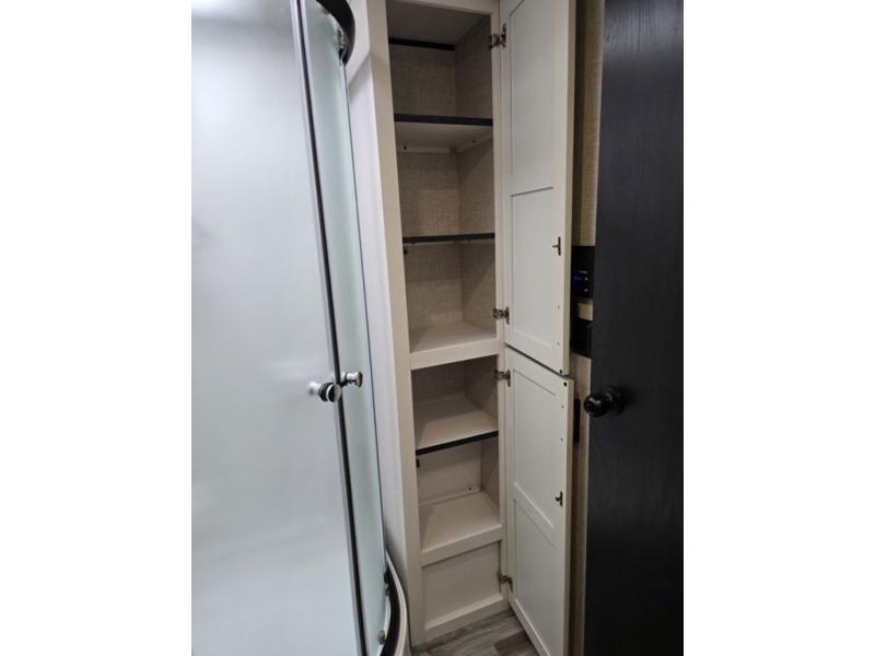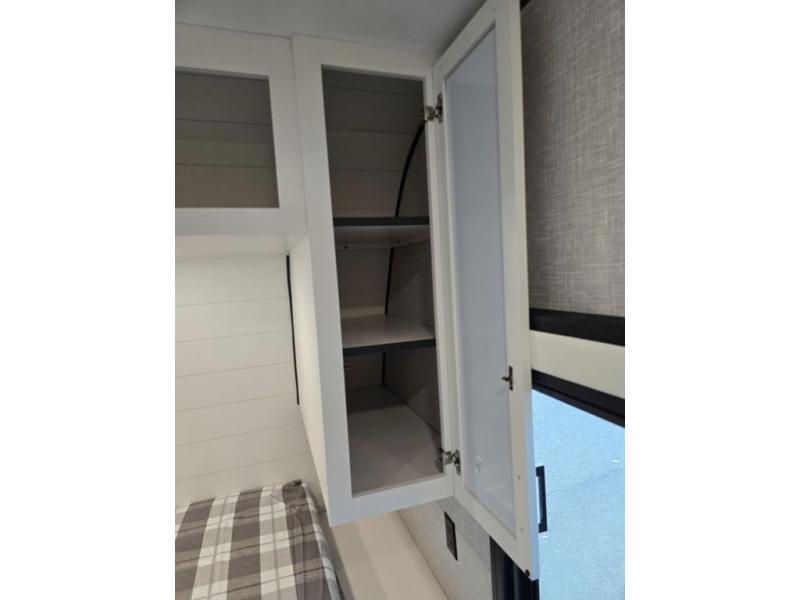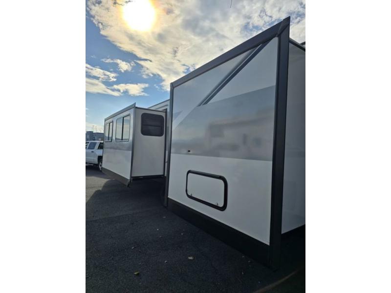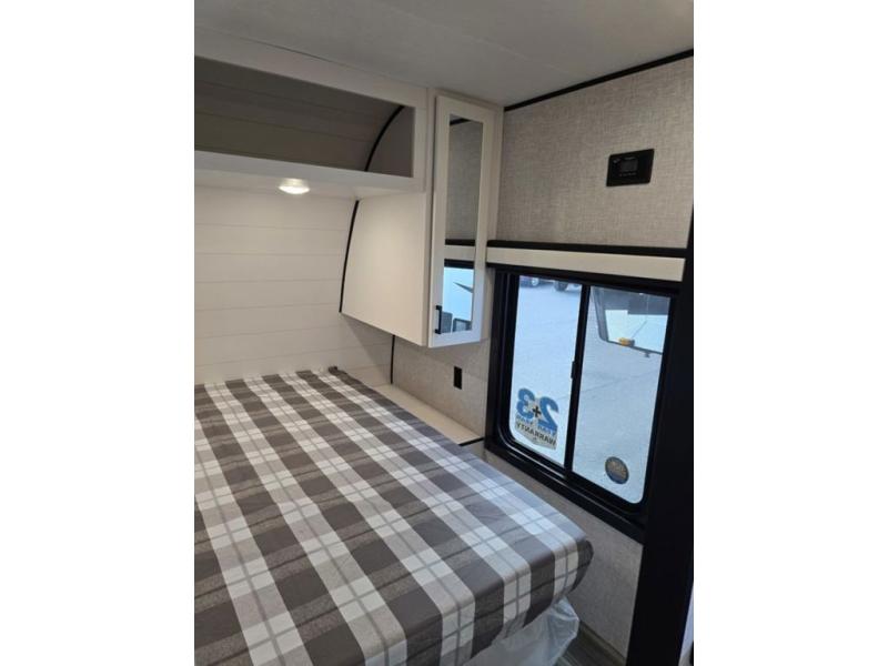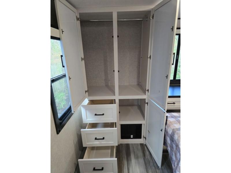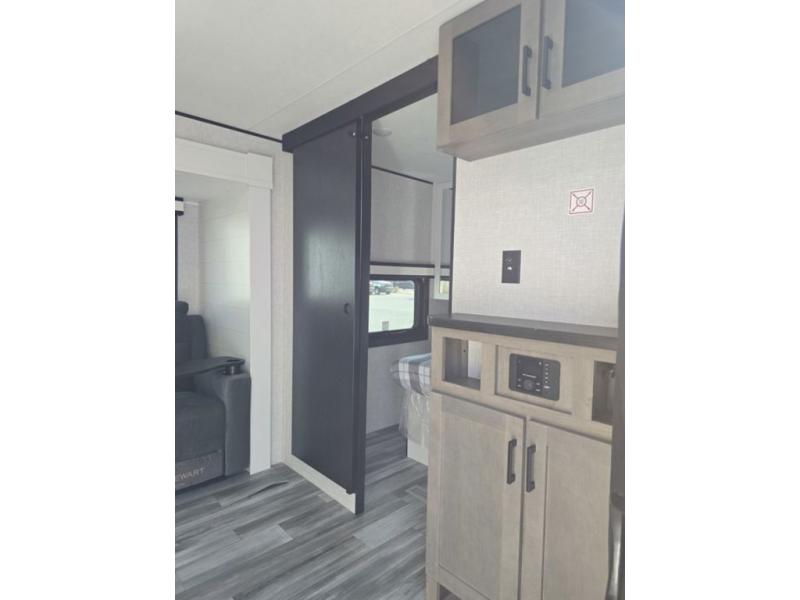 With two private bedrooms, everyone will have a comfortable place to sleep in this travel trailer! The front private bedroom has a 60" x 75" queen bed with wardrobes on either side and the rear private bedroom has a 60" x 80" queen bed slide with a dresser, a wardrobe, one of the exit/entrance doors, and an entrance into the walk-through bathroom which has a radius shower for everyone to stay squeaky clean. The patio doors not only make it easy to enter and exit the unit, but also bring in tons of natural lighting. After you have prepared a delicious home cooked meal, you can can head to the U-shaped dinette to enjoy it there comfortably then relax on the Jack-knife sofa across from the entertainment center!