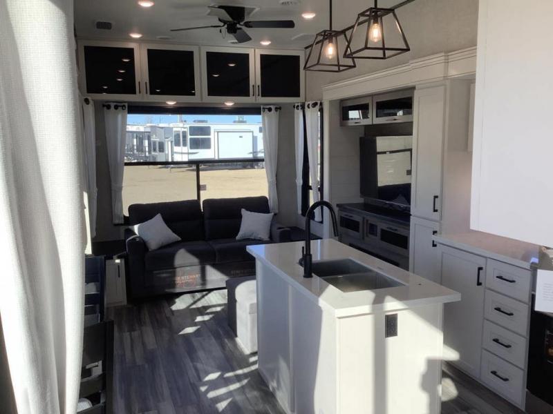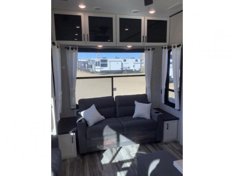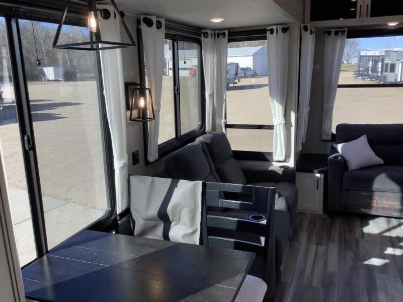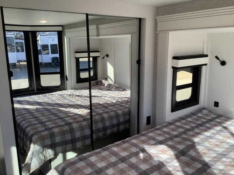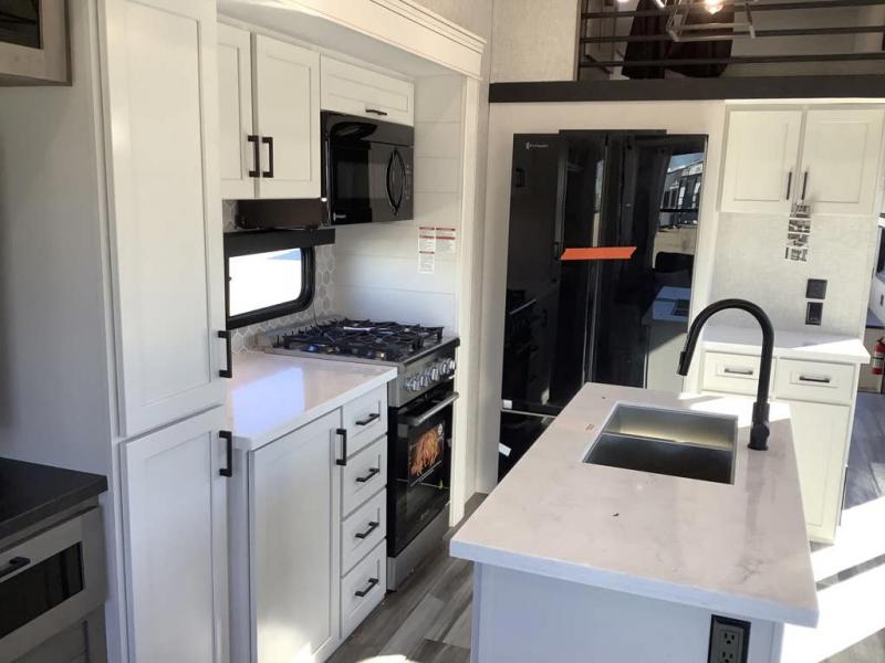Wherever you choose you camp, you'll be camping in comfort with this travel trailer. There are dual opposing slides in the main living area, allowing everyone space to stretch out, and the cook will love having more space at the kitchen island. After dinner is cleaned up you can relax on the theater seat across from the TV and fireplace, or you can play a game at the free-standing table and chairs. The little ones are sure to head up to the double loft area to play or rest. Here, you'll find three bunk mats, two wardrobes, and shelves for plenty of storage space. The front private bedroom incudes a cozy queen bed, plus a dresser, wardrobe, and storage cabinets for all your belongings. You can even choose the king bed option in place of the queen bed if you want more space to stretch out!