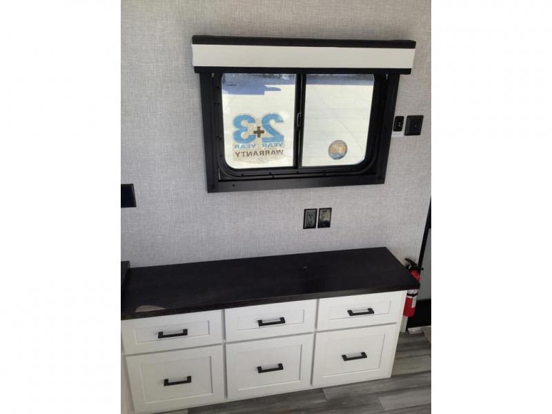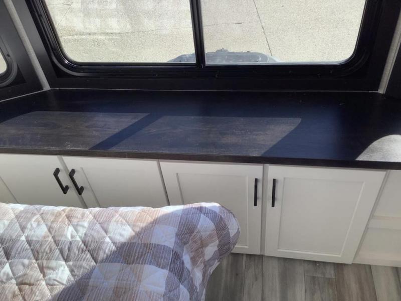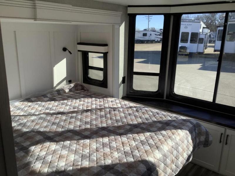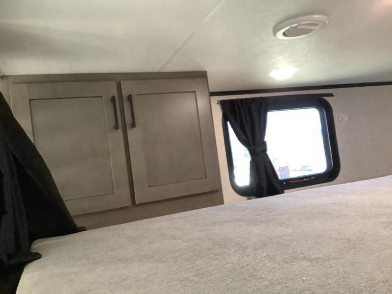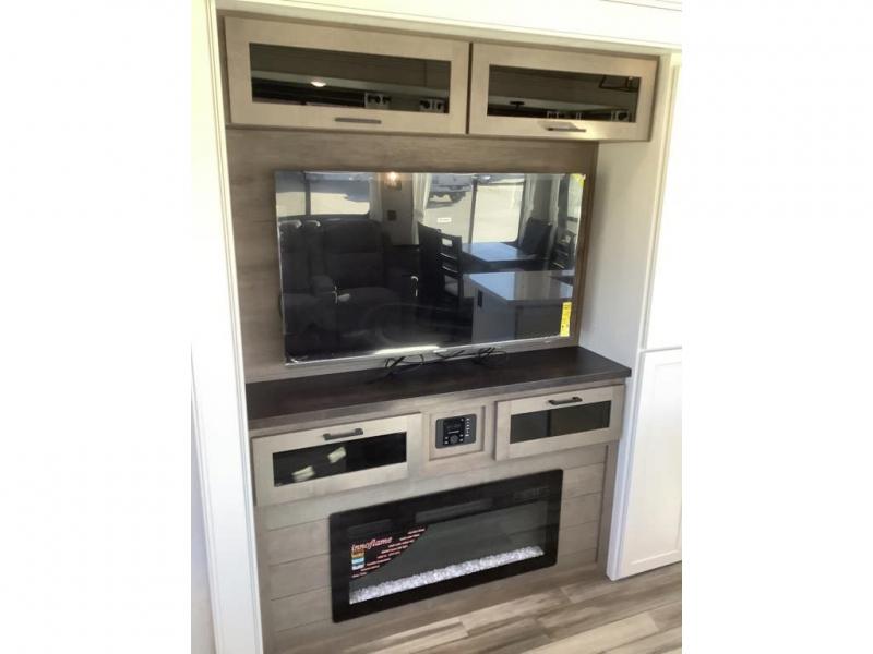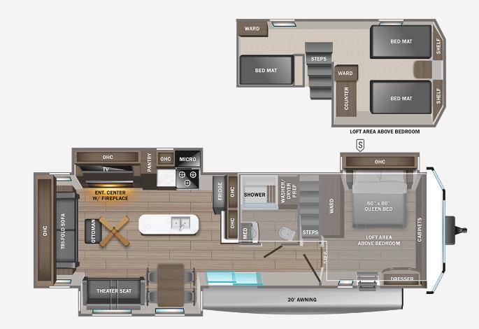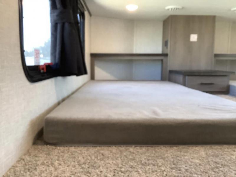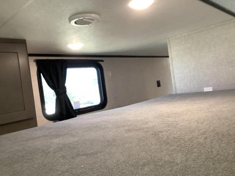 Wherever you choose you camp, you'll be camping in comfort with this travel trailer. There are dual opposing slides in the main living area, allowing everyone space to stretch out, and the cook will love having more space at the kitchen island. After dinner is cleaned up you can relax on the theater seat across from the TV and fireplace, or you can play a game at the free-standing table and chairs. The little ones are sure to head up to the double loft area to play or rest. Here, you'll find three bunk mats, two wardrobes, and shelves for plenty of storage space. The front private bedroom incudes a cozy queen bed, plus a dresser, wardrobe, and storage cabinets for all your belongings. You can even choose the king bed option in place of the queen bed if you want more space to stretch out!