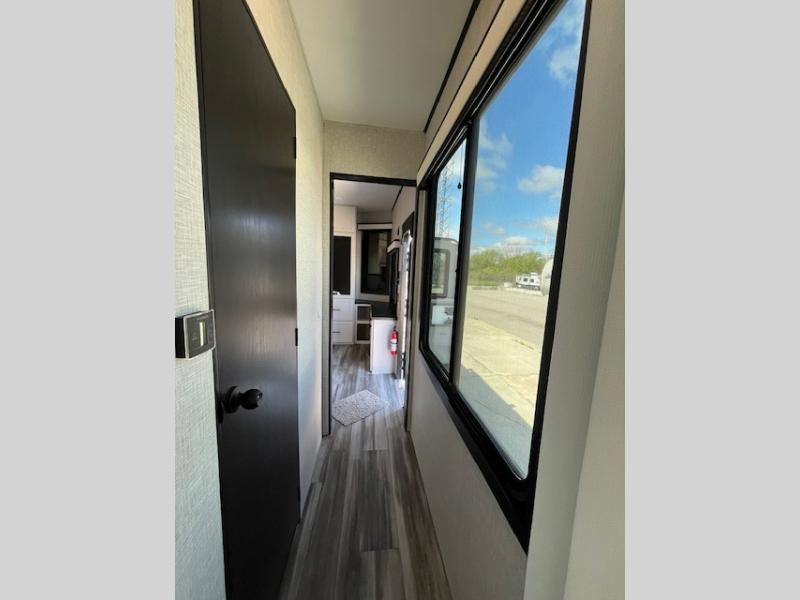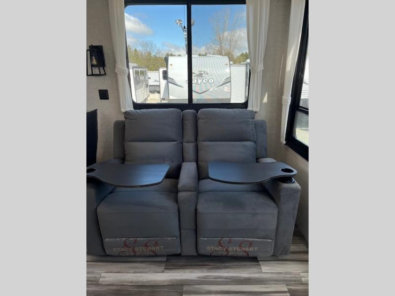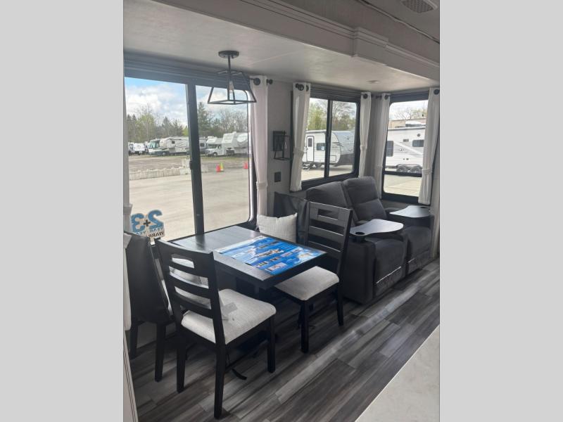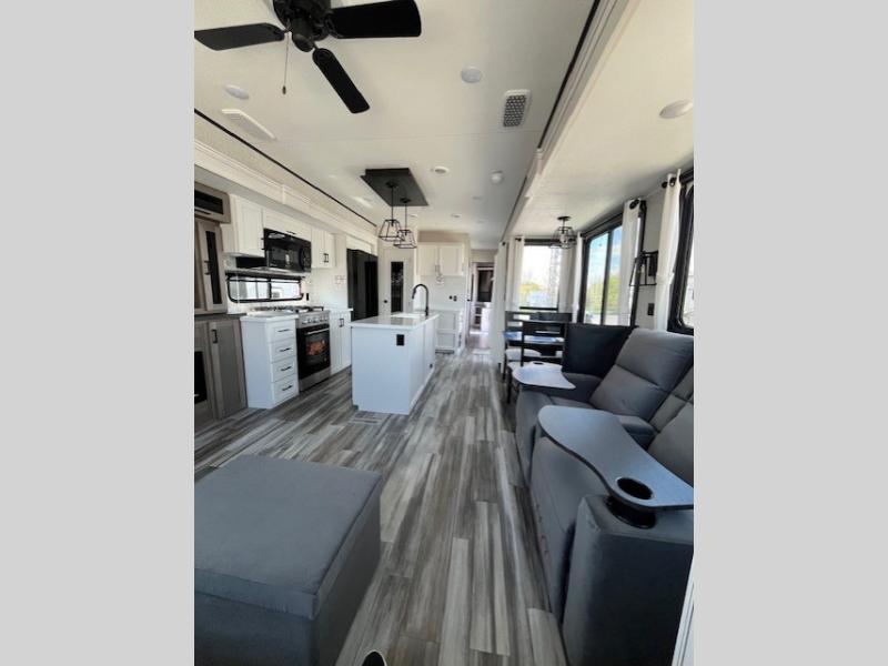 Extended stays are made easy in this travel trailer for four. You will love having your own bedroom up front with a queen bed slide, a wardrobe, plus two chests for your things, and your guests can sleep on the tri-fold sofa in the rear living area. A ceiling fan will keep the air moving while the chef makes eggs and bacon in the morning, and you all can dine at the free-standing table with chairs. Spend your day outdoors hiking, biking, or swimming, and the full bath will allow you to clean up after your adventures. You may want to make it a movie night since there is an entertainment center with a TV, or you can just relax by the fireplace and visit!