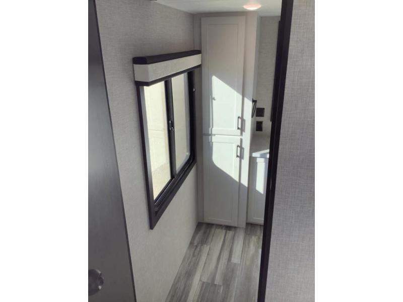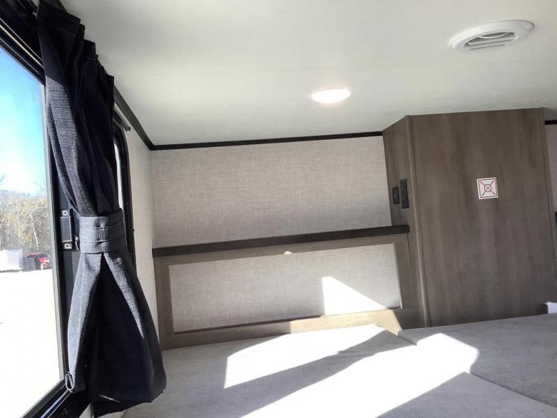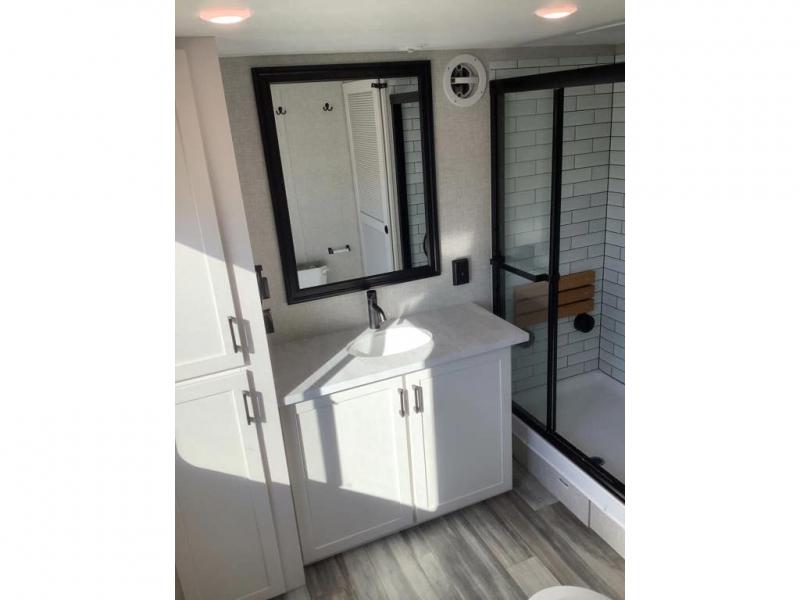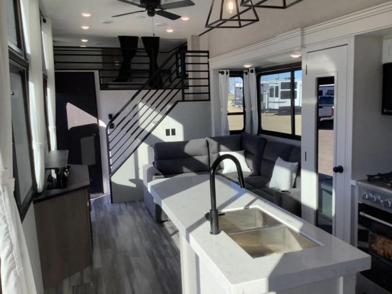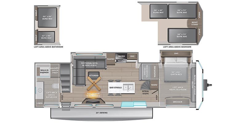 Travel in comfort with your family. You will love having your own bedroom up front with a queen bed, a bench with storage below, plus a dresser and over head cabinet for your things. This unit comes with more space for everyone to sleep for instance the loft area, which has multiple bunk mats where three people can easily fit, or the sectional sofa with hide-a-bed situated in the living room, ideal for two. Also in the living area, you will be able to enjoy the entertainment center, plus, a ceiling fan will keep the air moving while the chef cooks delicious meals in the morning, and you all can dine at the kitchen island which includes bar stools. The Kitchen is also fitted with a residential fridge, microwave, four cooktop burner, sink and pantry perfect to cook with luxury and comfort. Finally, take a bath in the full rear bathroom.