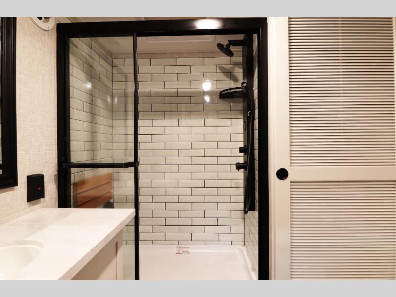 Optional Residential Plumbing, dual-pane safety glass, fiberglass sidewalls, slideout awnings, king bed upgrade.